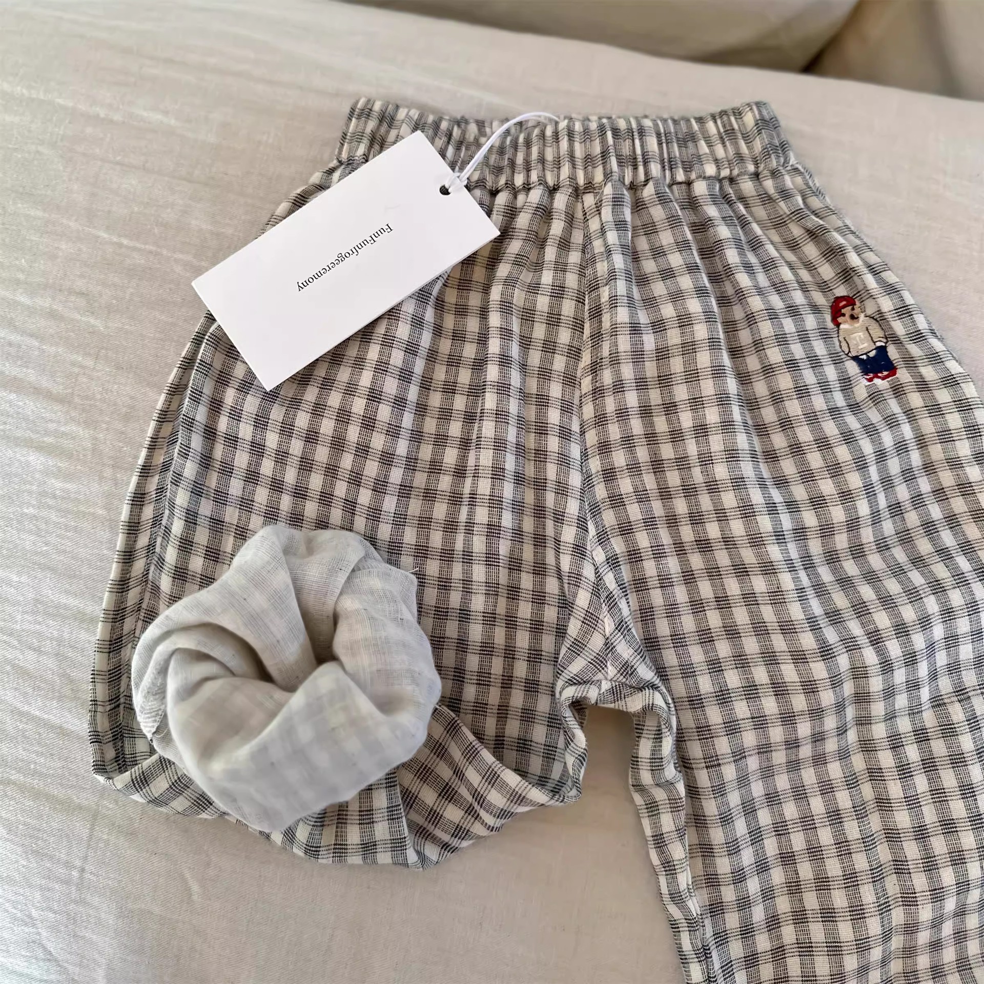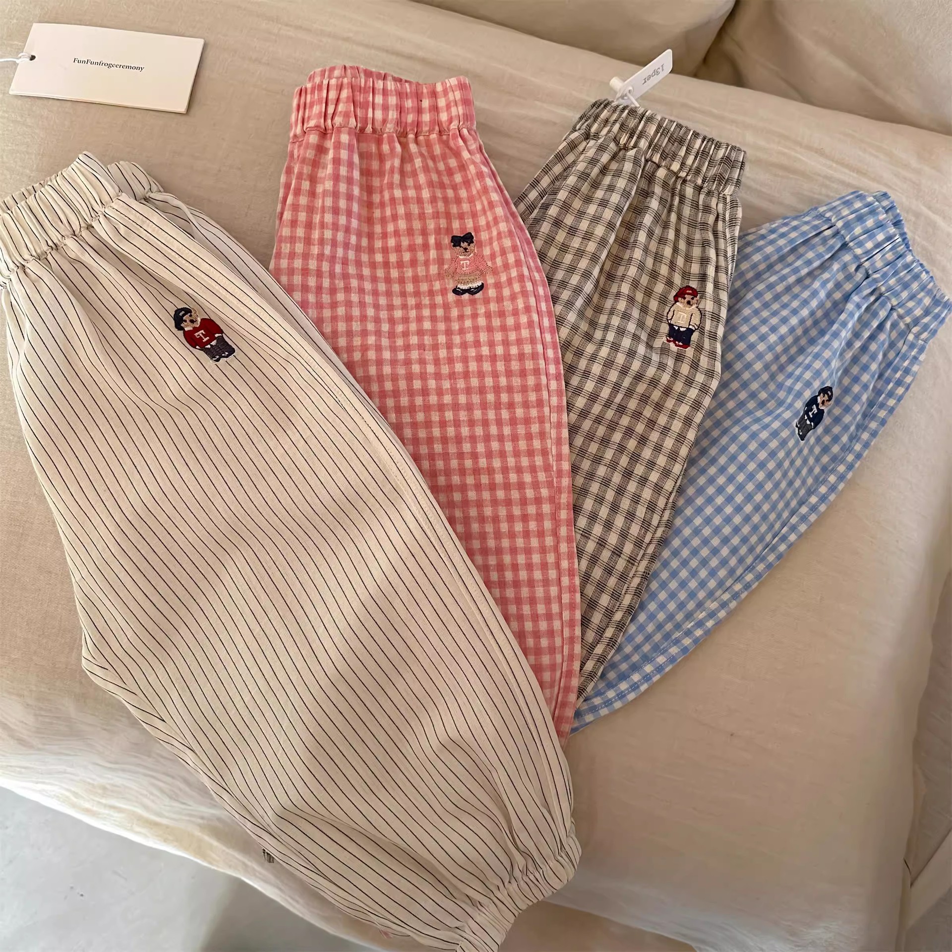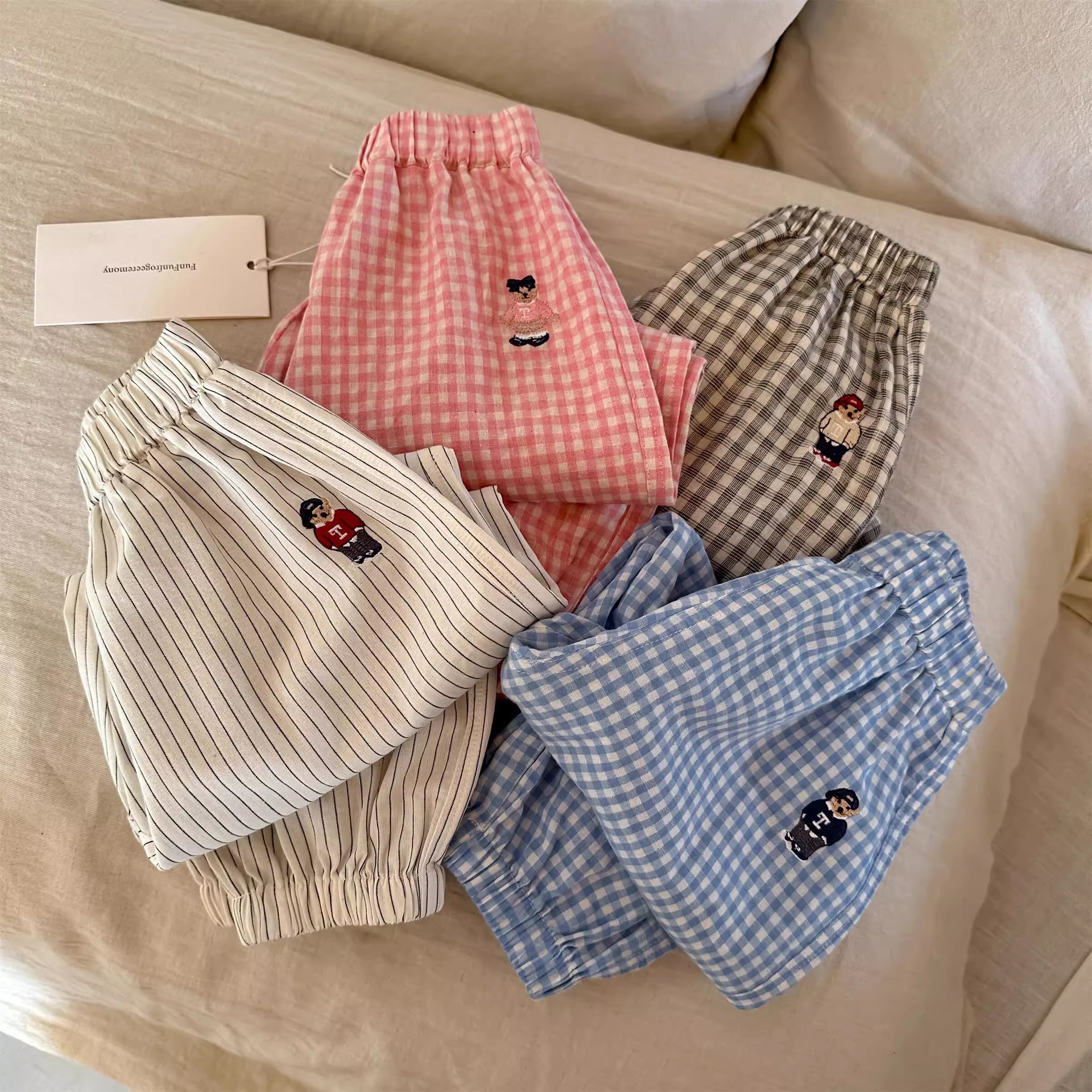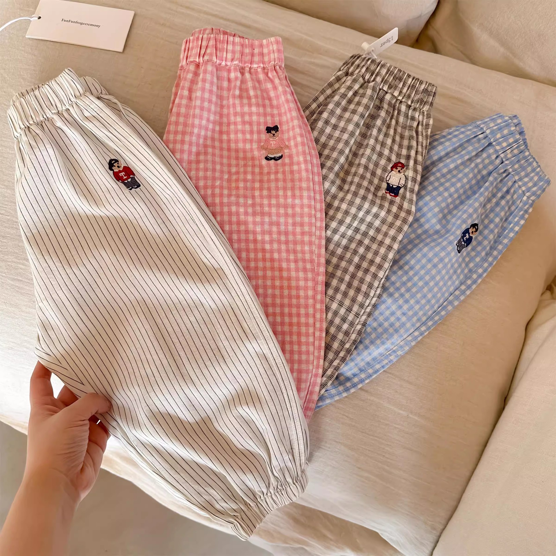 어린이 모기 방지 바지 2025 여름 소년 소녀를위한 일본 패션 격자 무늬 캐주얼 바지