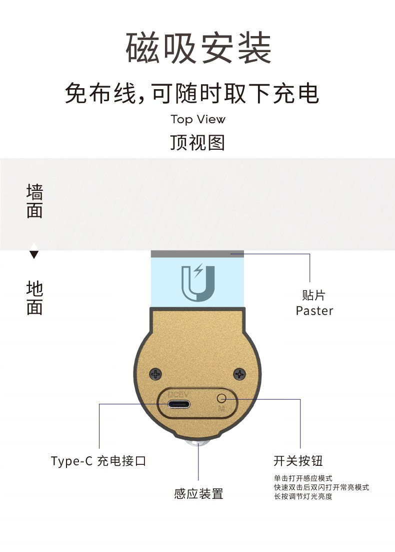 문 센서 조명, 인체 LED, 사람이 오면 켜짐, 배선 없음, 펀칭 없음, 도어 조명, 무선 자기 충전식 벽 조명