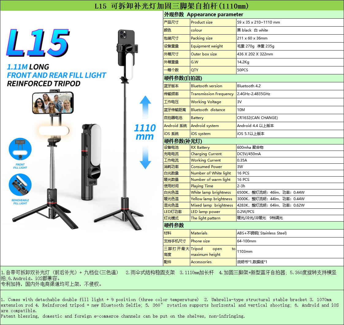 L15 휴대폰 셀카봉, 탈착식 보조광, 블루투스 원격 제어, 휴대폰 셀카 뷰티 라이브 사진 삼각대