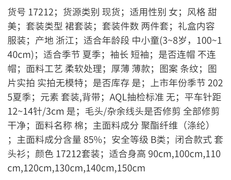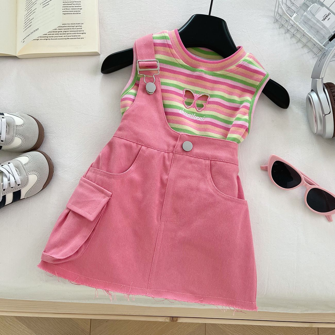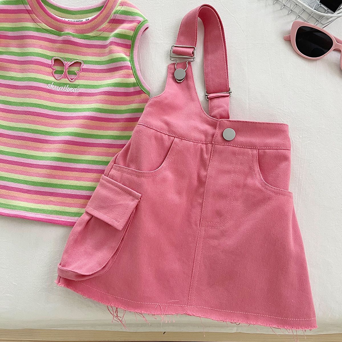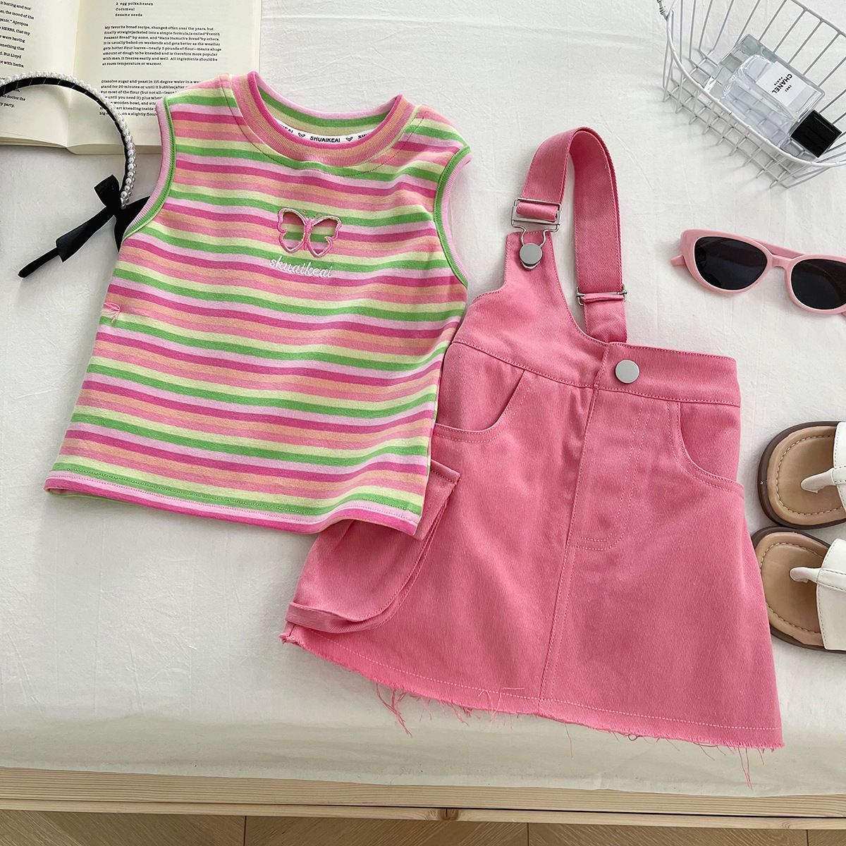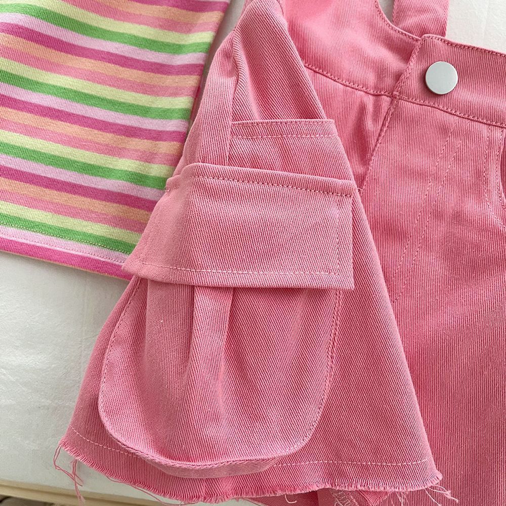 새로운 도착 2025 여름 소녀 한국 줄무늬 티셔츠 데님 세트 소녀 달콤한 스타일 멜빵 투피스 트렌디