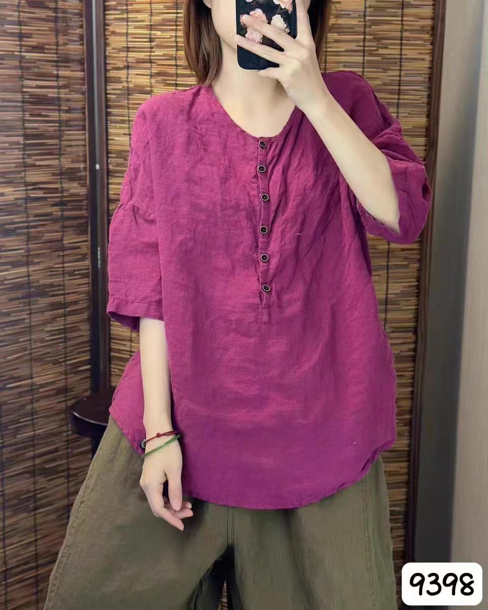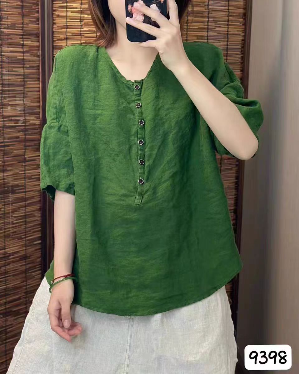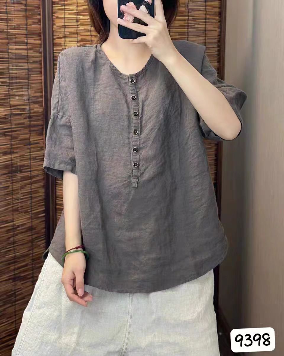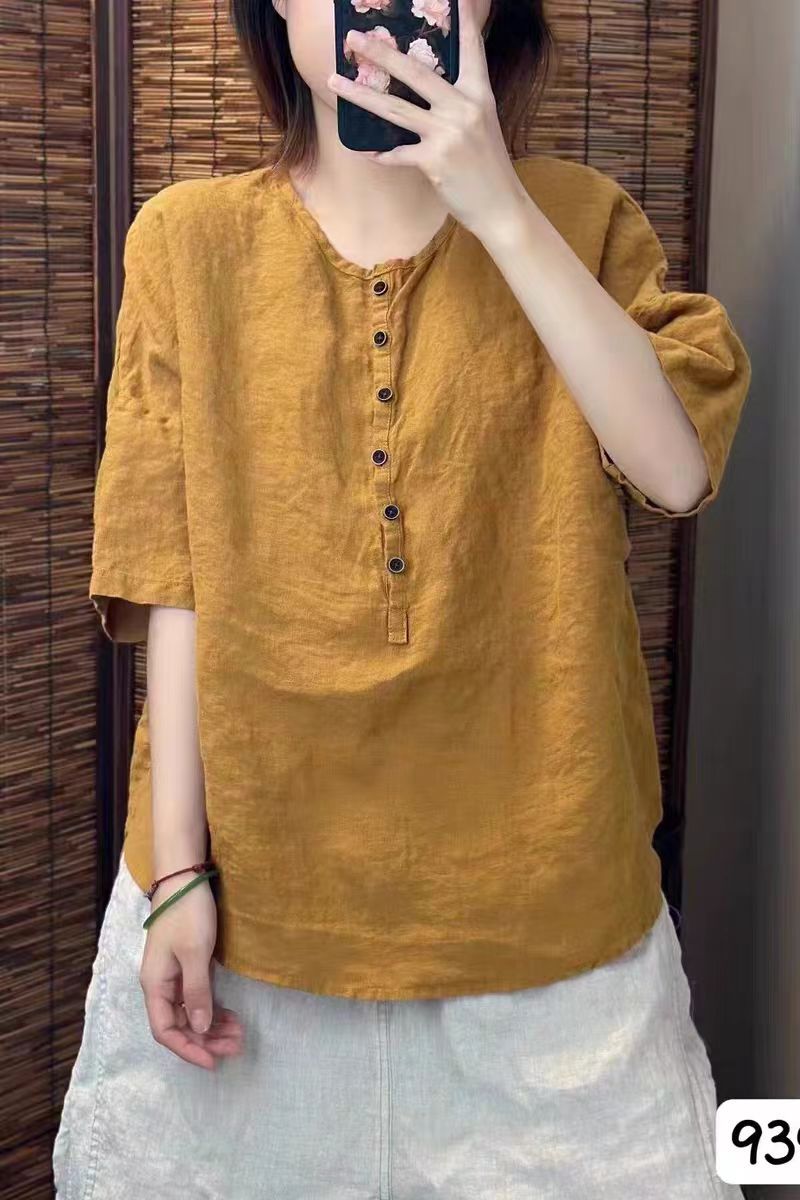 2025 봄 뉴 리넨 하프 슬리브 셔츠 여성용 루즈 슬리밍 레트로 홍콩 스타일 풀오버 셔츠 탑