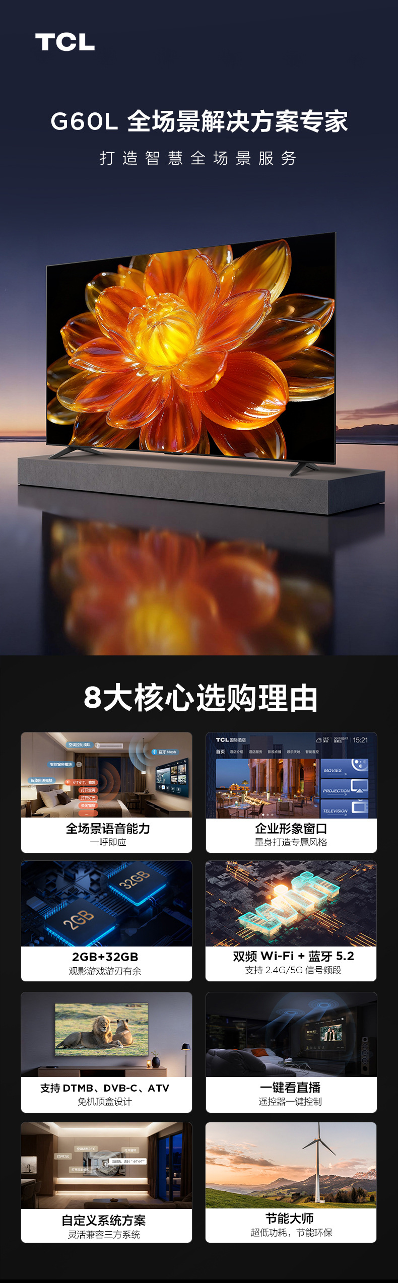 TCL TV 75inch 시동 시 눈 보호 기술, 지연 없음, 그림자 없는 4K 디스플레이, 듀얼 WIFI, 에너지 절약 마스터
