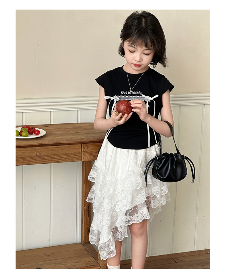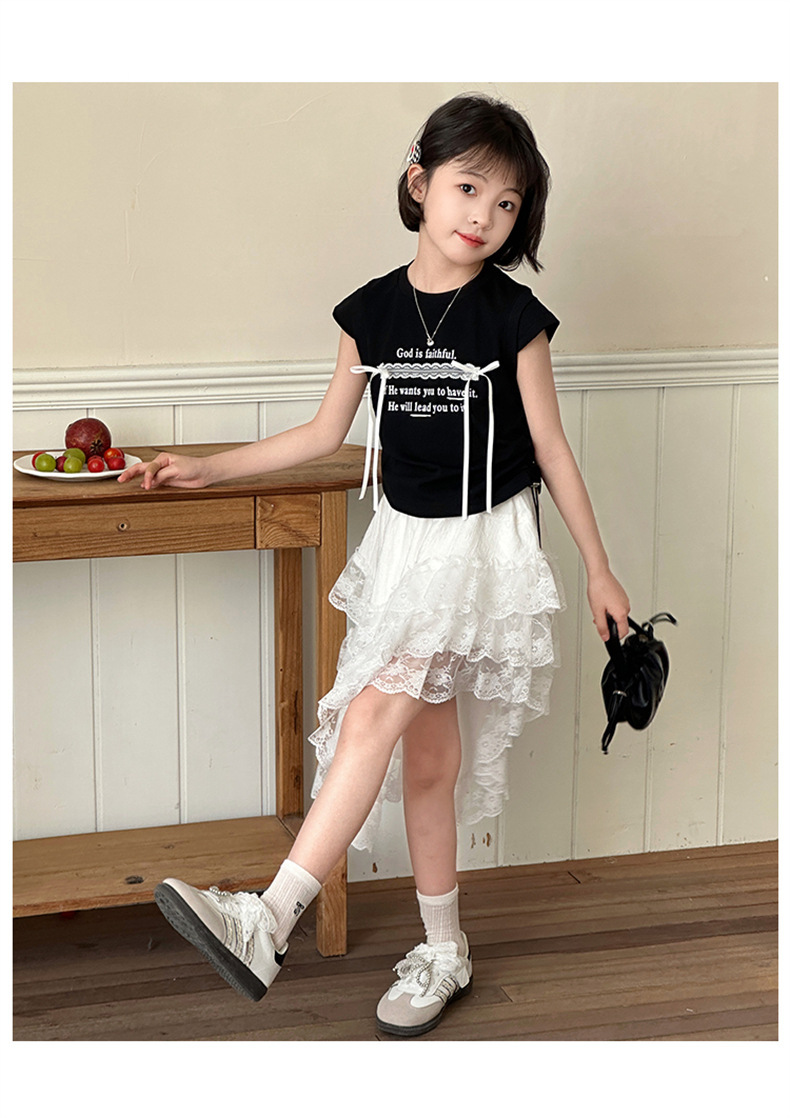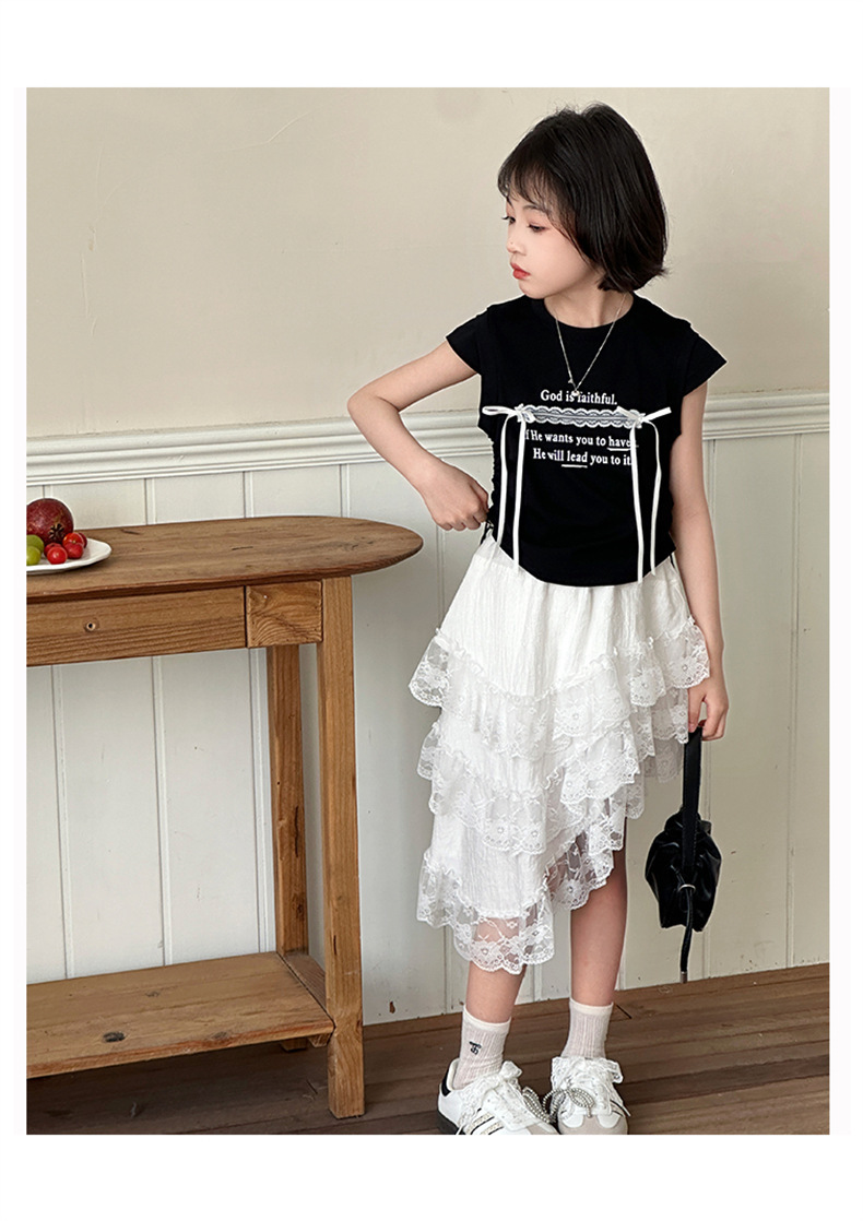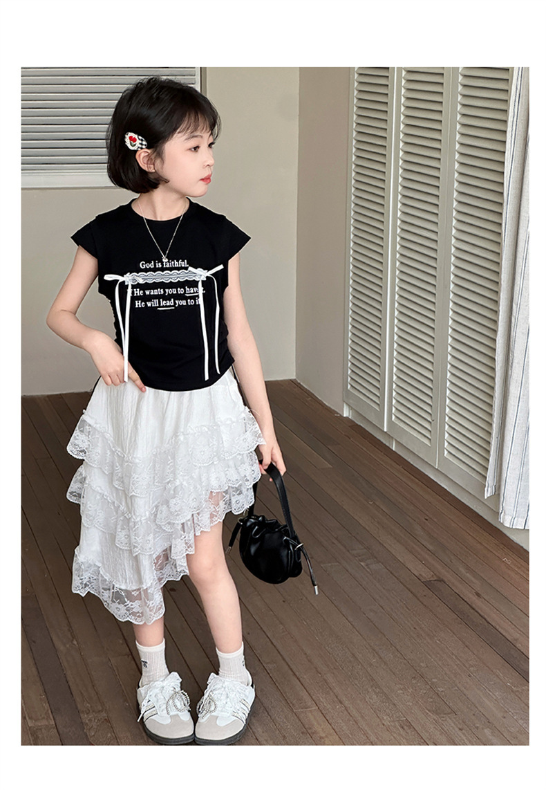 불규칙한 티셔츠 큰 아이들 여름 세트 활 짧은 소매 메쉬 새로운 여자 레이스 케이크 스커트 2025