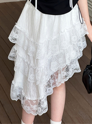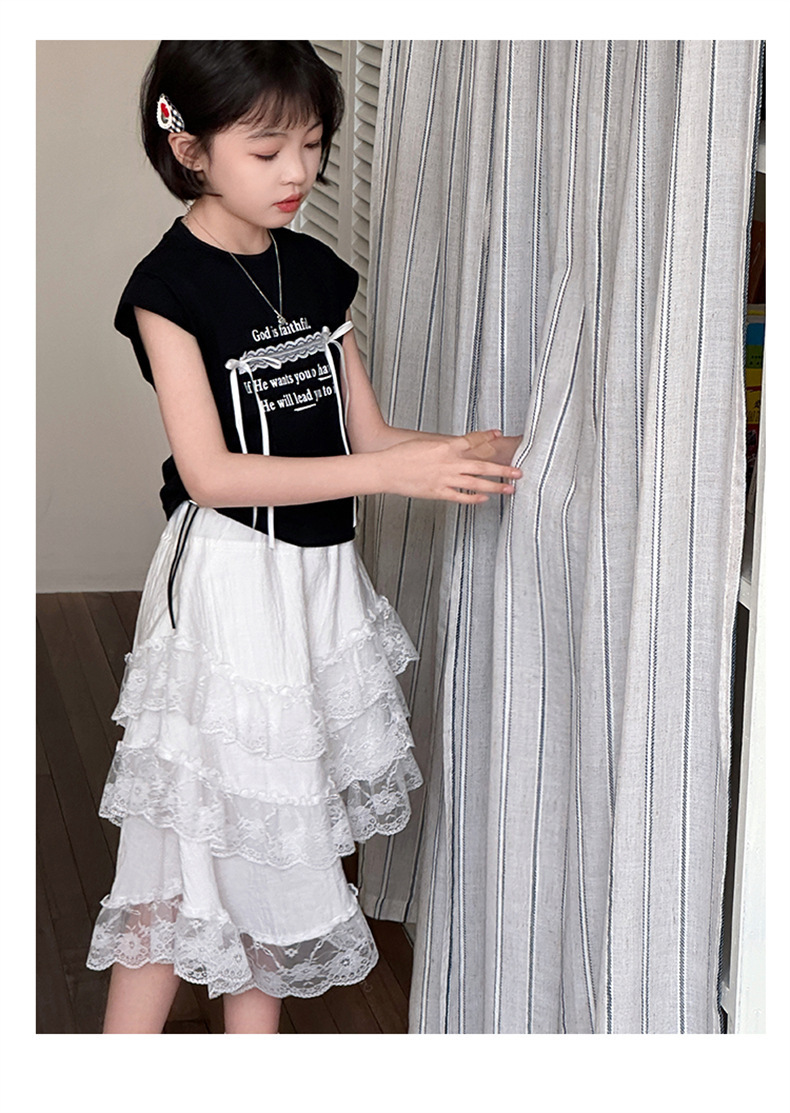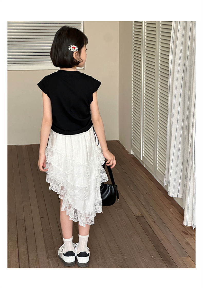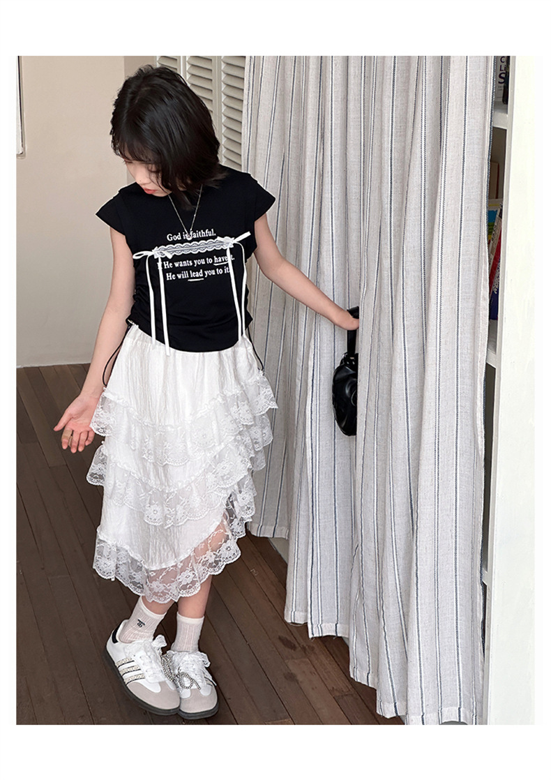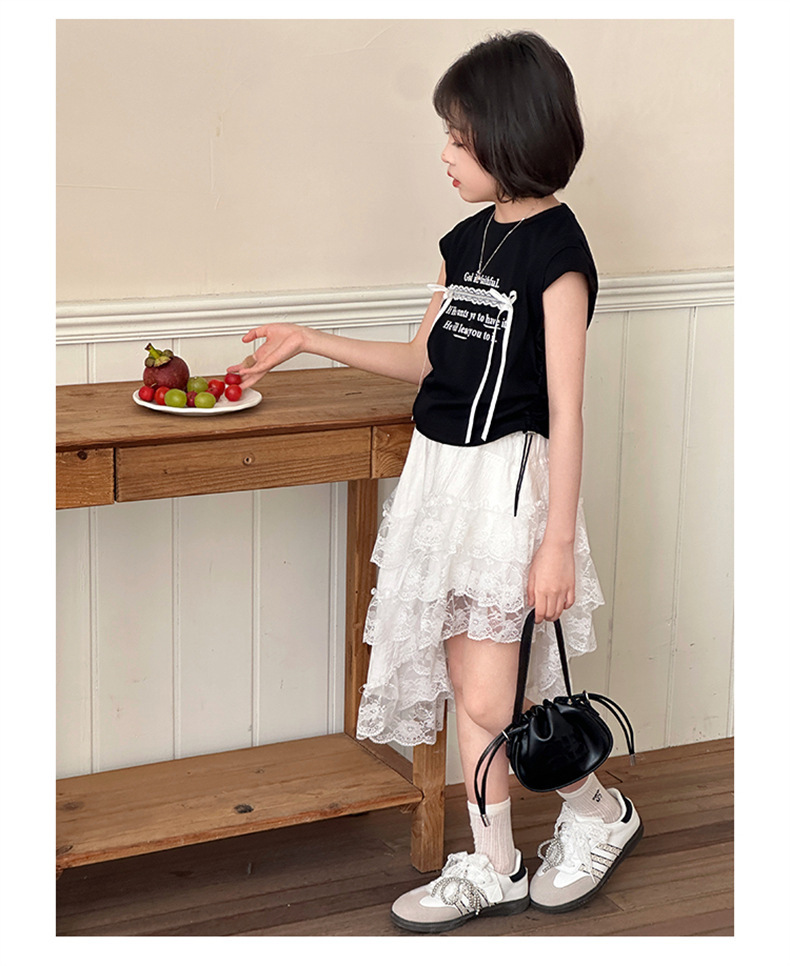불규칙한 티셔츠 큰 아이들 여름 세트 활 짧은 소매 메쉬 새로운 여자 레이스 케이크 스커트 2025
