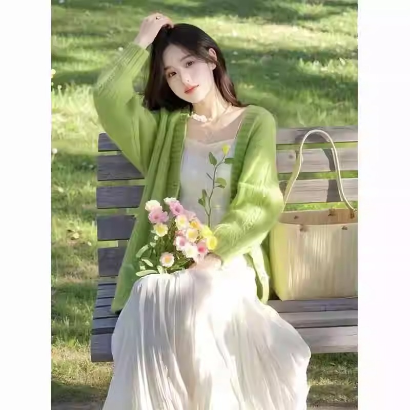 봄과 가을 패션 여성 부드러운 스타일 작은 남성 슬리밍 니트 카디건 올 매치 슬링 원피스 투피스 세트