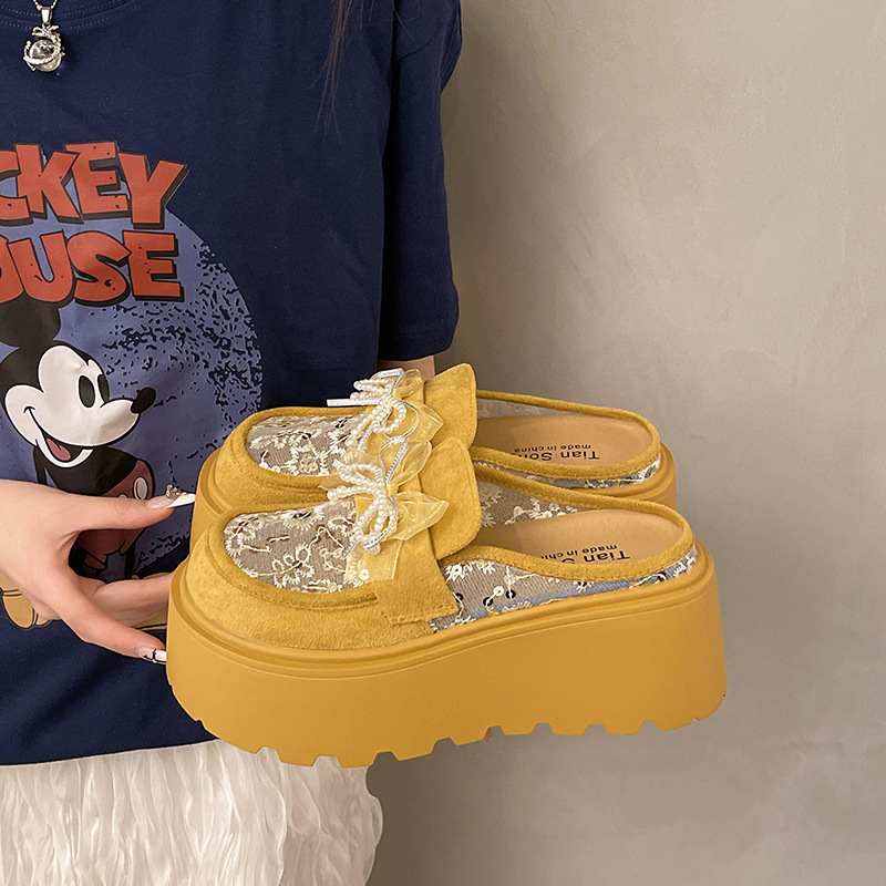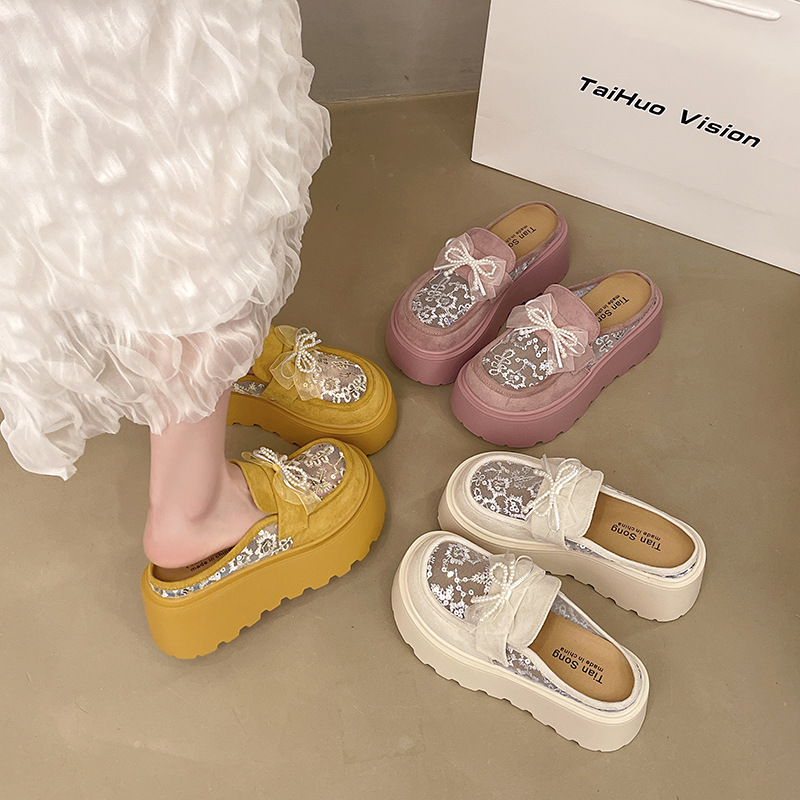 여성용 바오터우 하프 슬리퍼, 메쉬 보우, 진주 아우터, 작은 가죽 신발, 2025 봄 여름 신상 두꺼운 밑창 슬립온스토어 가기