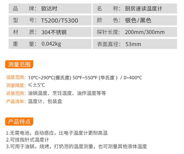 [오다시] 기름 온도를 측정하는 액체 온도계, 상업용 긴 다리 프로브, 튀김기, 베이킹 주방 특수스토어 가기