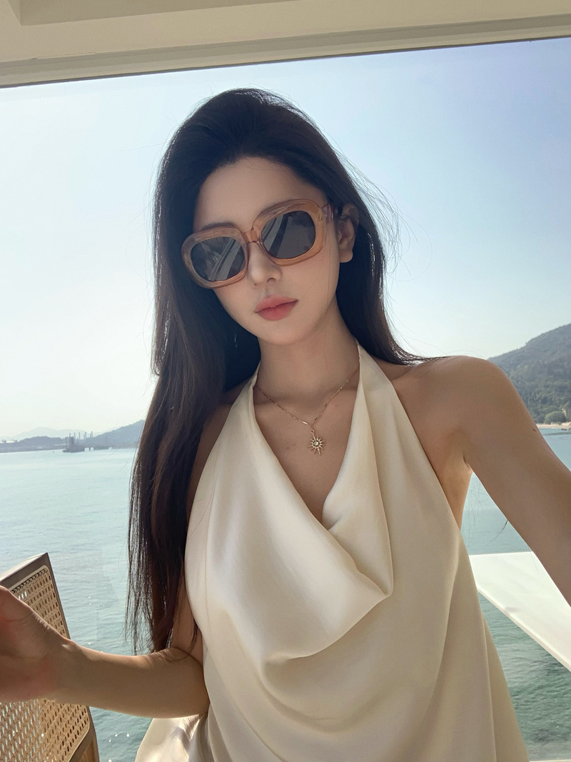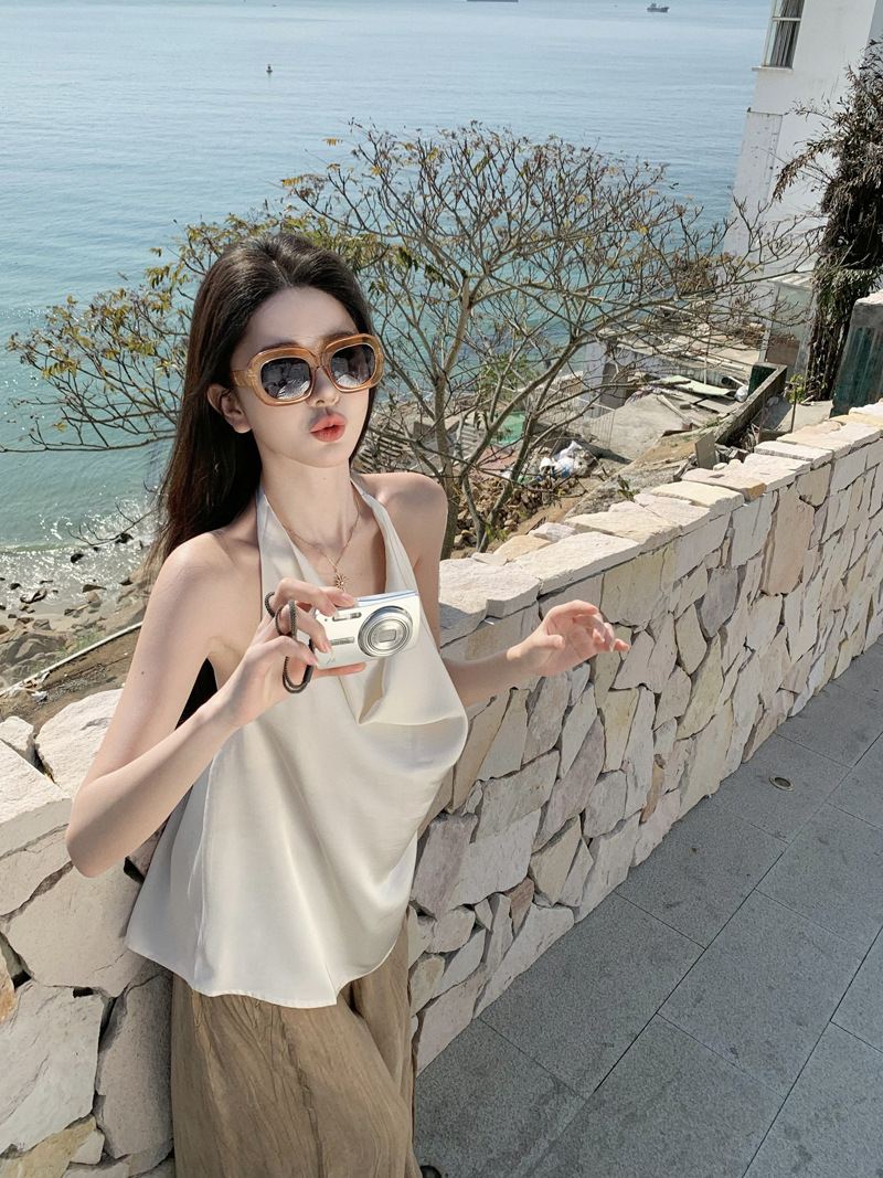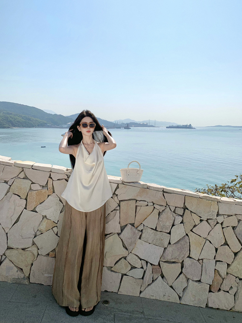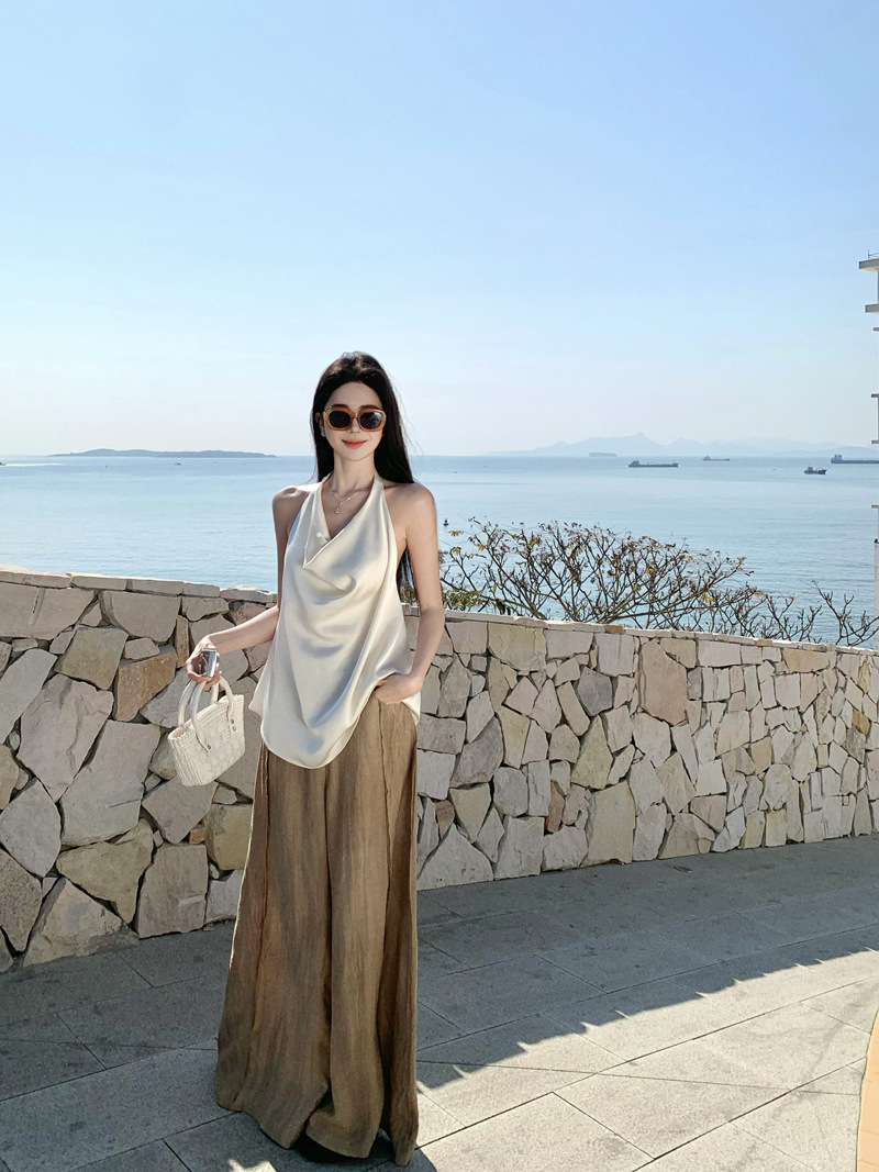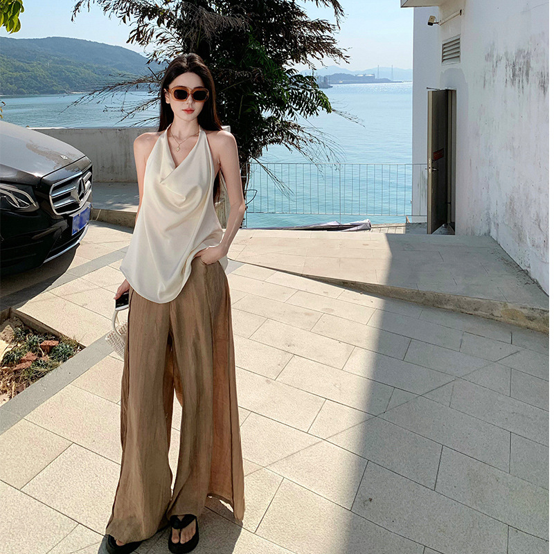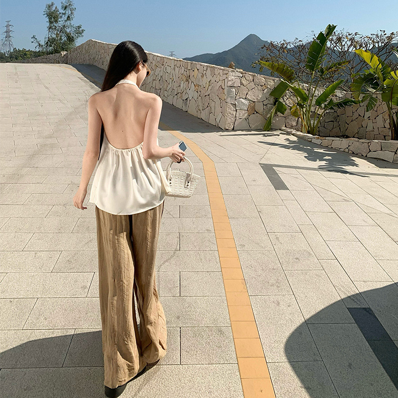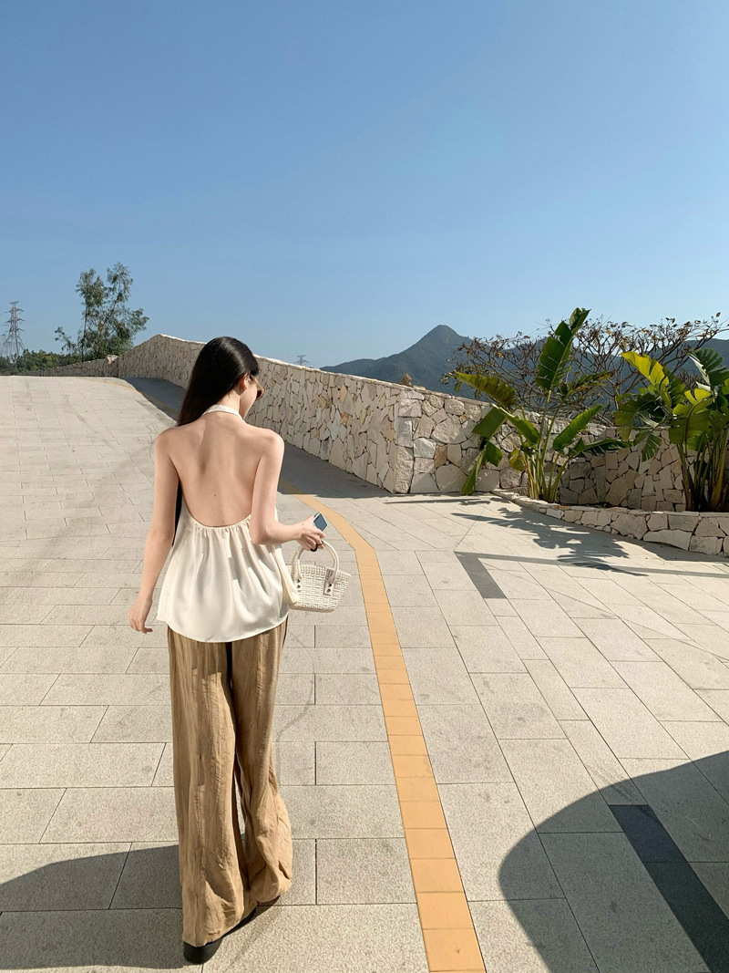 올드 Qian Feng 게으른 휴식 휴가 착용 여성 여름 목 백리스 탑 하이 허리 와이드 다리 바지 투피스 세트