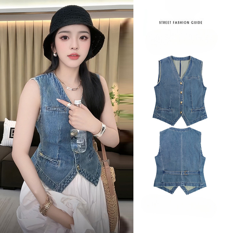 여자 데님 조끼 여름 디자인 레트로 아우터웨어 올 매치 민소매 조끼 V 넥 스택 탑스토어 가기