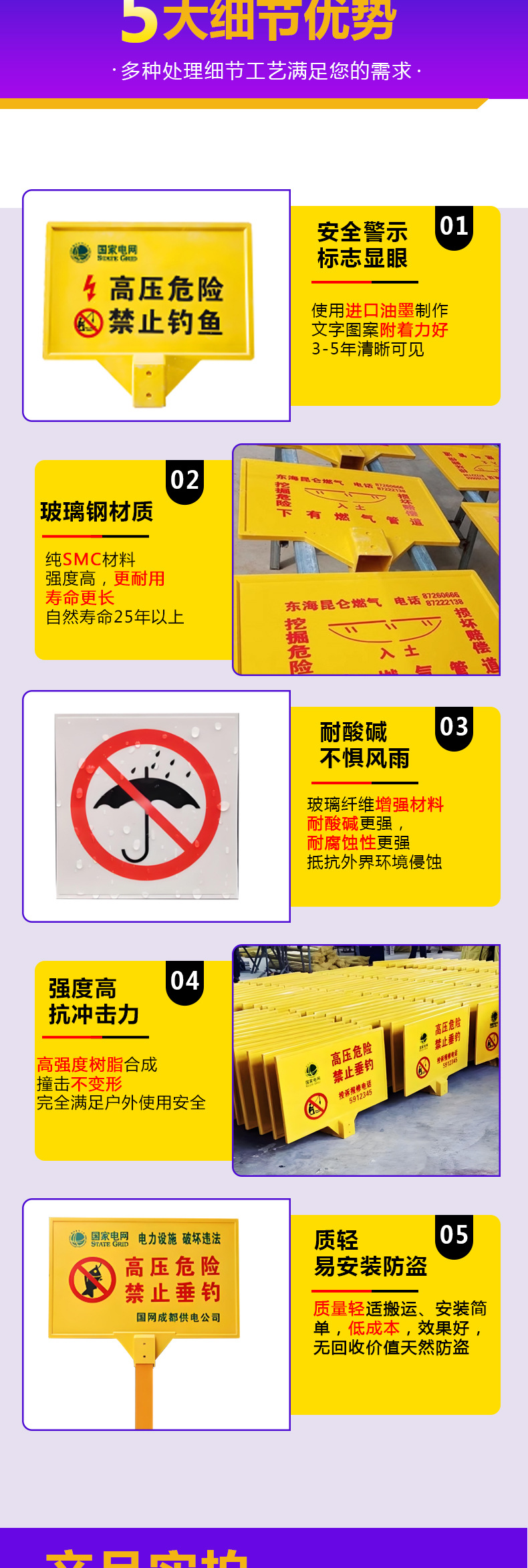유리섬유 경고 표지판, 케이블 표지판, 단일 및 이중 기둥 표지판, 지하 보호 반사 표지판