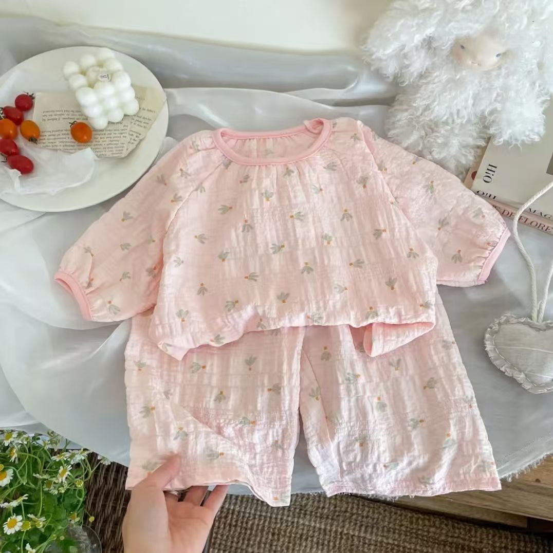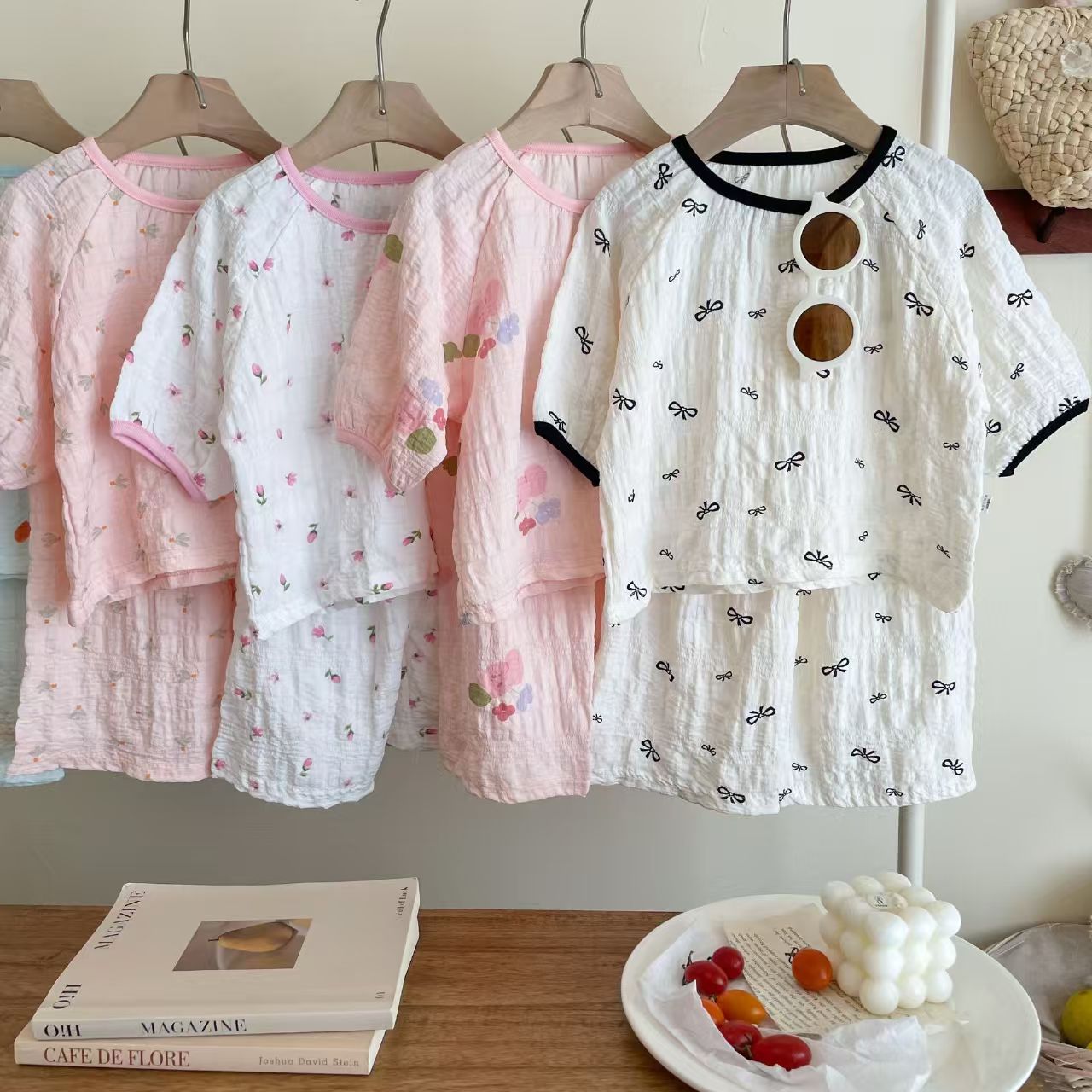 소년과 소녀를위한 어린이 잠옷 2025 봄과 여름 더블 레이어 거즈 가정 의류 만화 느슨한 아기 에어컨 속옷 세트