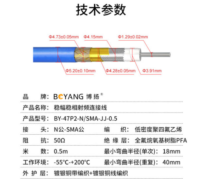 博扬 N-SMA公18G稳幅稳相射频线50欧0.3米 微波同轴电缆 高频测试跳线镀银高温线BY-47P2-N/SMA-JJ-0.3