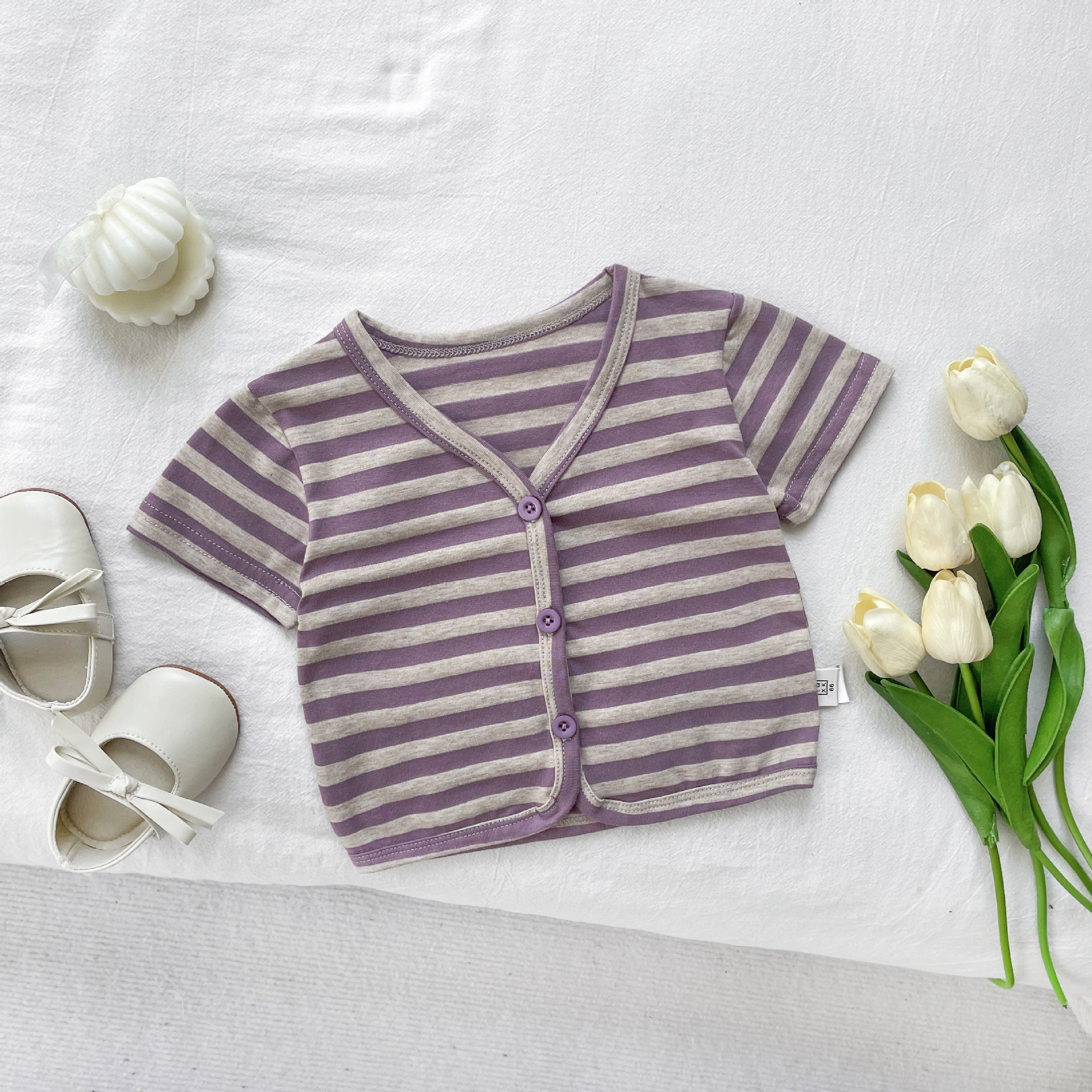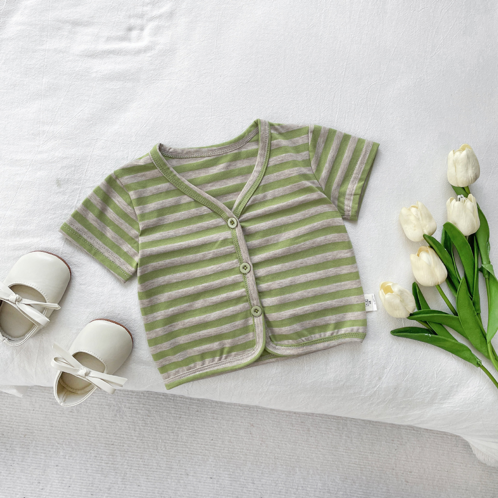 아기 태양 보호 의류 작은 달 나이 여름 옷 2024 새로운 여름 아기 얇은 줄무늬 카디건 에어컨 의류스토어 가기