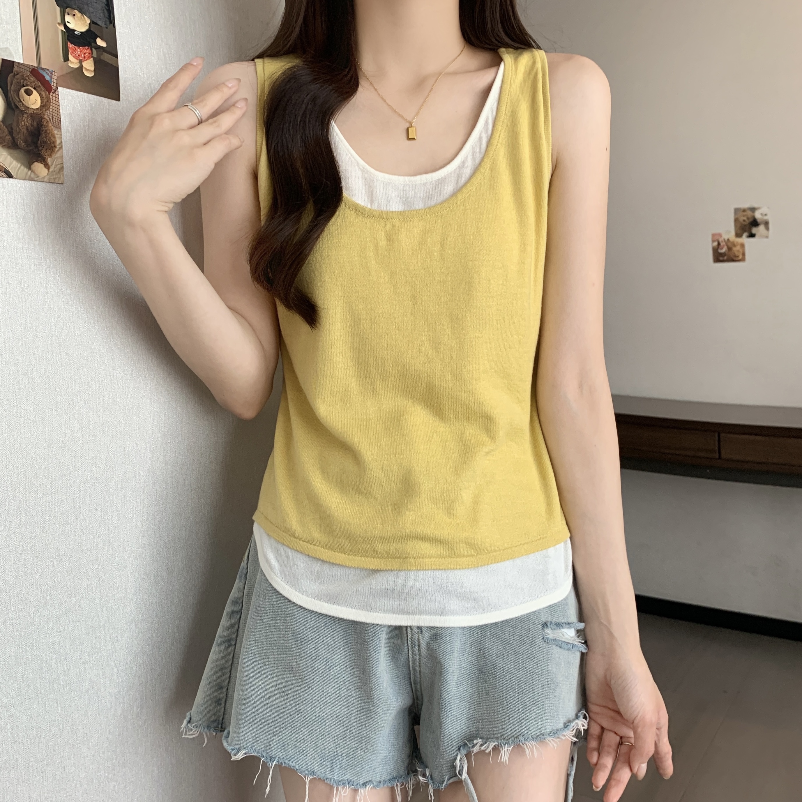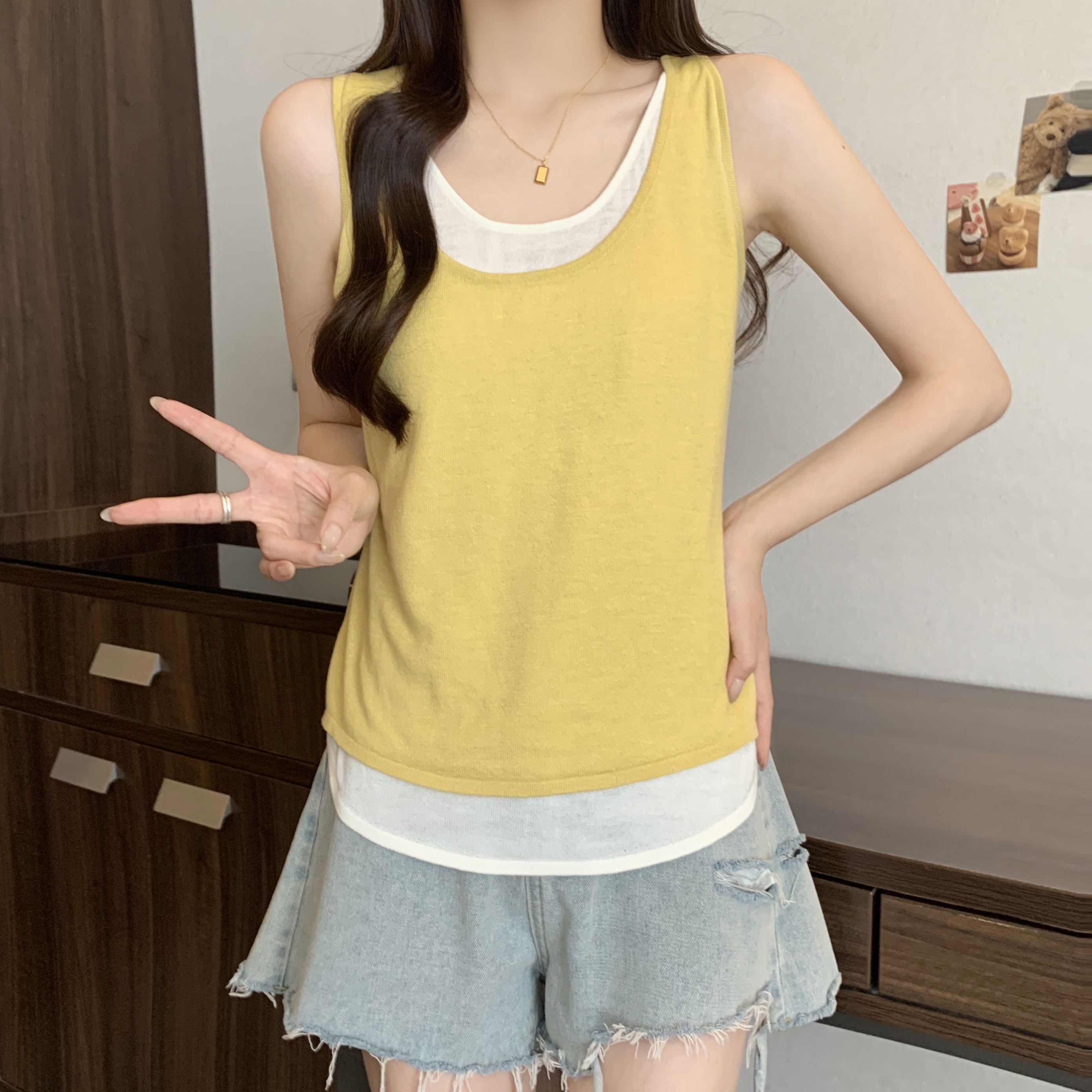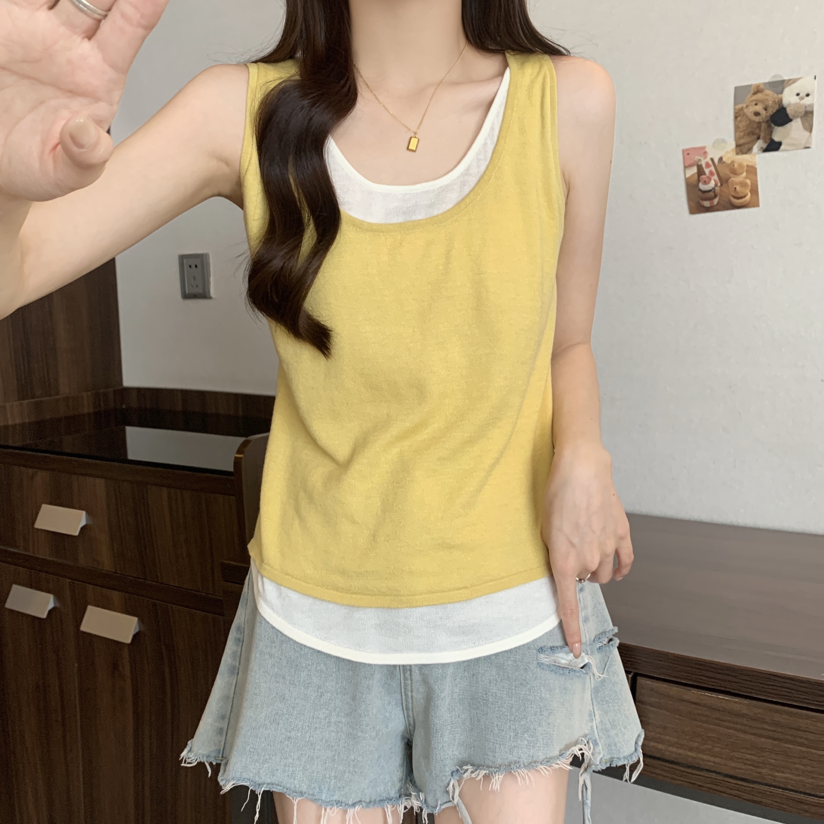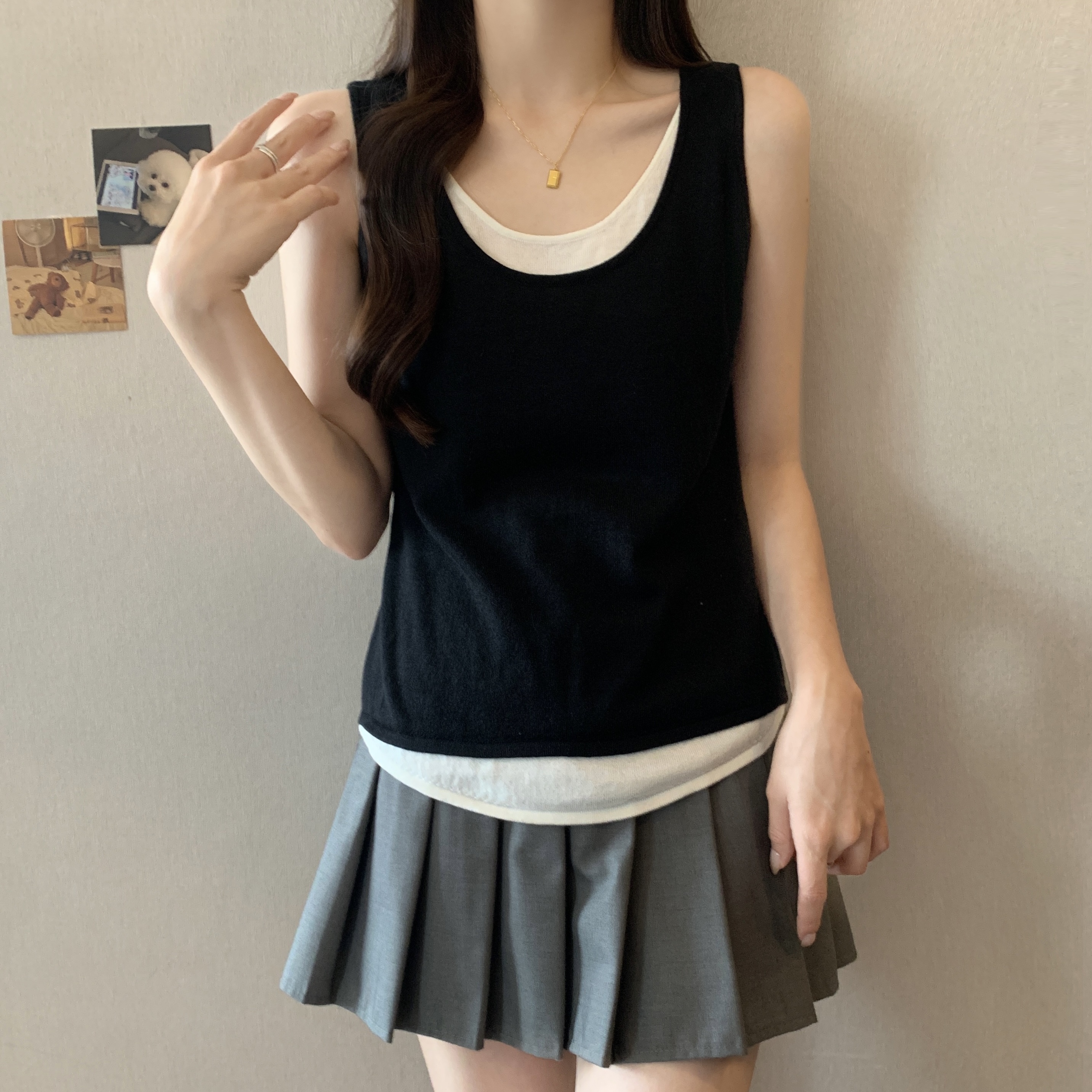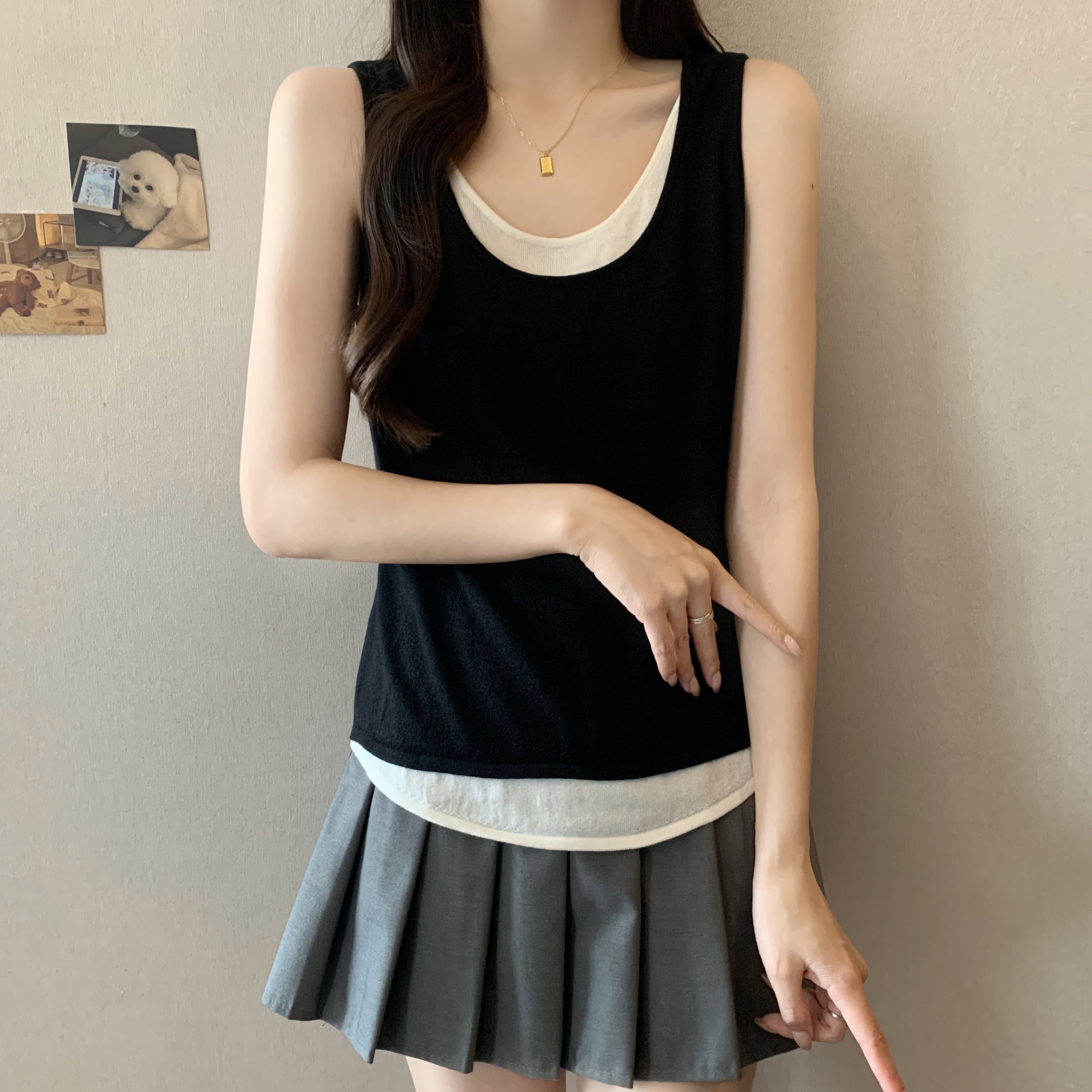 한국 스타일 디자인 센스 니트 가짜 투피스 I 자형 조끼 여성 여름 2025 새로운 민소매 외부 착용 프랑스 아름다운 탑스토어 가기