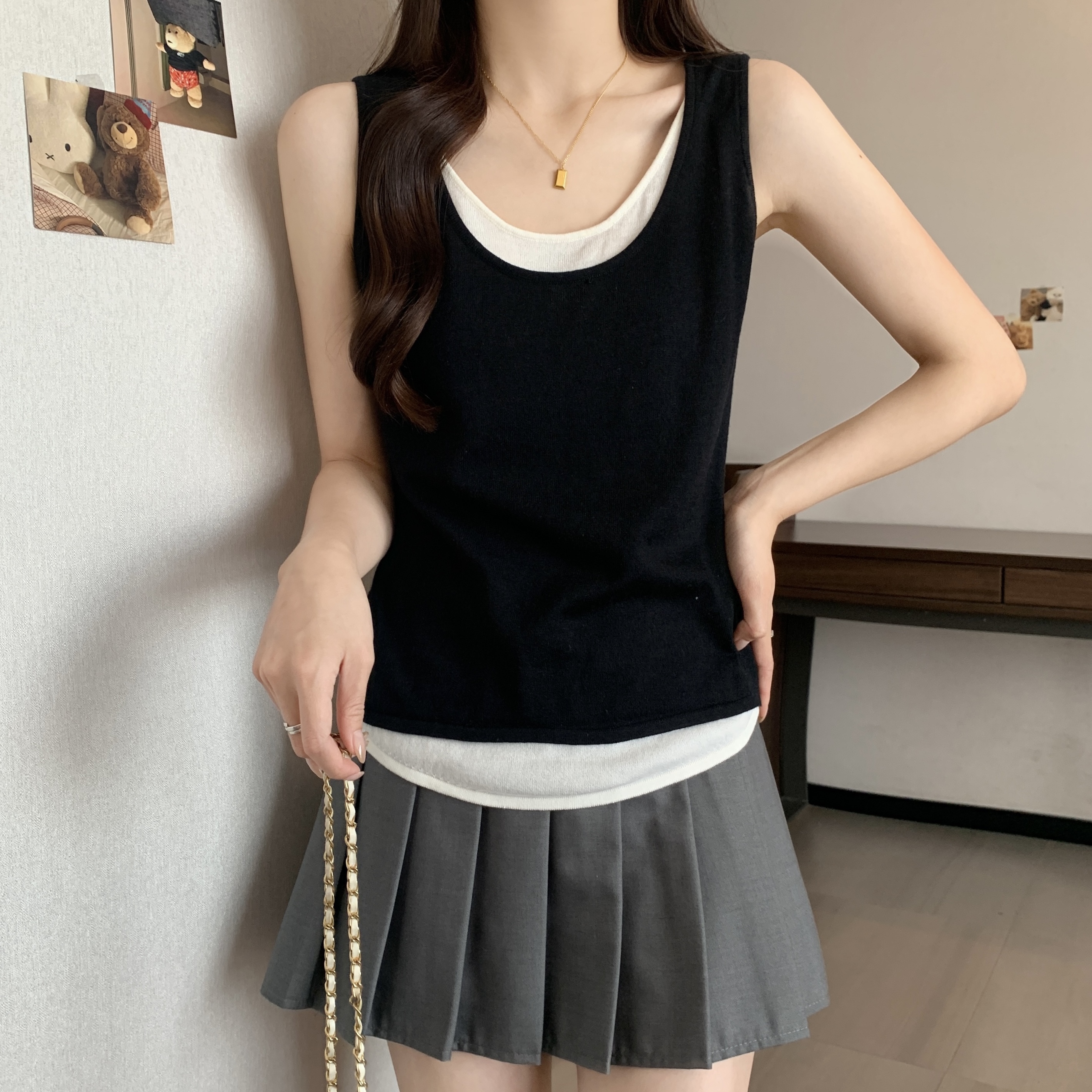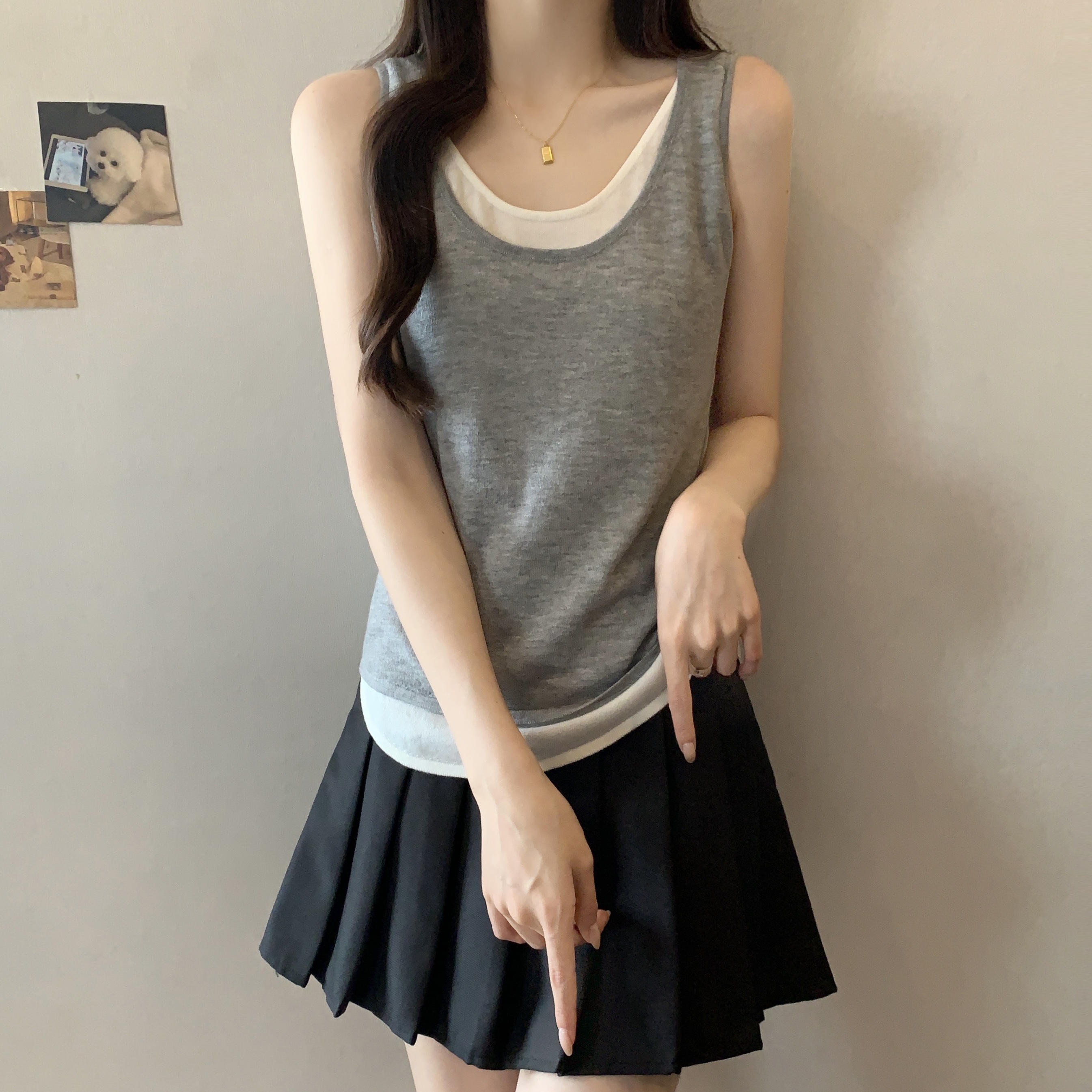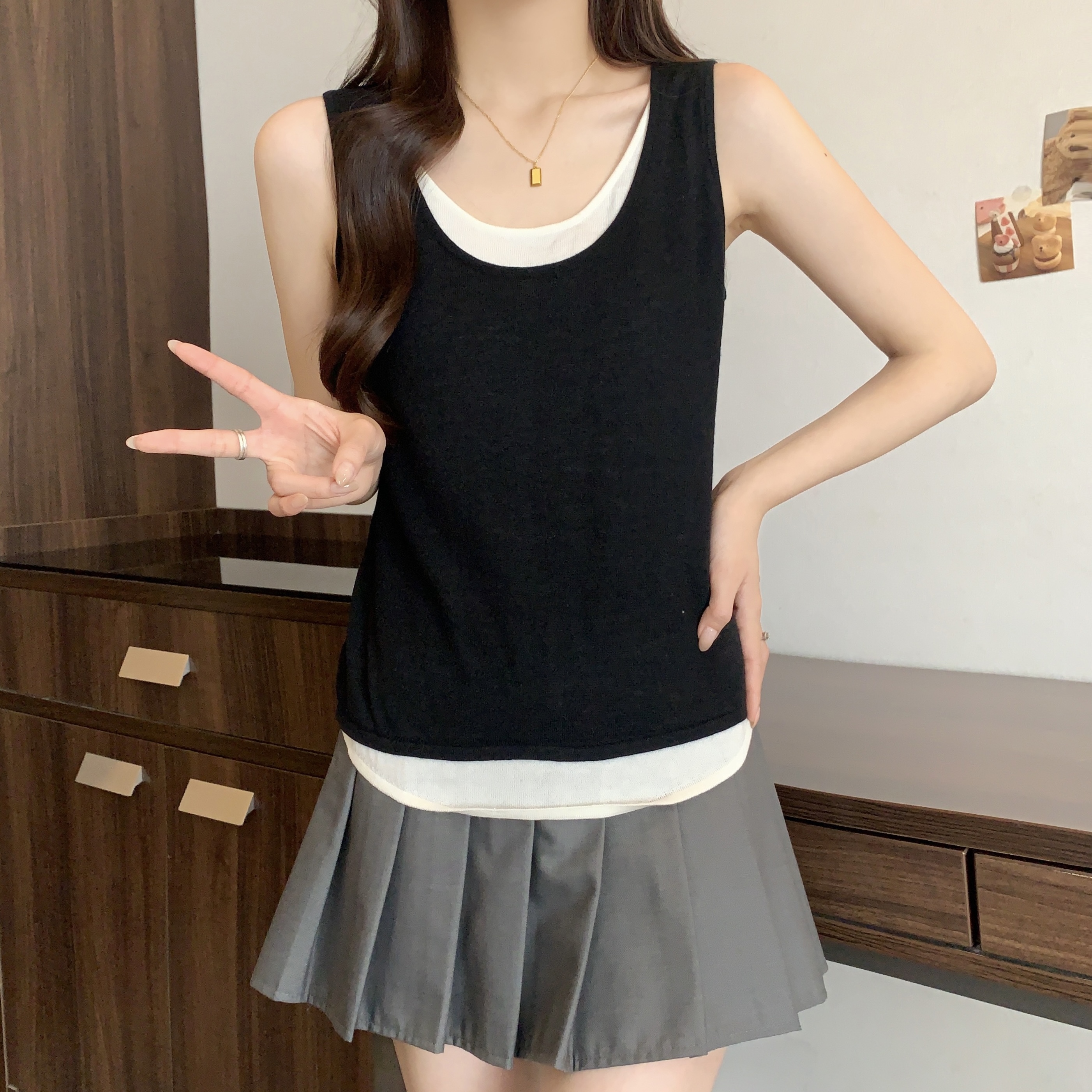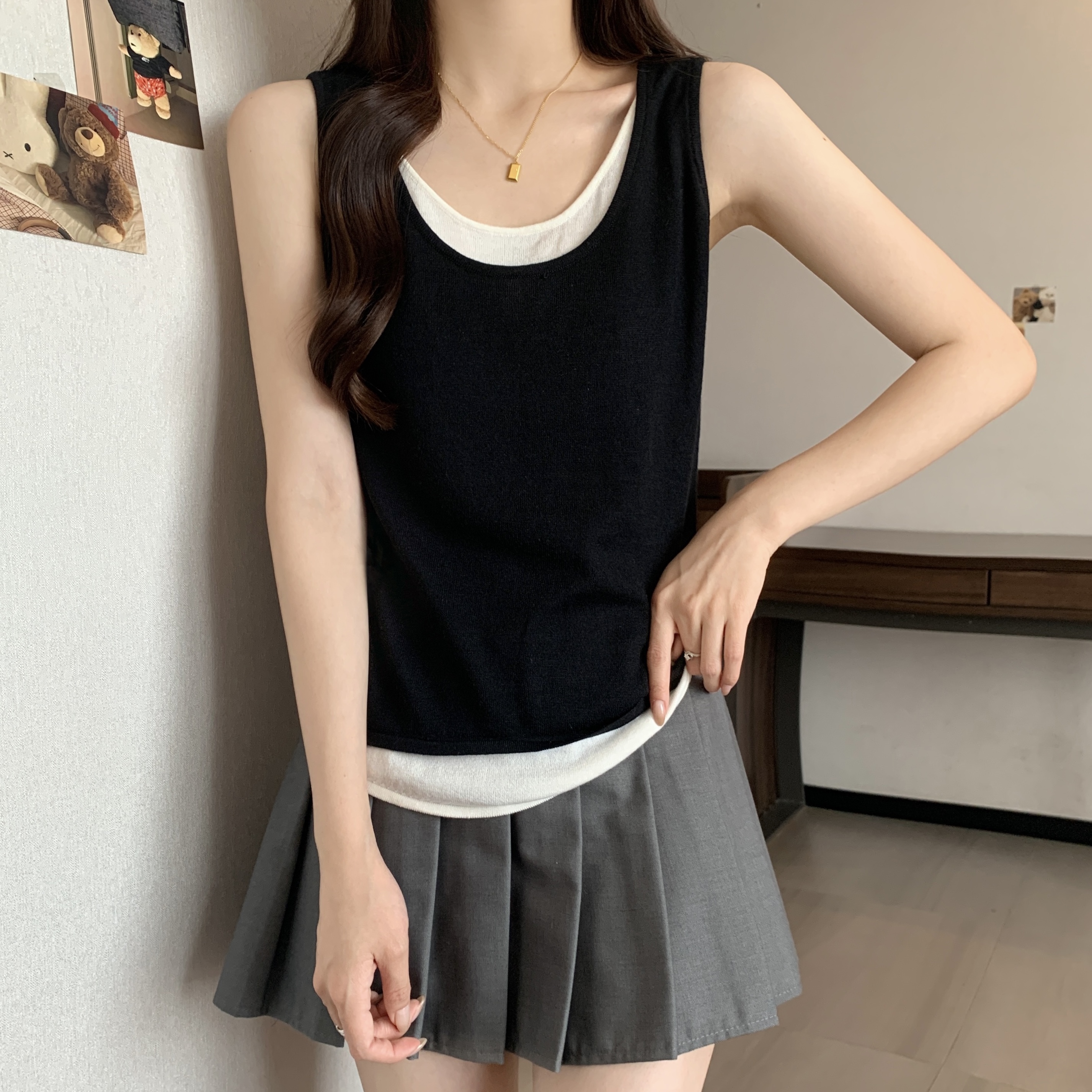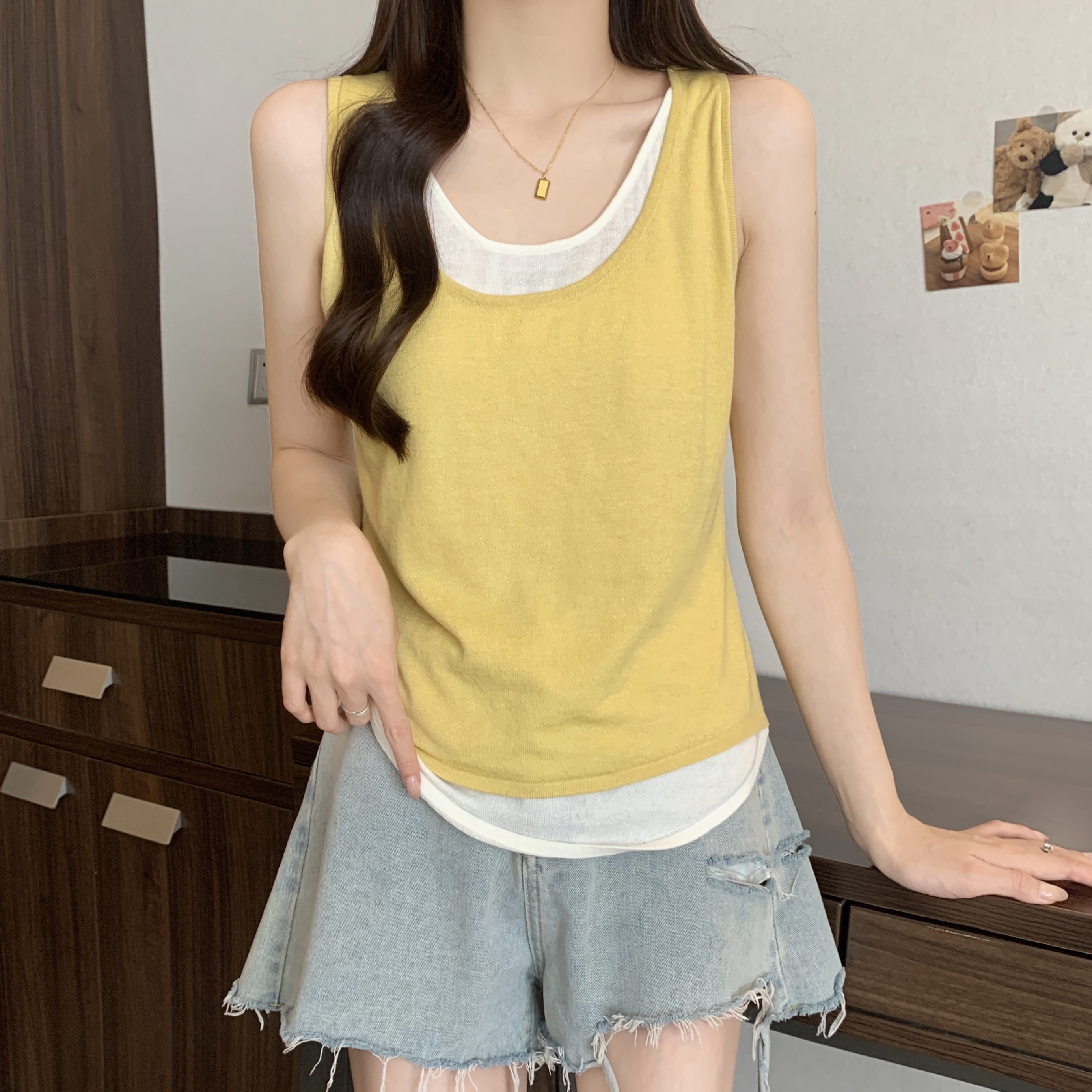 한국 스타일 디자인 센스 니트 가짜 투피스 I 자형 조끼 여성 여름 2025 새로운 민소매 외부 착용 프랑스 아름다운 탑스토어 가기