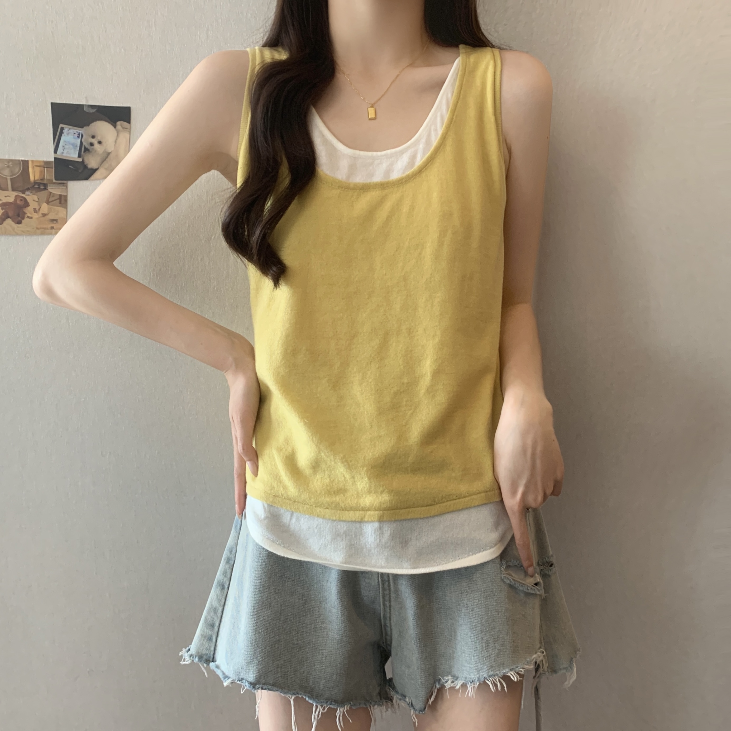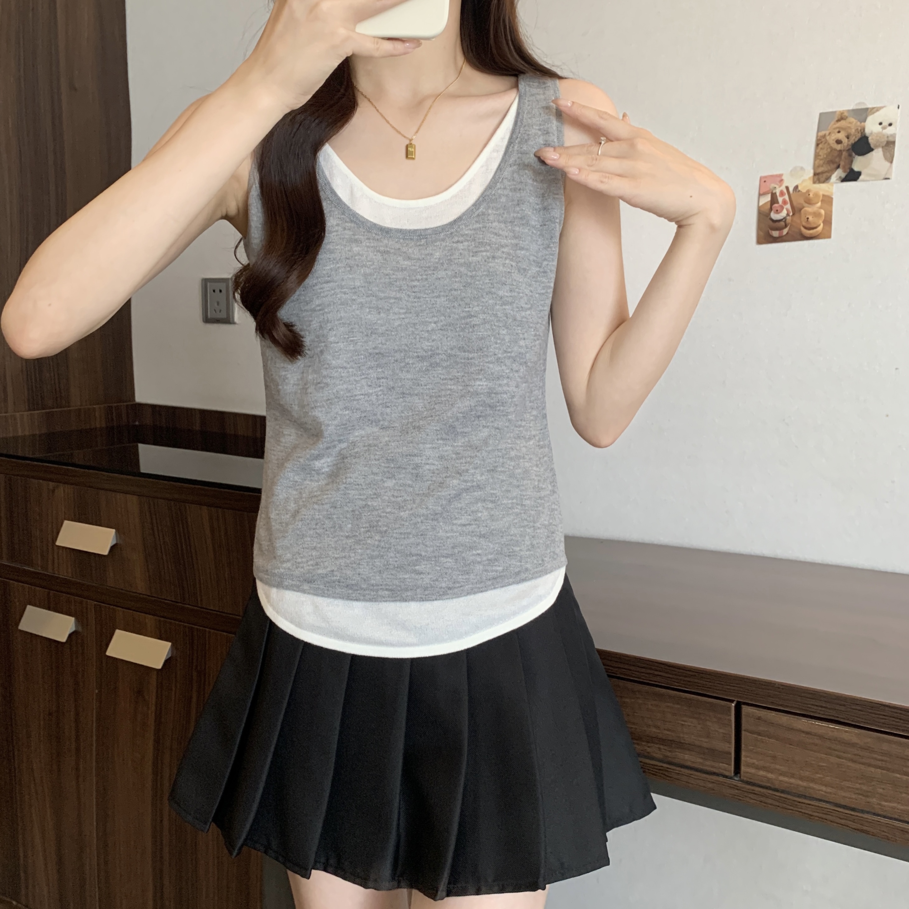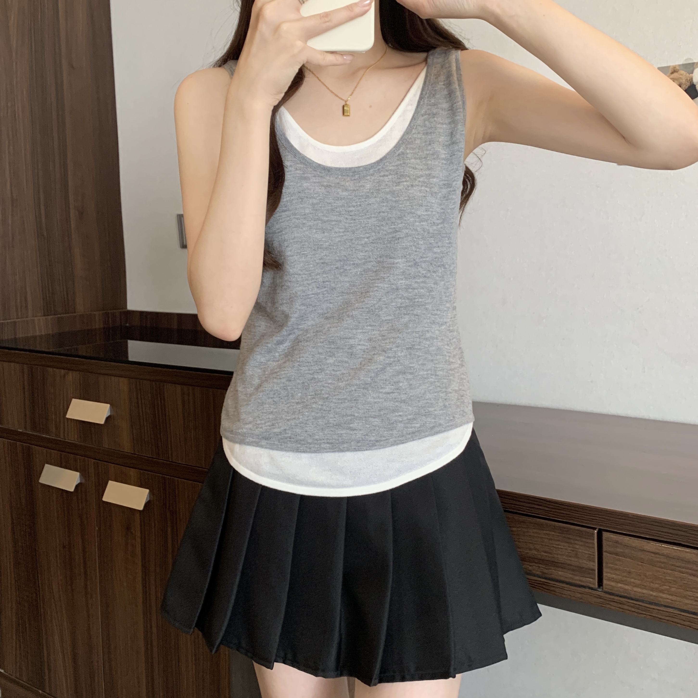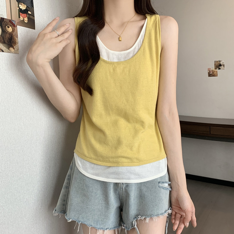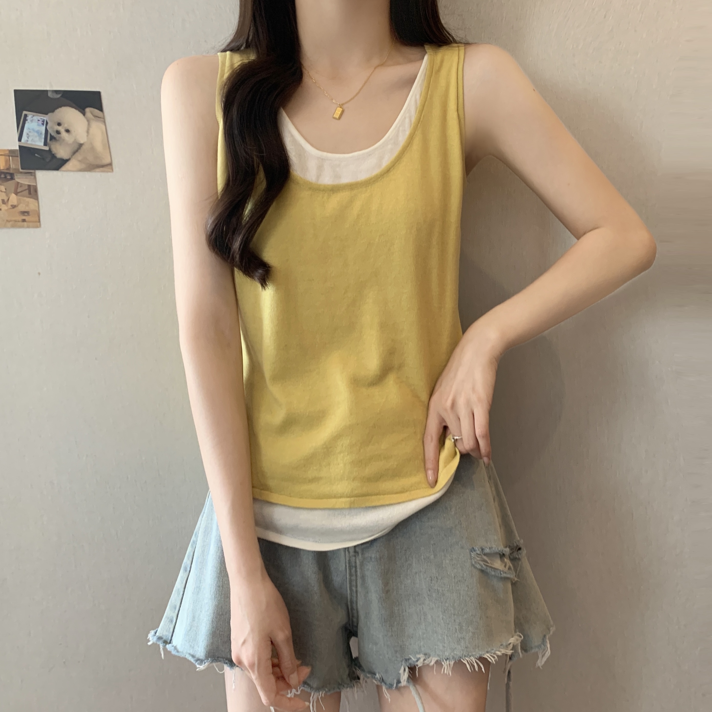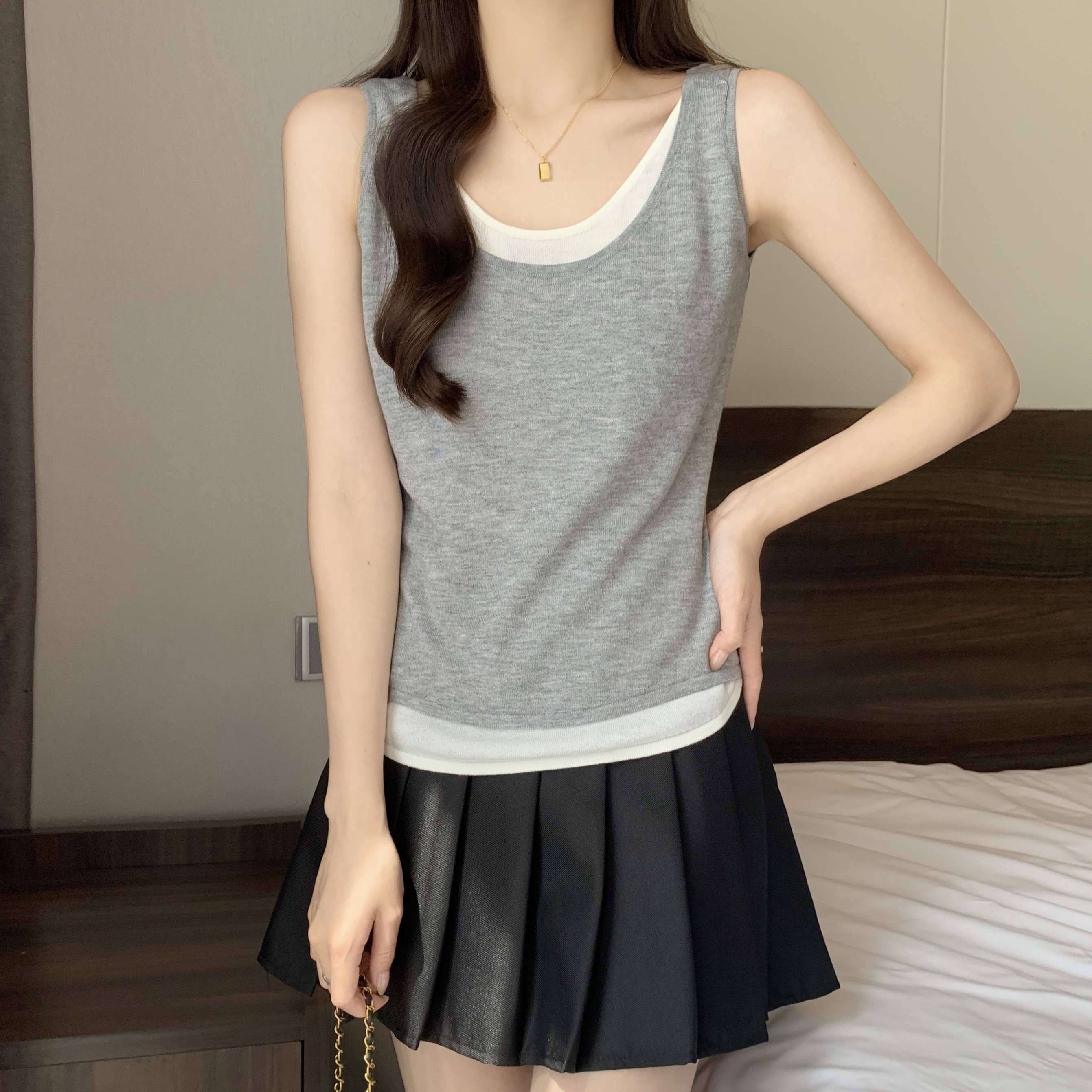 한국 스타일 디자인 센스 니트 가짜 투피스 I 자형 조끼 여성 여름 2025 새로운 민소매 외부 착용 프랑스 아름다운 탑스토어 가기