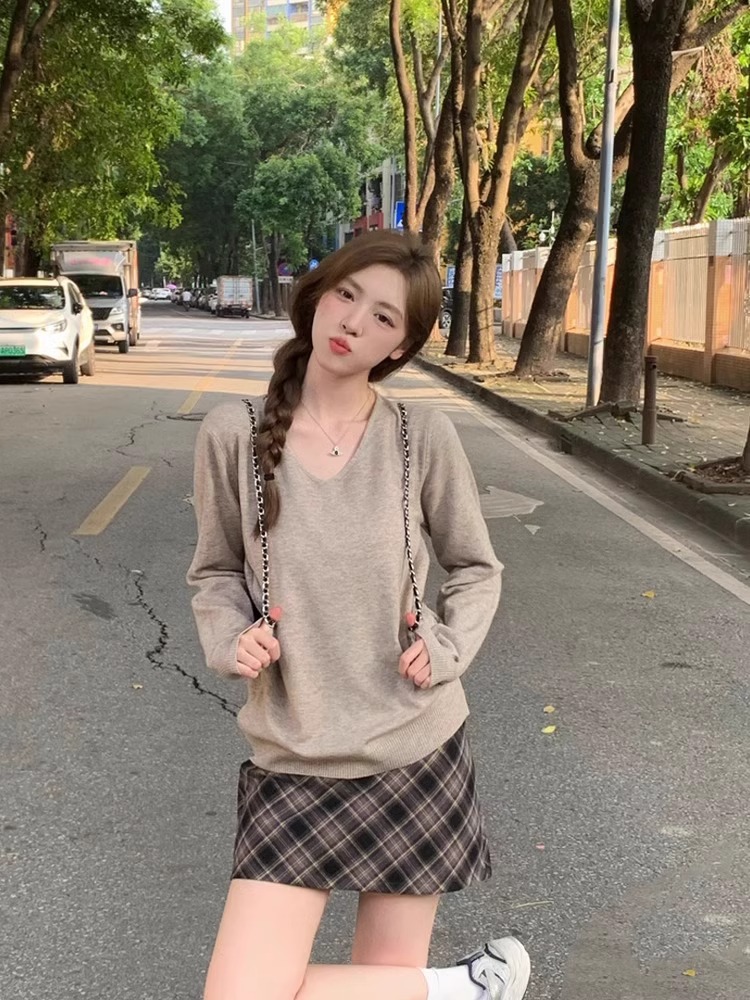 오트밀 한국 V-넥 스웨터 여성 2025 년 봄과 가을 새로운 부드러운 왁스 같은 느슨한 스웨터 내면베이스 셔츠