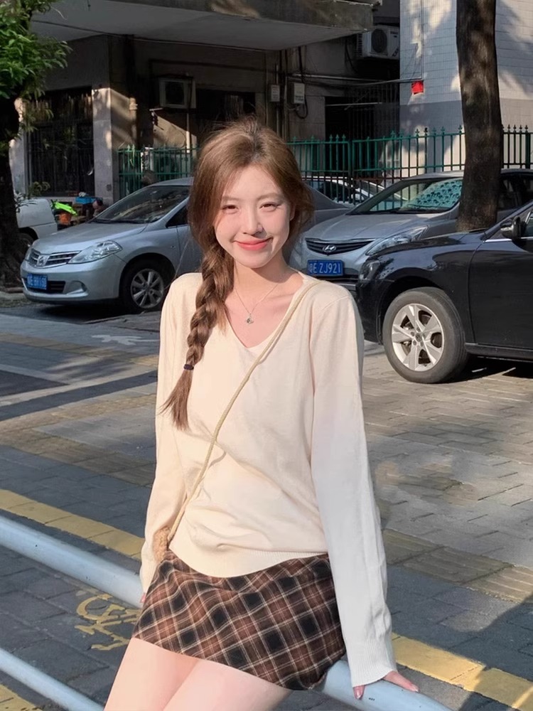 오트밀 한국 V-넥 스웨터 여성 2025 년 봄과 가을 새로운 부드러운 왁스 같은 느슨한 스웨터 내면베이스 셔츠스토어 가기