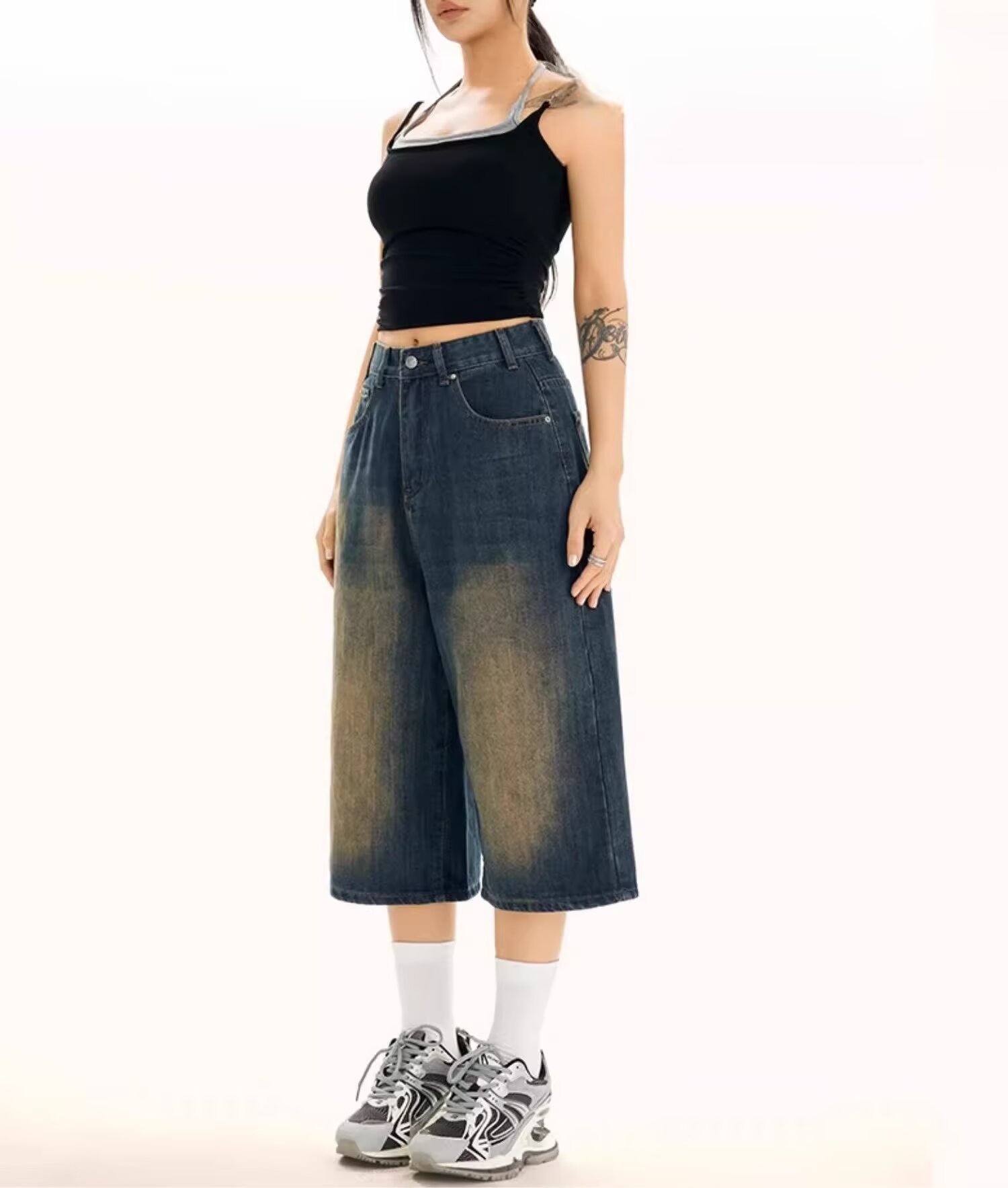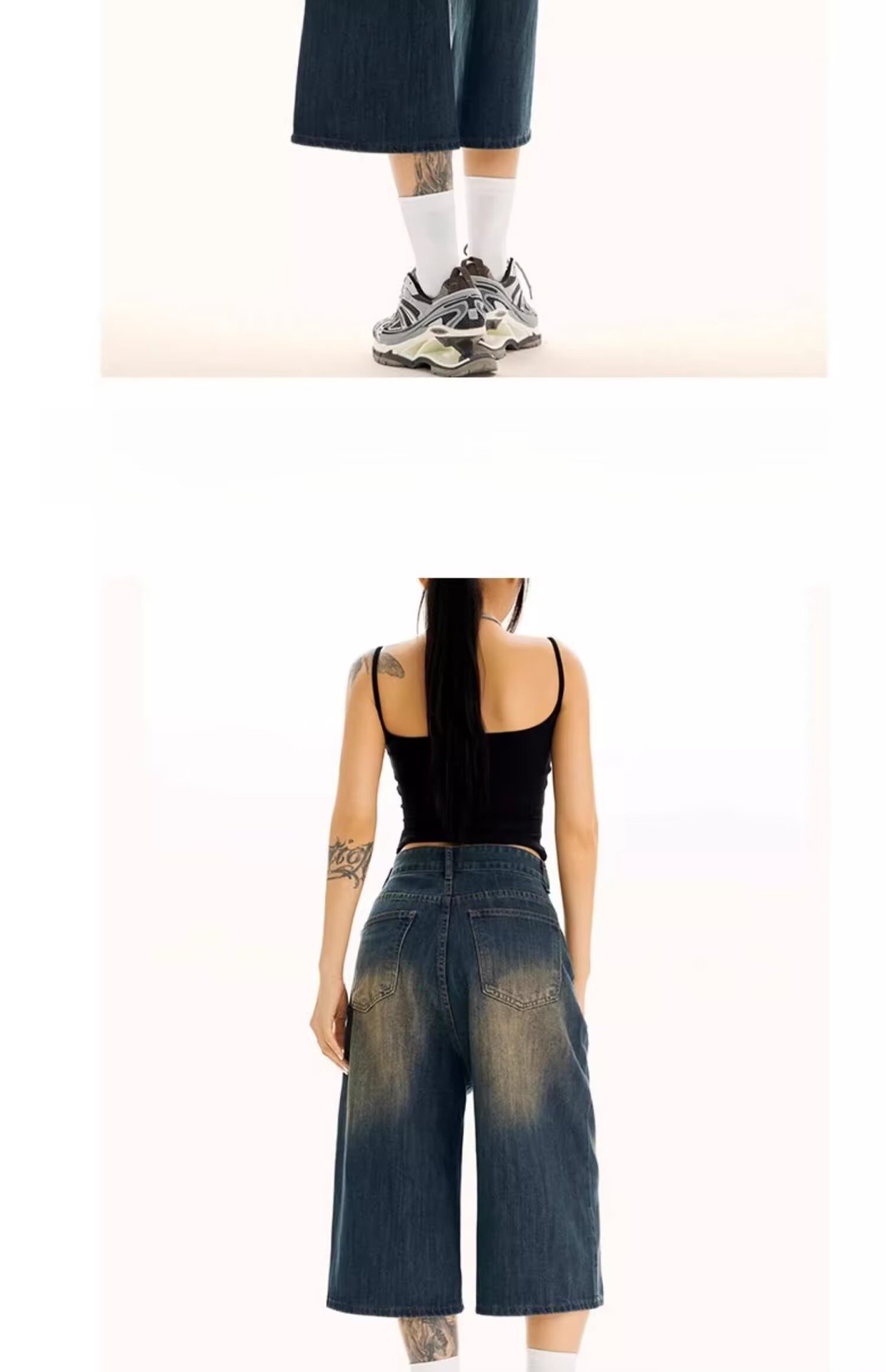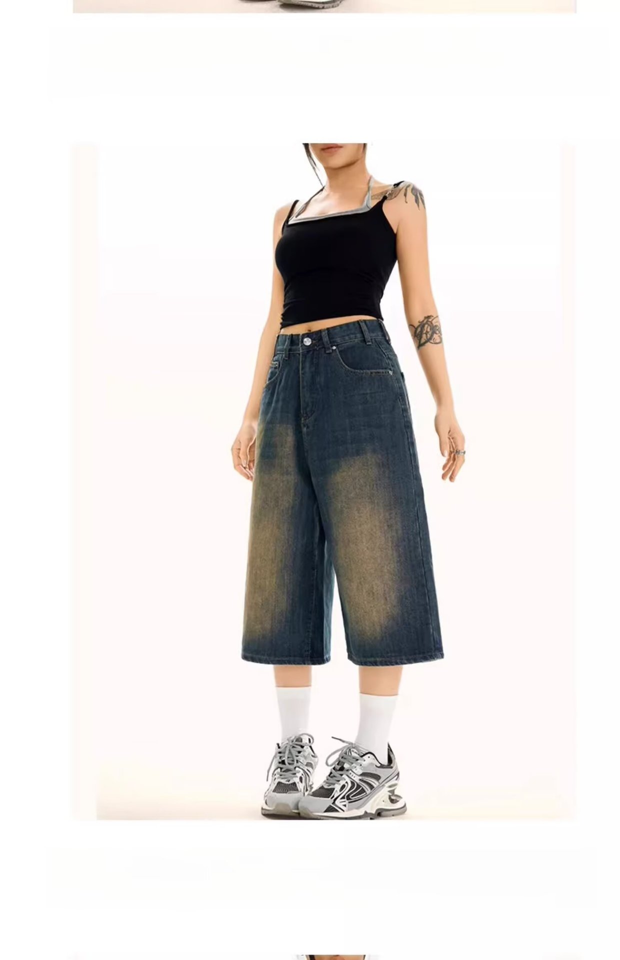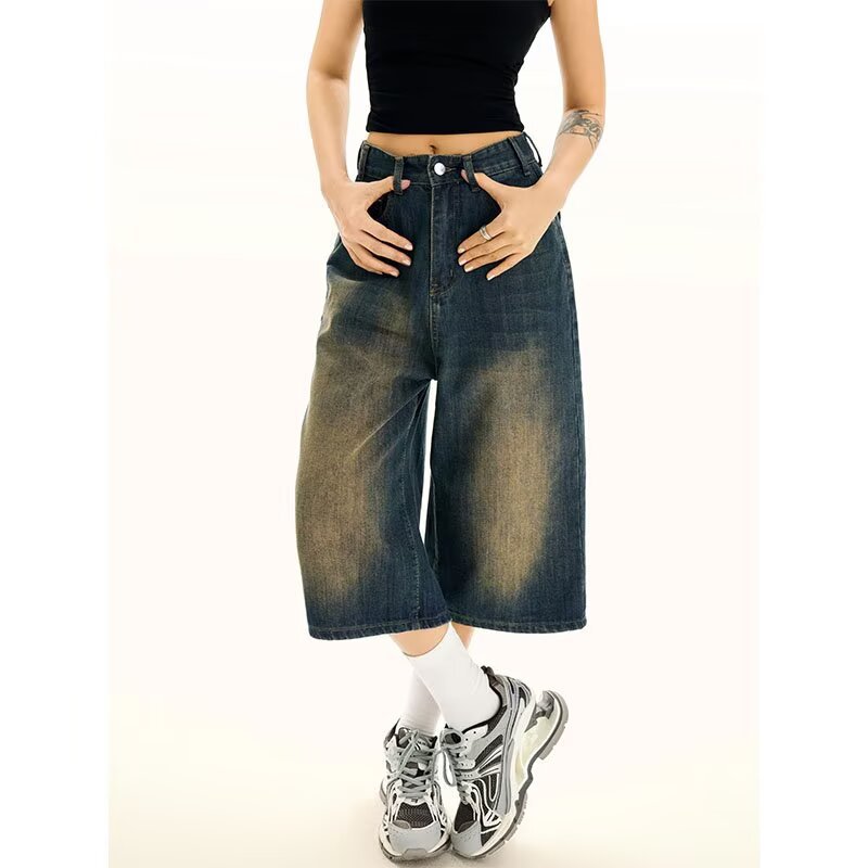와이드 레그 7 포인트 청바지 봄과 여름 빈티지 올드 아메리칸 스타일 하이 스트리트 루즈 미드 레그 트렌디 반바지 남성과 여성스토어 가기