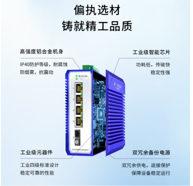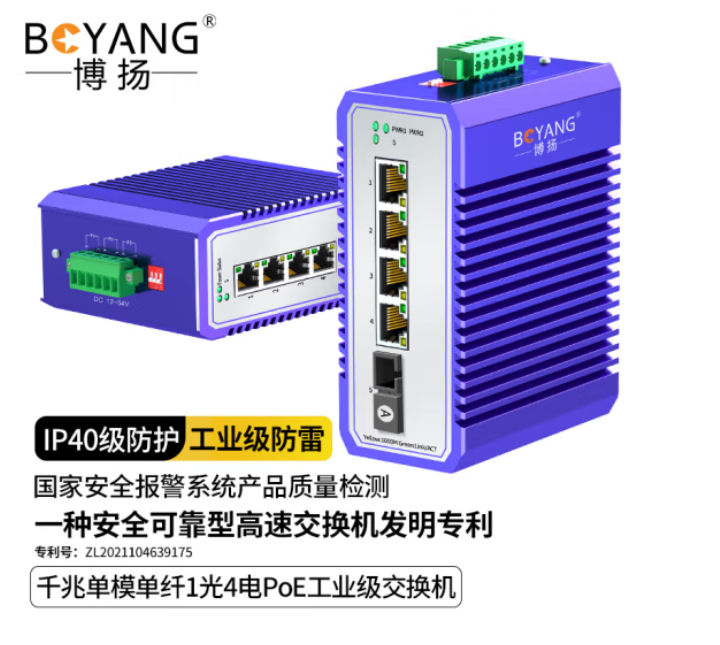 博扬(BOYANG)BY-PG1041A/B POE工业级光纤收发器 千兆单模单纤1光4电光电转换器 SC接口20公里 含电源*1 合格证*1 保修卡*1