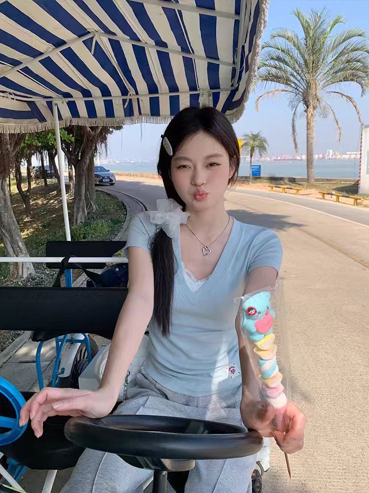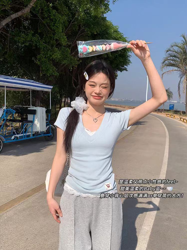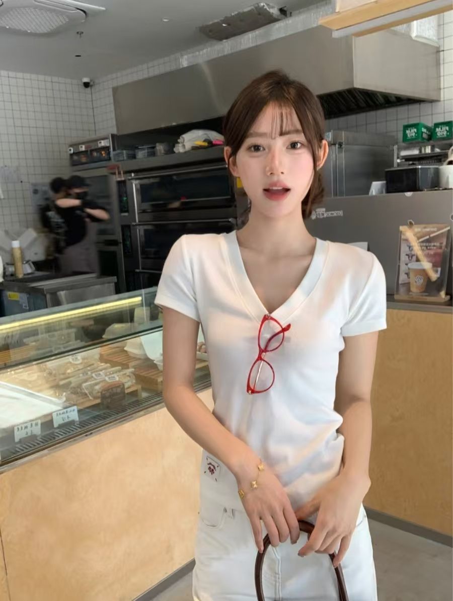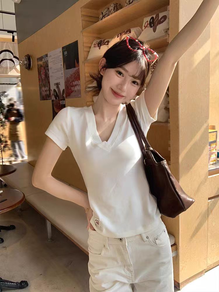 Jane Mani 오른쪽 어깨 브이넥 한국 스타일 연령 감소 여성용 반팔 티셔츠 여름 디자인 바닥 셔츠 슬림 짧은 핫 소녀 탑