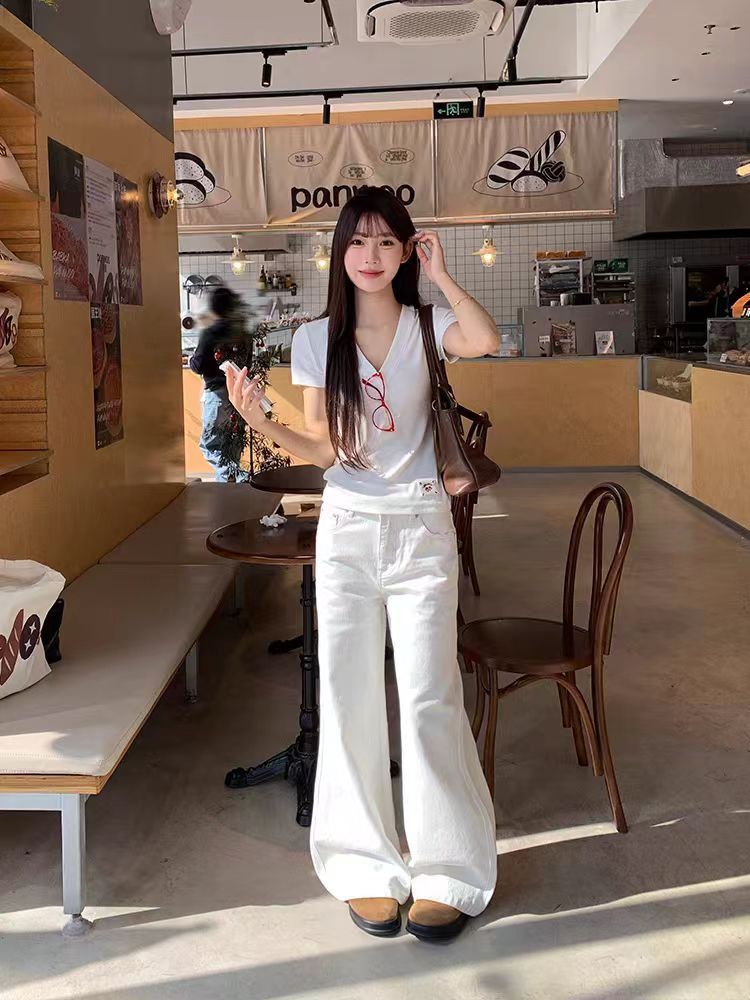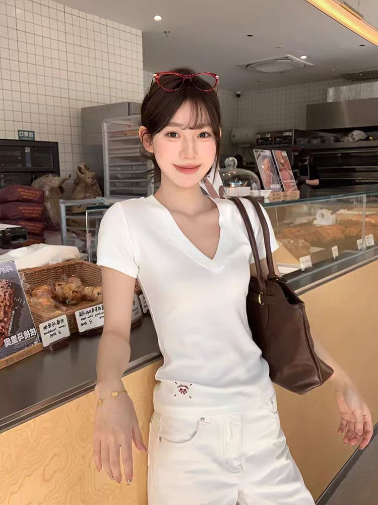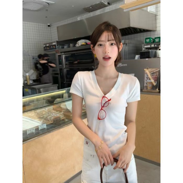 Jane Mani 오른쪽 어깨 브이넥 한국 스타일 연령 감소 여성용 반팔 티셔츠 여름 디자인 바닥 셔츠 슬림 짧은 핫 소녀 탑스토어 가기