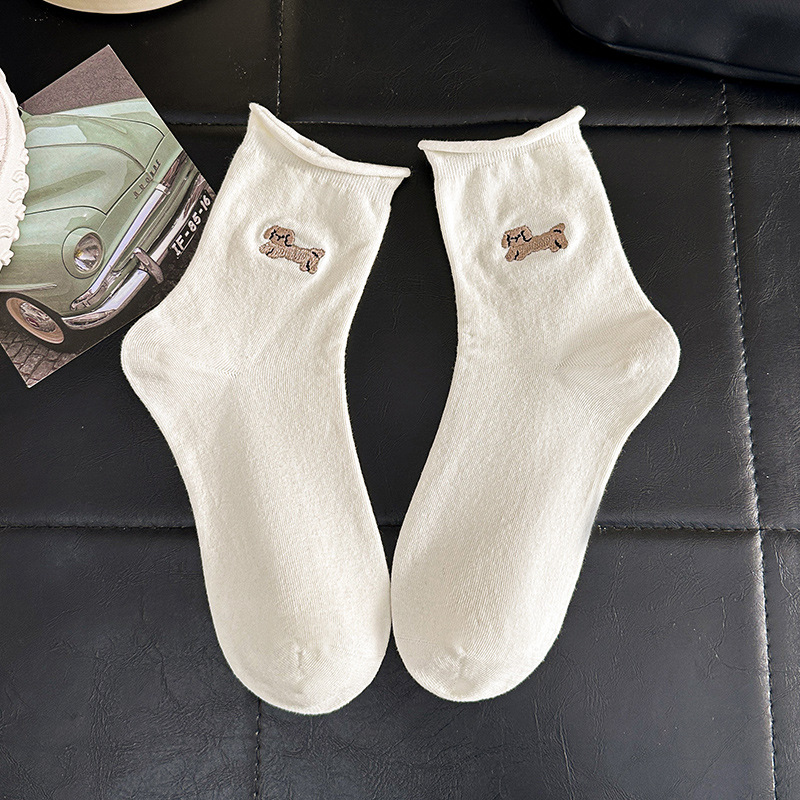 봄과 여름 양말 여성 소녀 뼈없는 양말 귀여운 닥스 훈트 개 강아지 강아지 강아지 자수 만화 일본 시리즈 컬링면 양말