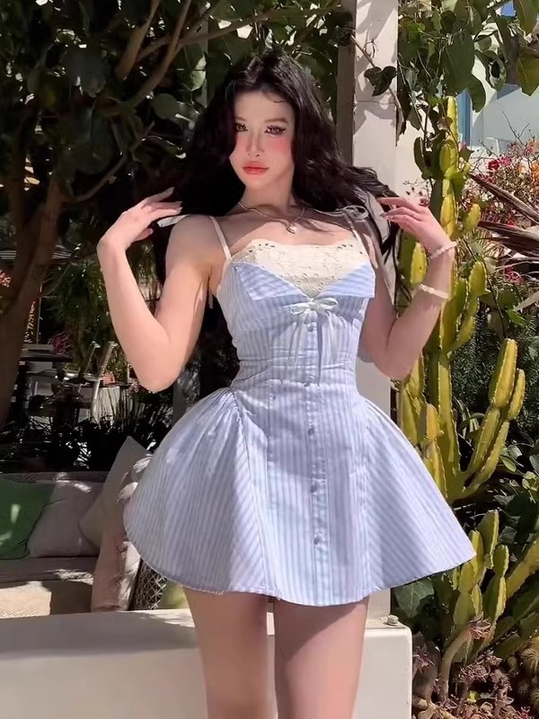 순수한 욕망 스타일 블루 스트라이프 슬링 원피스 여성의 봄과 여름 가짜 투피스 레이스 바느질 허리 A 자형 짧은 치마
