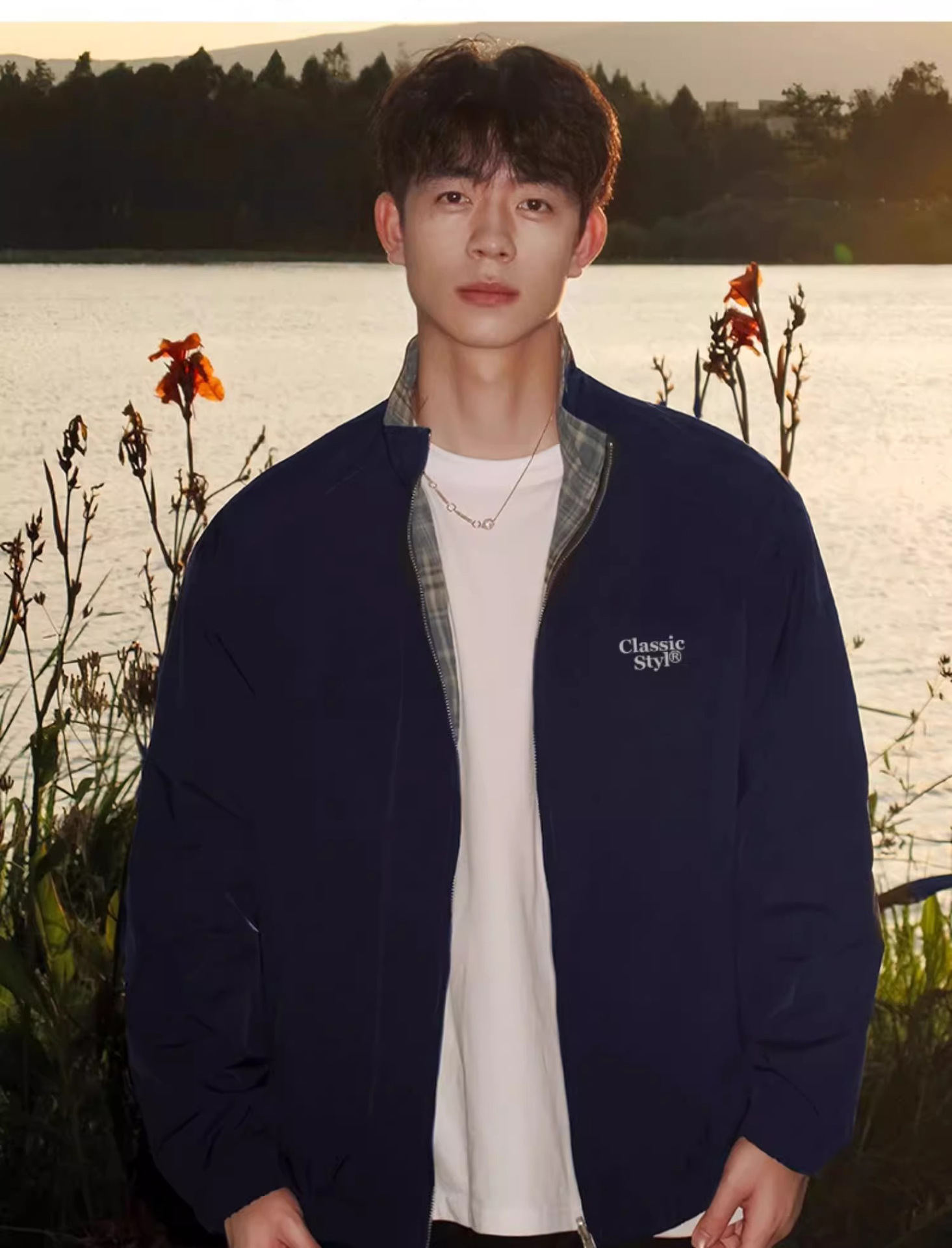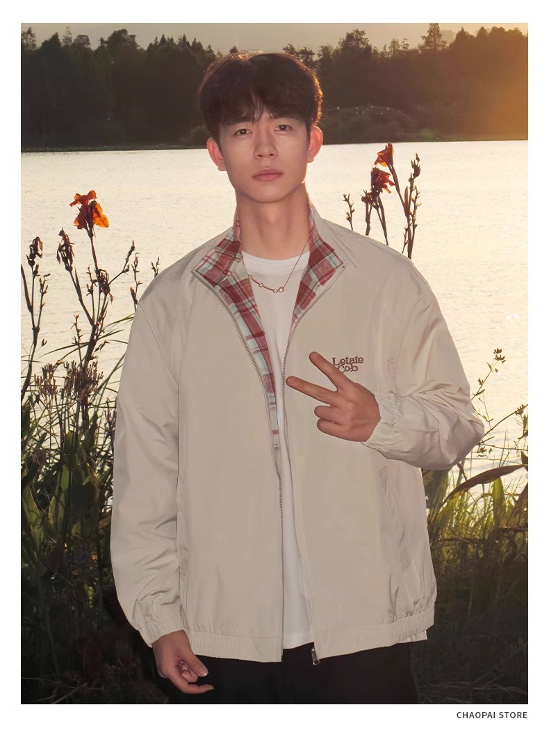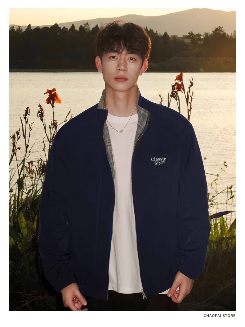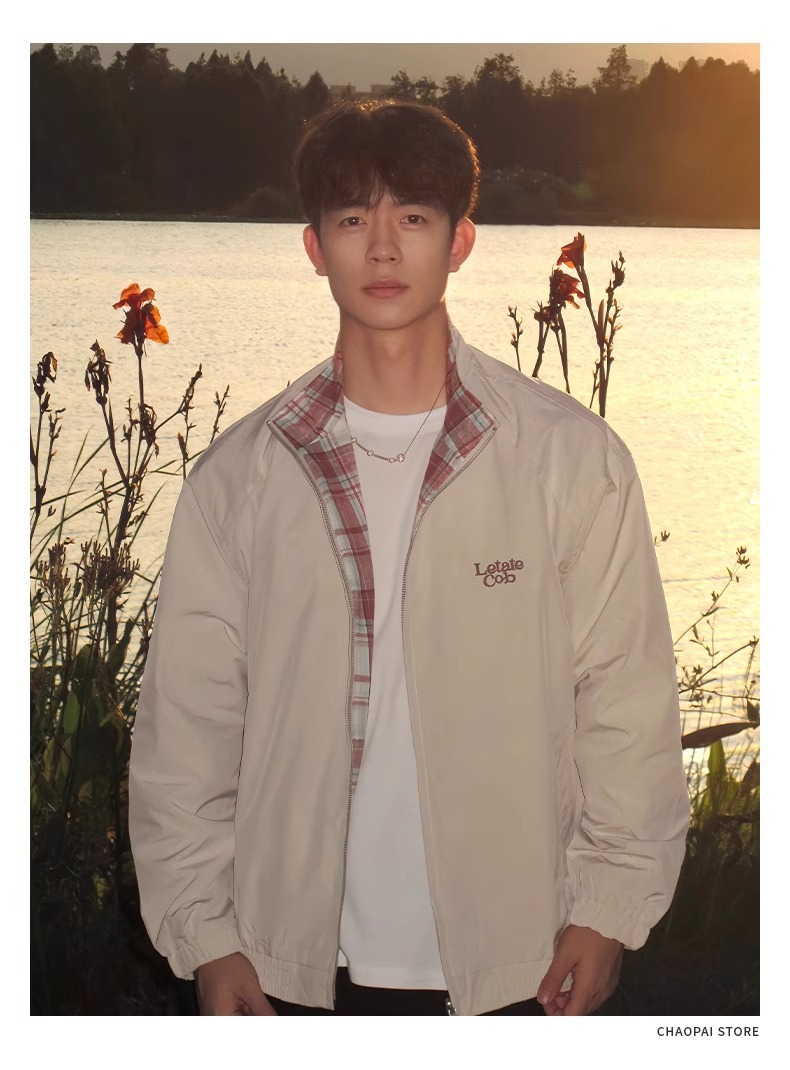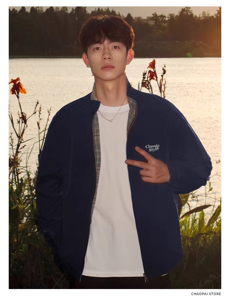 아메리칸 캐주얼 양면 스플라이스 스탠드 칼라 체크 무늬 재킷 남성 봄, 가을 신작 양면 야구 재킷 탑