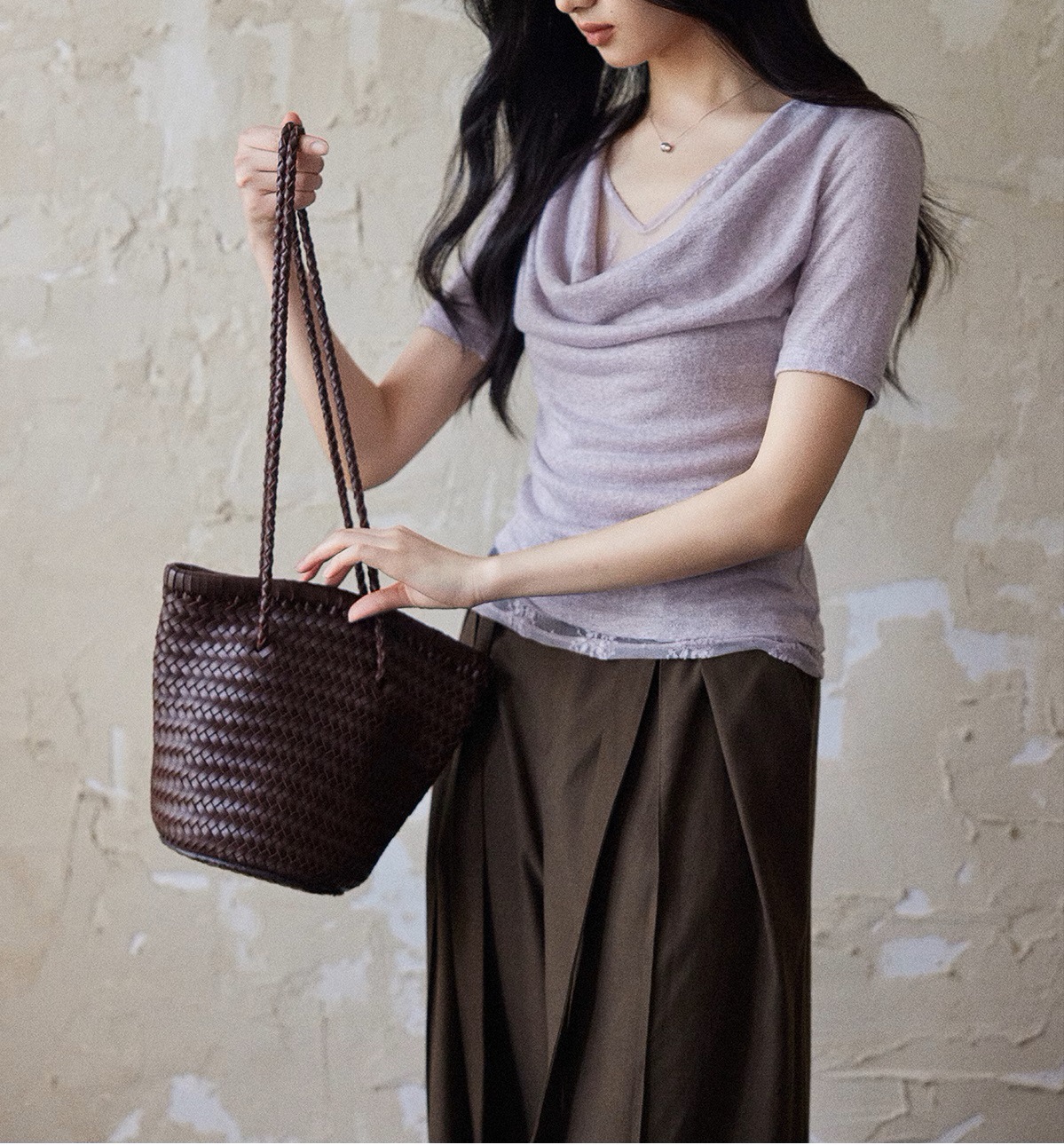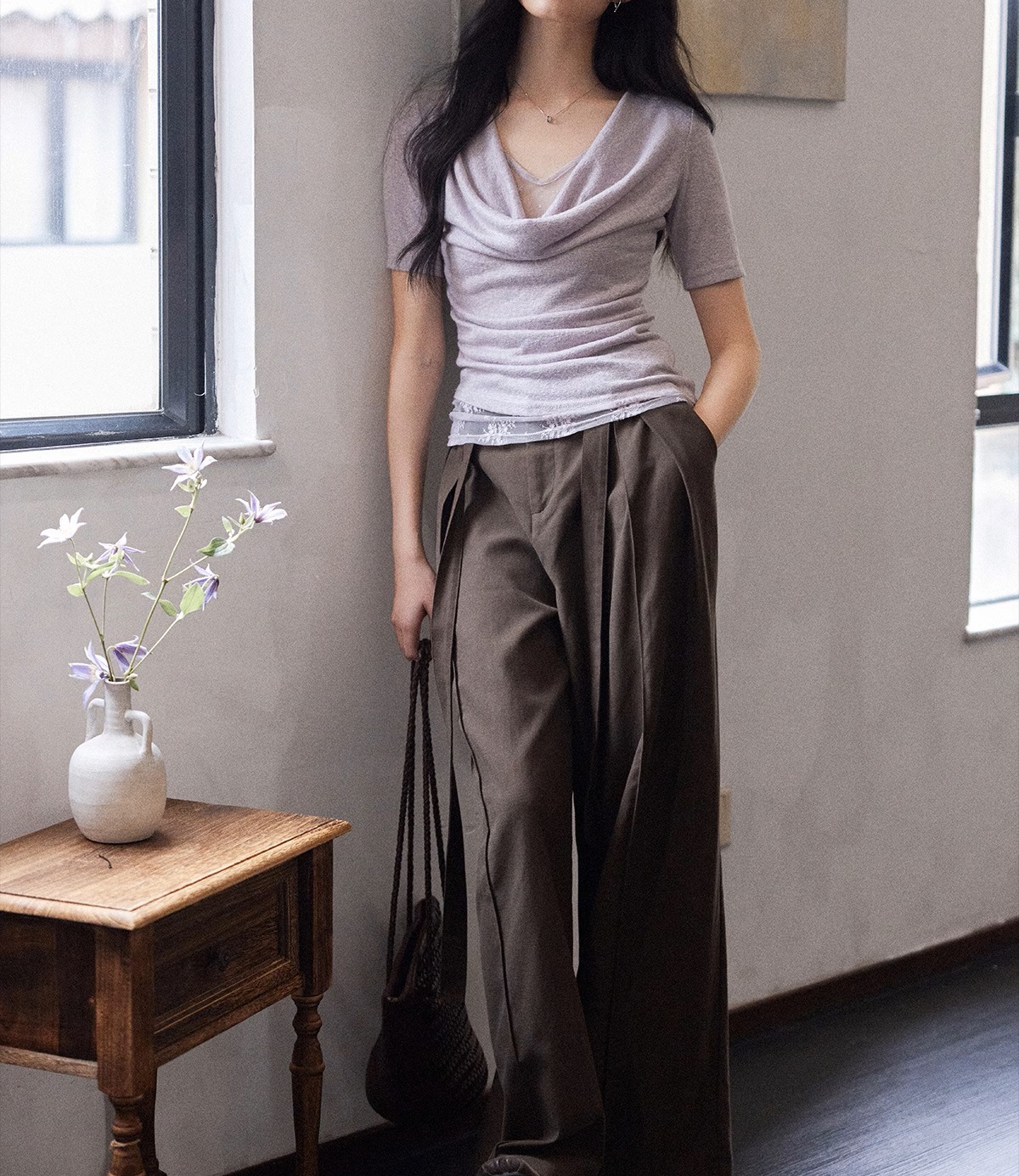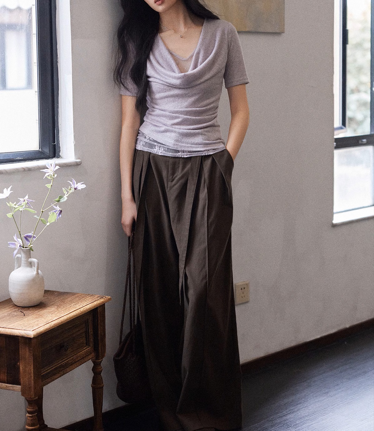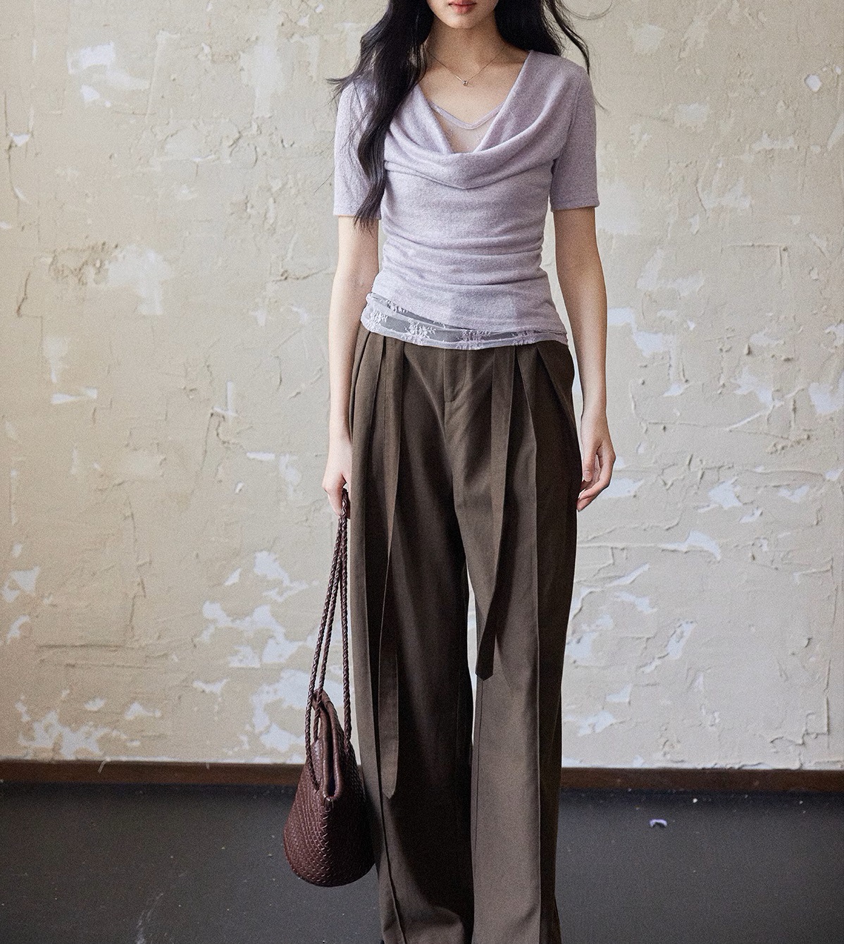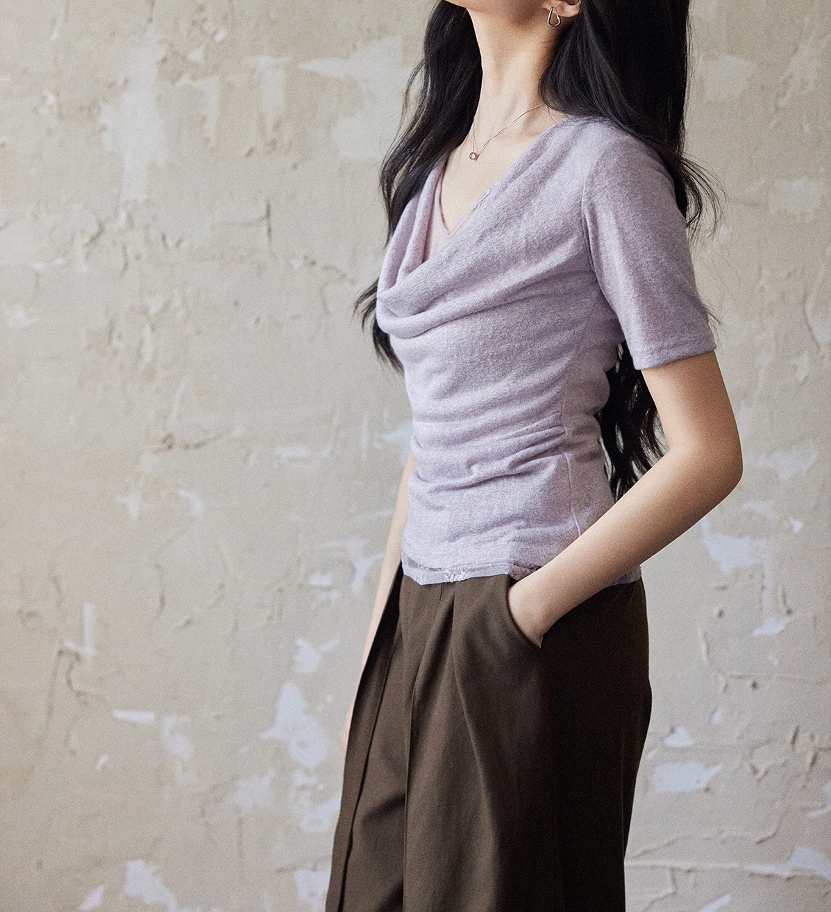 두 양 [Ting Lan] 가짜 투피스 스윙 칼라 레이스 니트 반팔 탑 여성용 보라색 우아한 타이트 허리 티셔츠