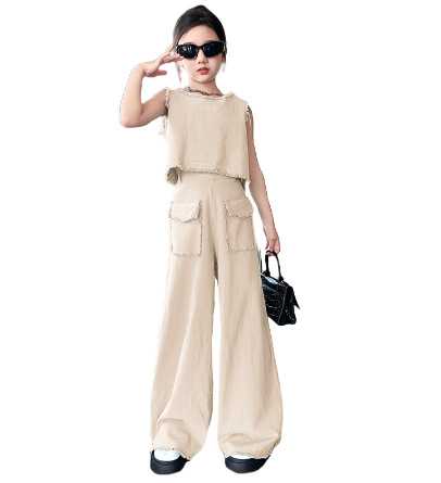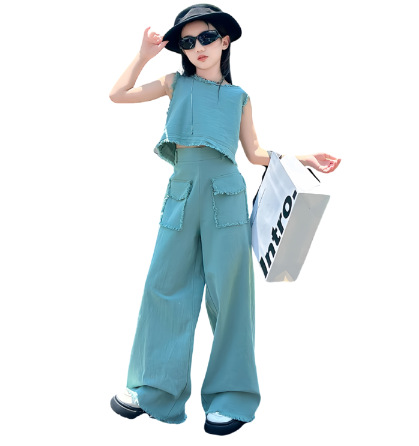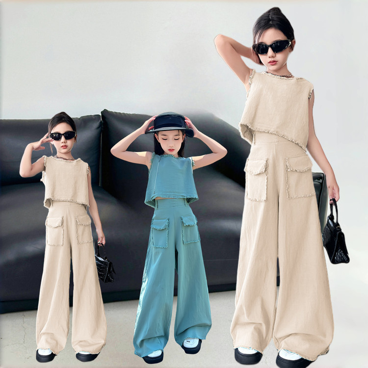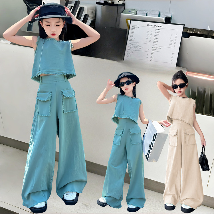 국경 간 소녀 여름 얇은 민소매 캐주얼 투피스 세트 2025 새로운 어린이 단색 한국식 세트스토어 가기