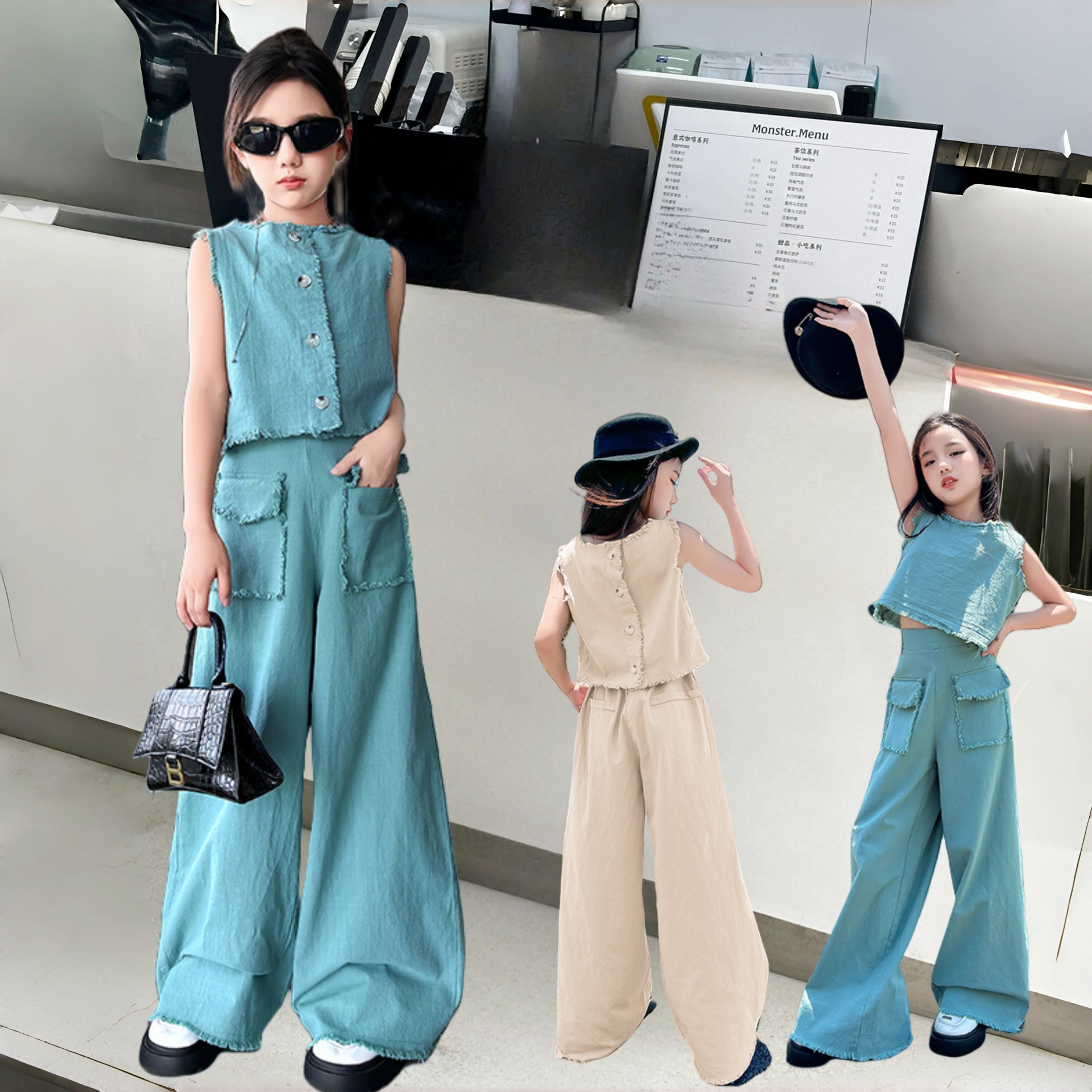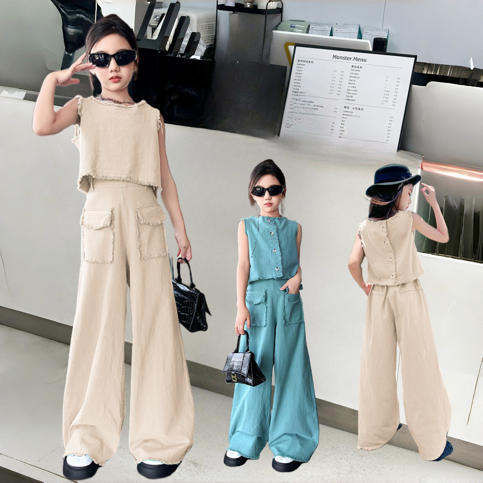 국경 간 소녀 여름 얇은 민소매 캐주얼 투피스 세트 2025 새로운 어린이 단색 한국식 세트
