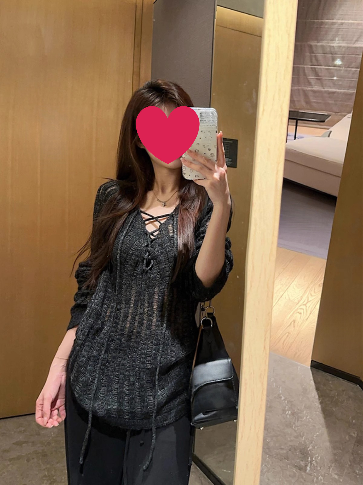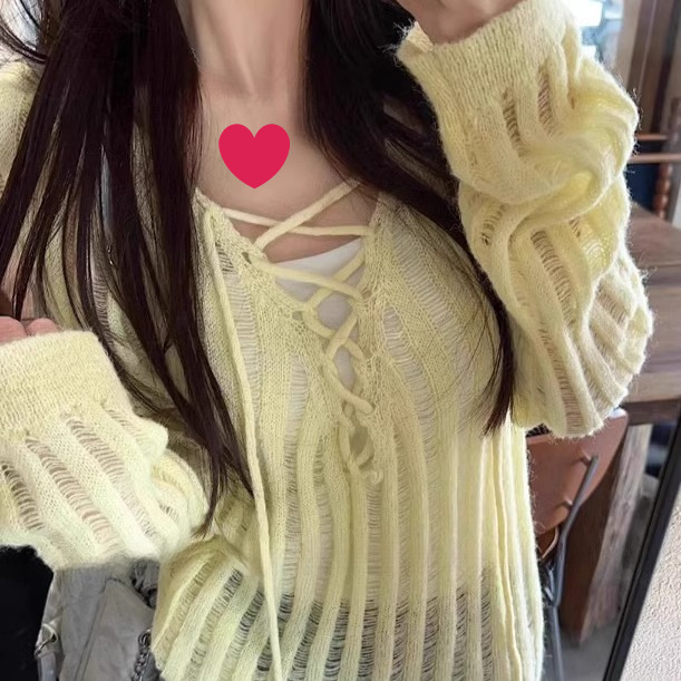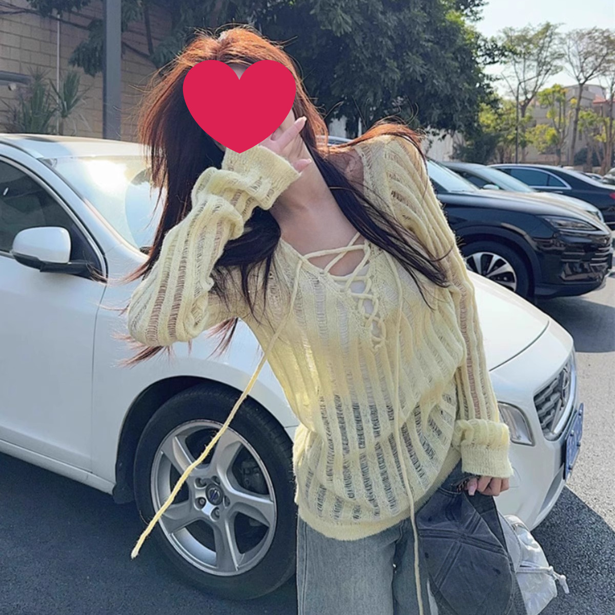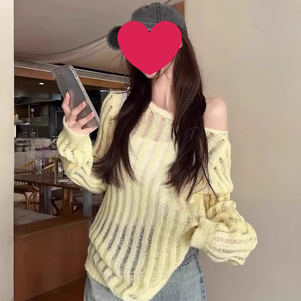 핫 걸스 할로우 스트랩 디자인 센스 이른 봄 오픈 숄더 니트웨어 여성용 여름 슬림핏 슬리밍 옐로우 아우터 블라우스스토어 가기
