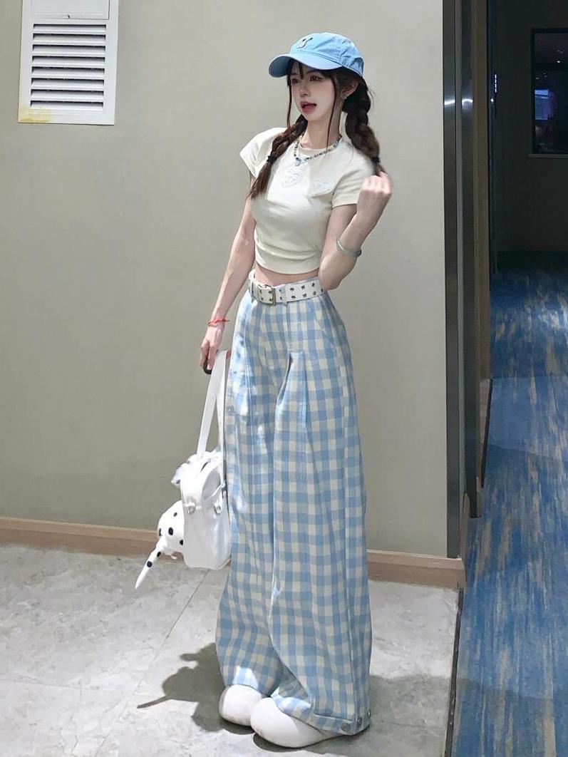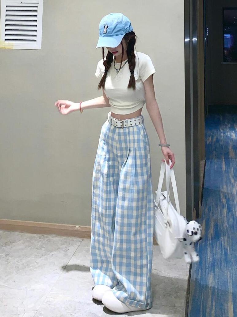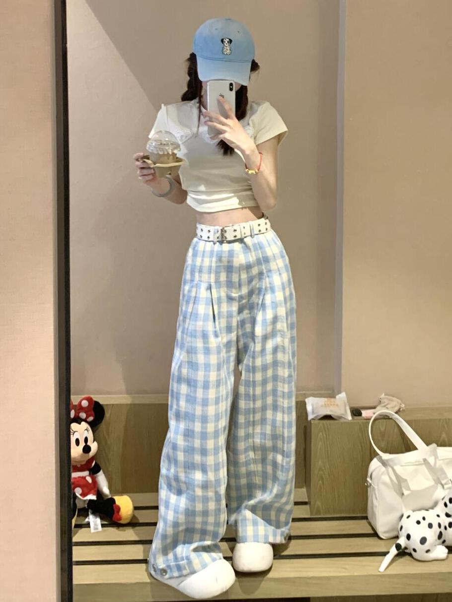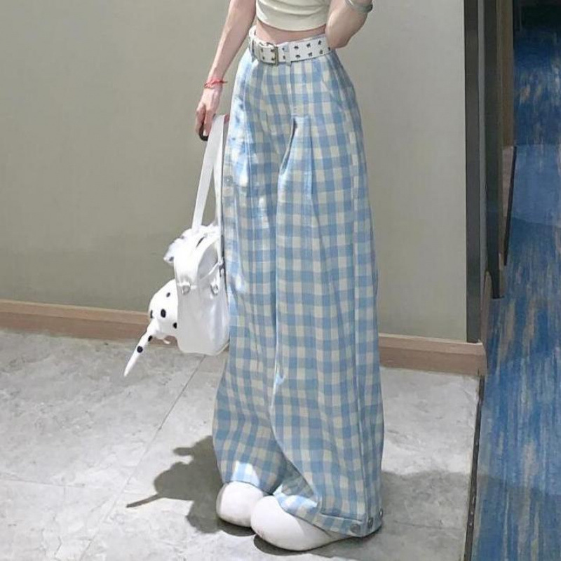 [30 일 뜨거운 2718 개] 파란색과 흰색 체크 무늬 넓은 다리 바지 여성 여름 디자인 높은 허리 느슨한 드레이프 걸레
