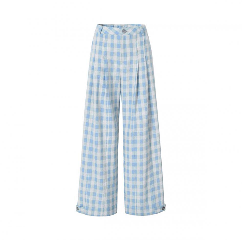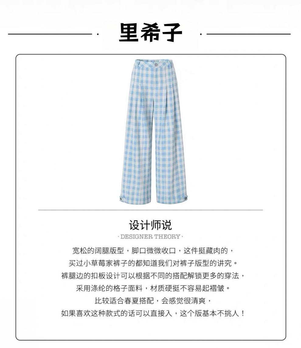 [30 일 뜨거운 2718 개] 파란색과 흰색 체크 무늬 넓은 다리 바지 여성 여름 디자인 높은 허리 느슨한 드레이프 걸레스토어 가기