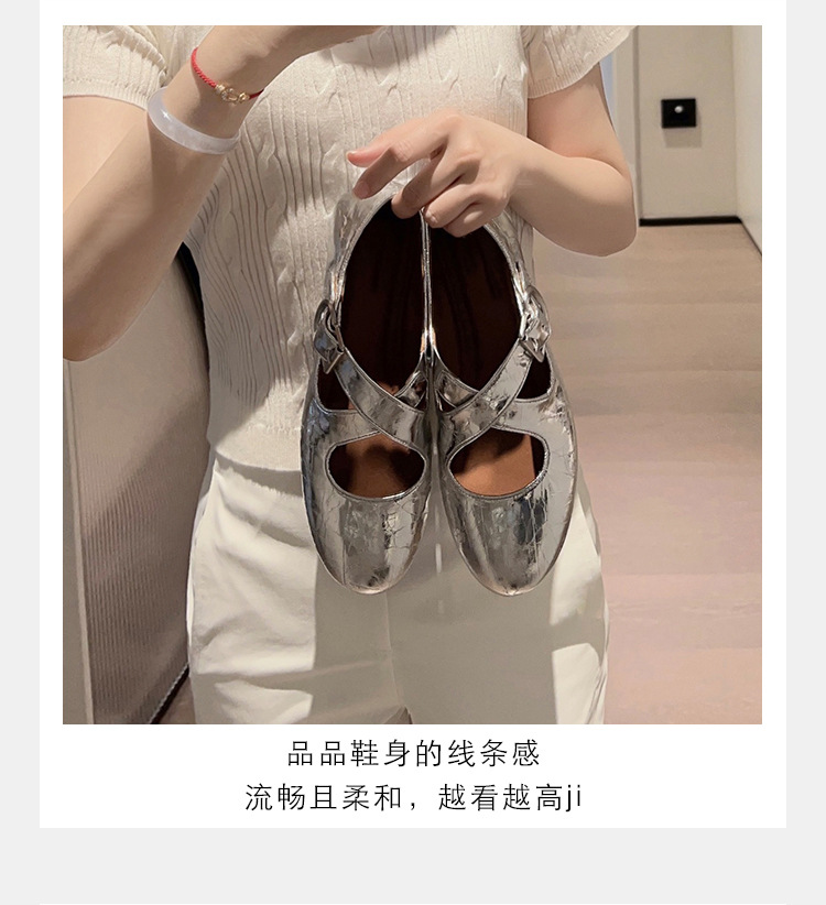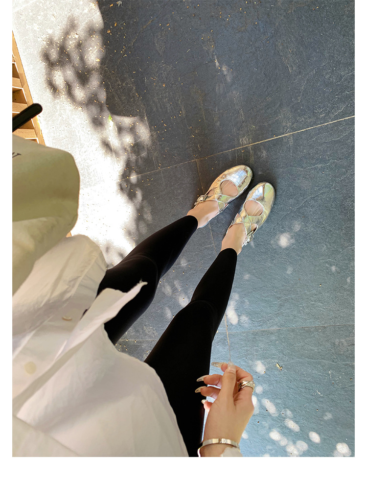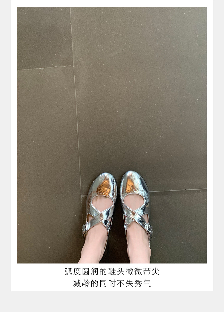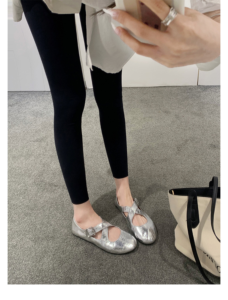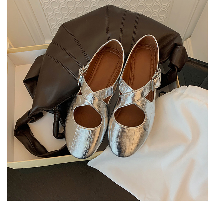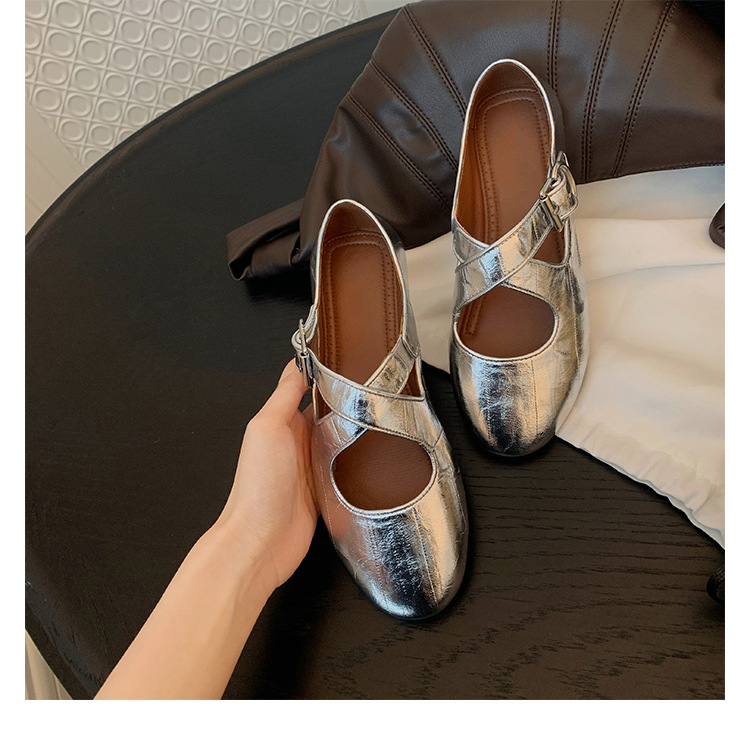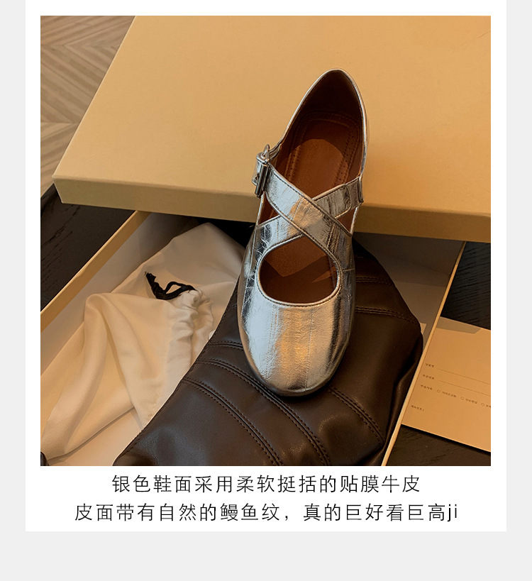양가죽 ~ 정품 가죽 부드러운 밑창 실버 메리 제인 신발 여성 크로스 버클 라운드 토 발레 플랫 신발 작은 가죽 신발