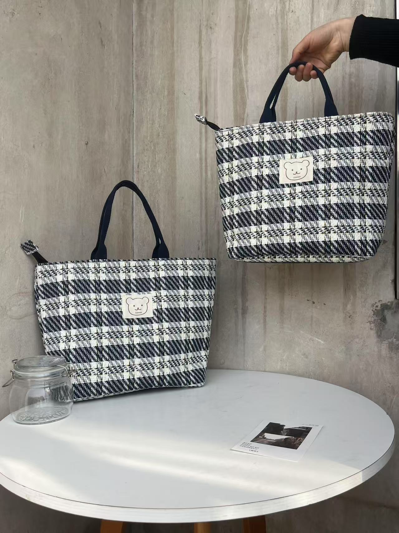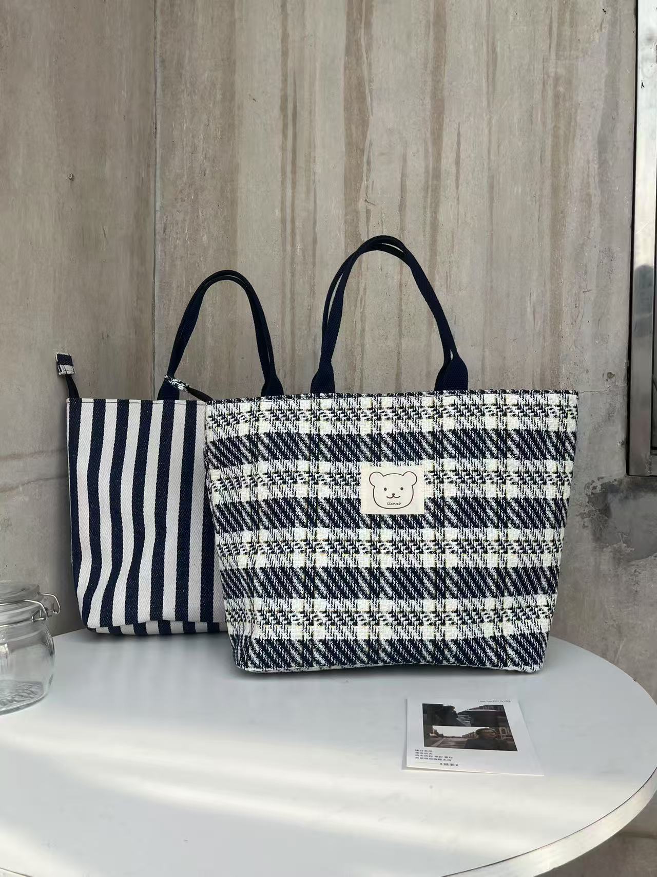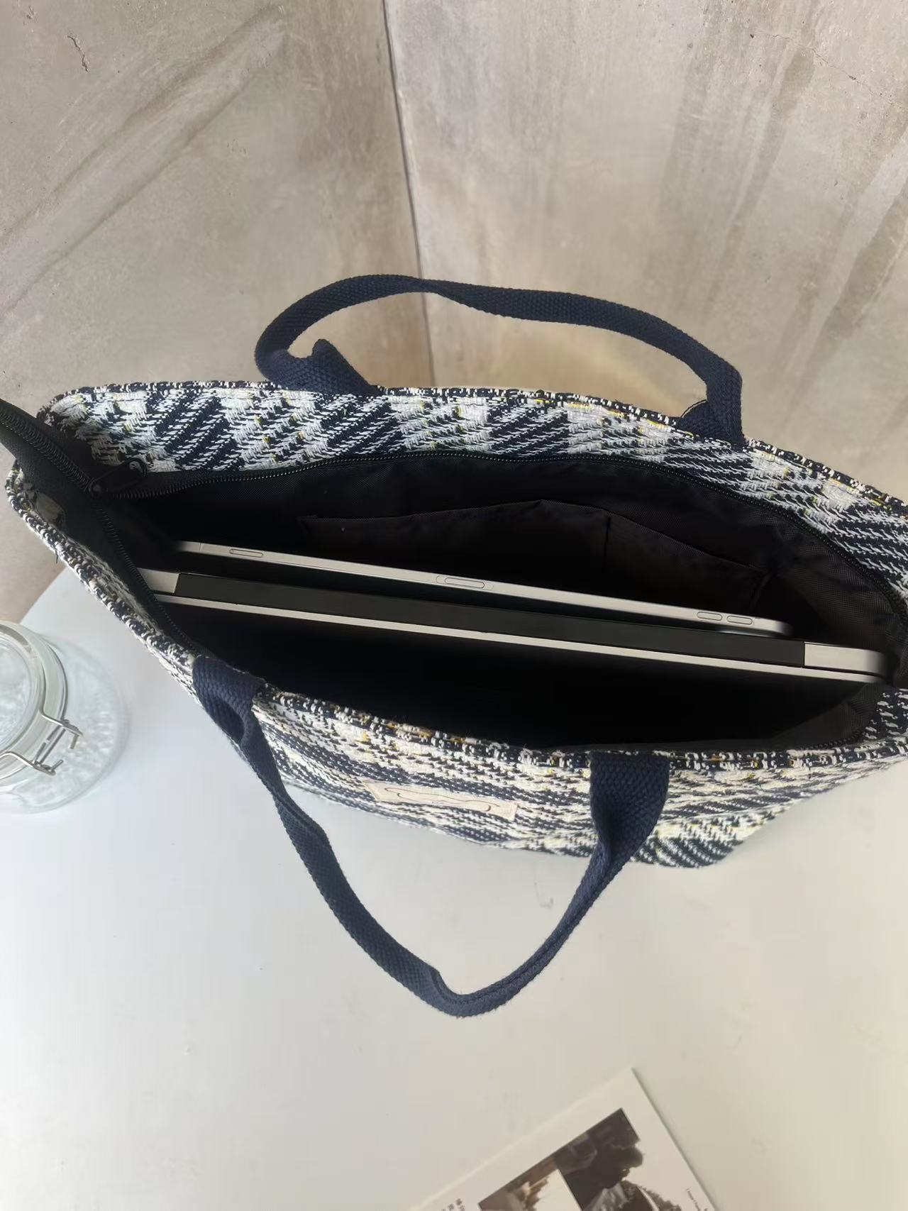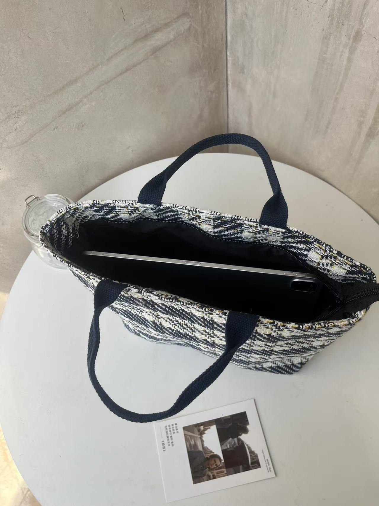 2025ins 토트 컴퓨터 가방 봄과 여름 새로운 격자 무늬 줄무늬 대용량 신선한 지퍼 휴대용 캔버스 가방스토어 가기