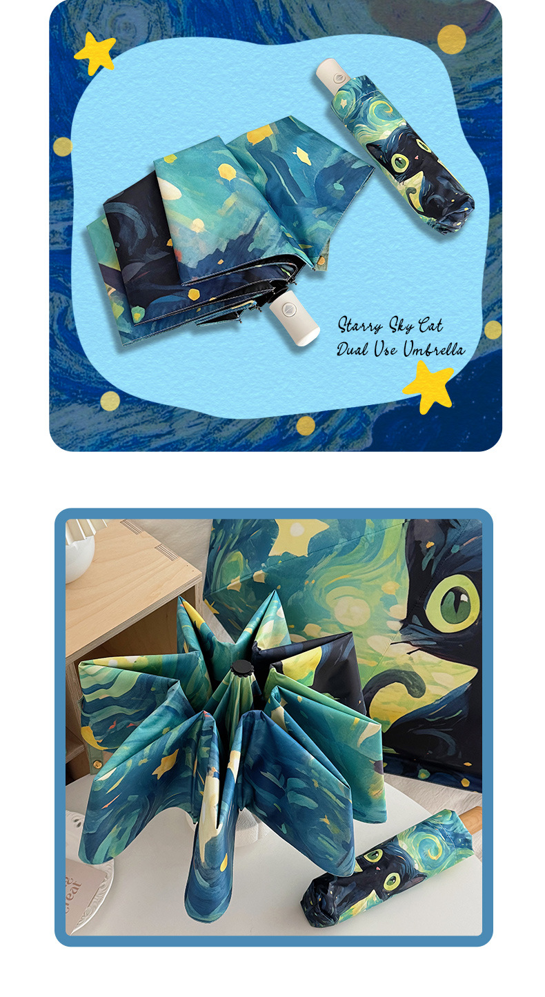 귀여운 반 고흐 고양이 접히는 우산 맑고 비 이중 목적 태양 우산 자동 검은 고무 태양 보호 자외선 보호 햇살 우산