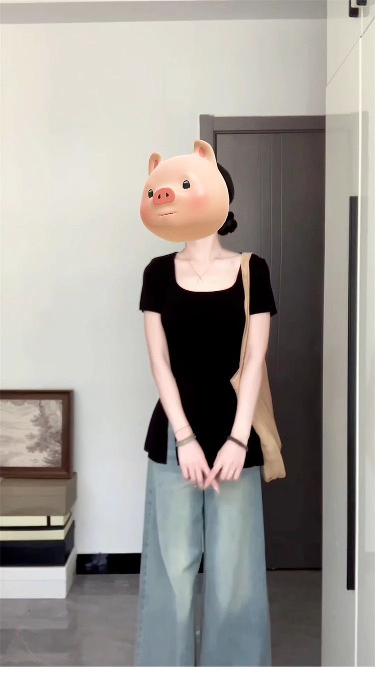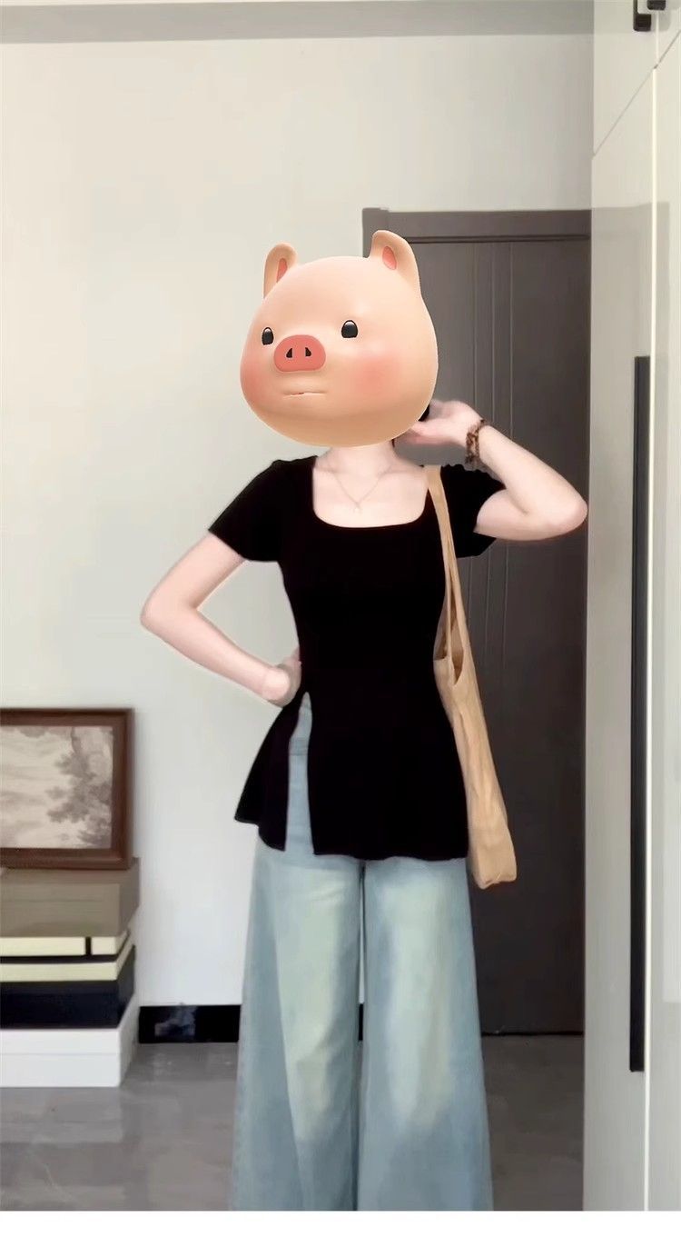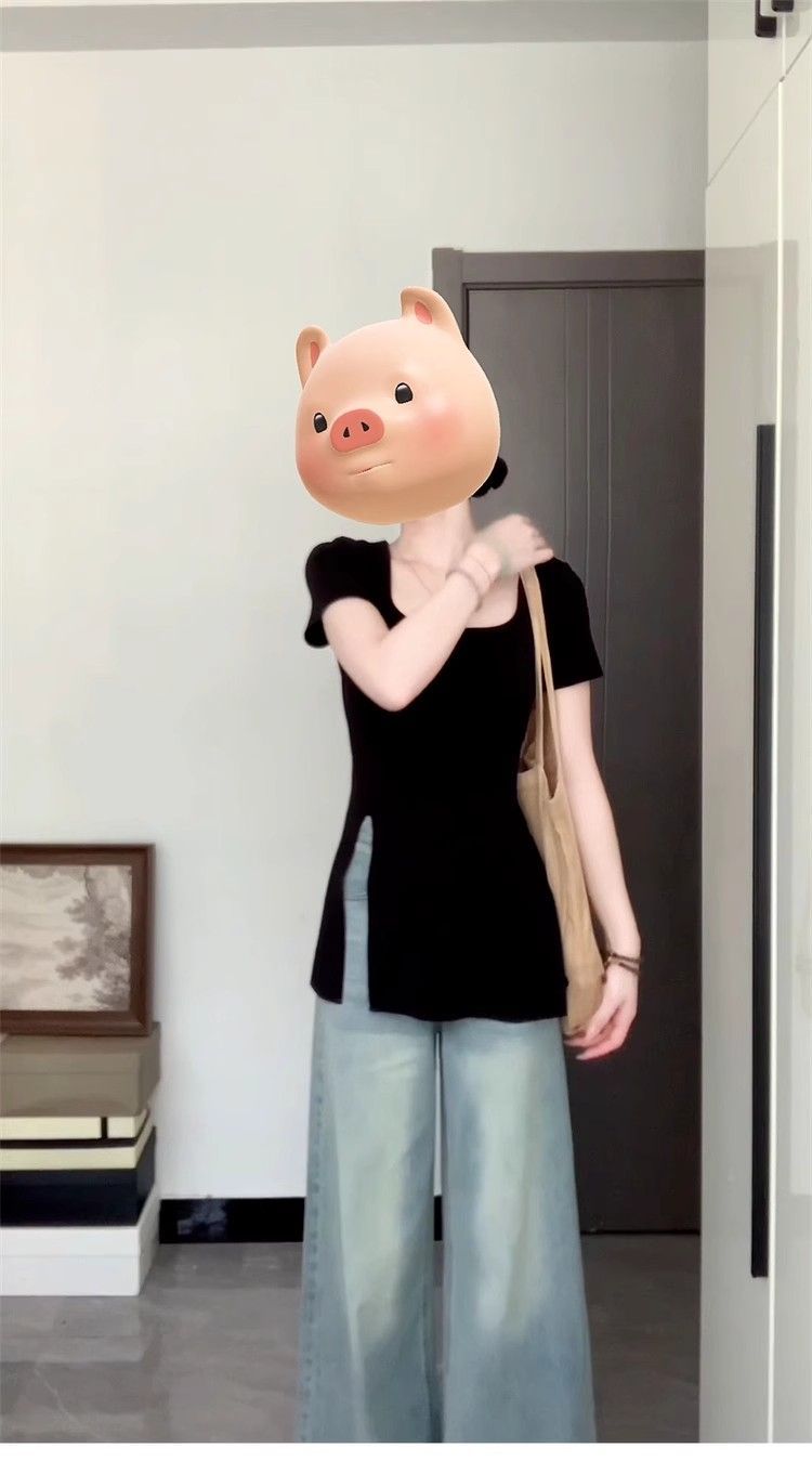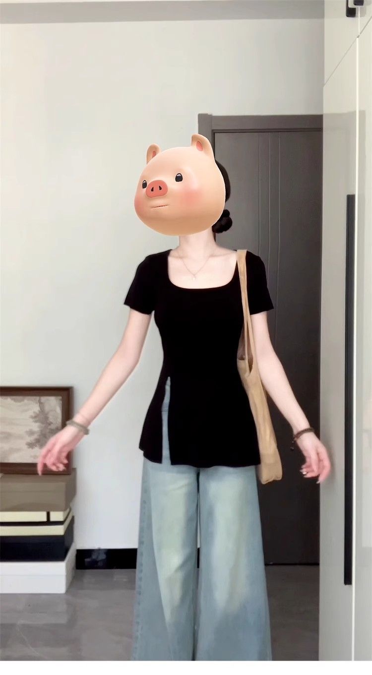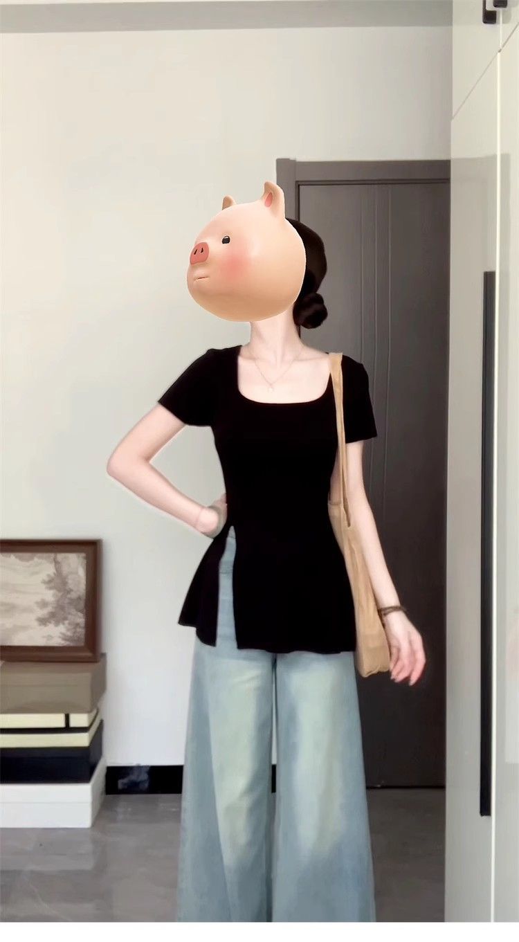 프렌치 스퀘어 칼라 블랙 반팔 티셔츠 여성 여름 2025 뉴 플러스 사이즈 통통녀 타이트 허리 스플릿 슬리밍 탑스토어 가기
