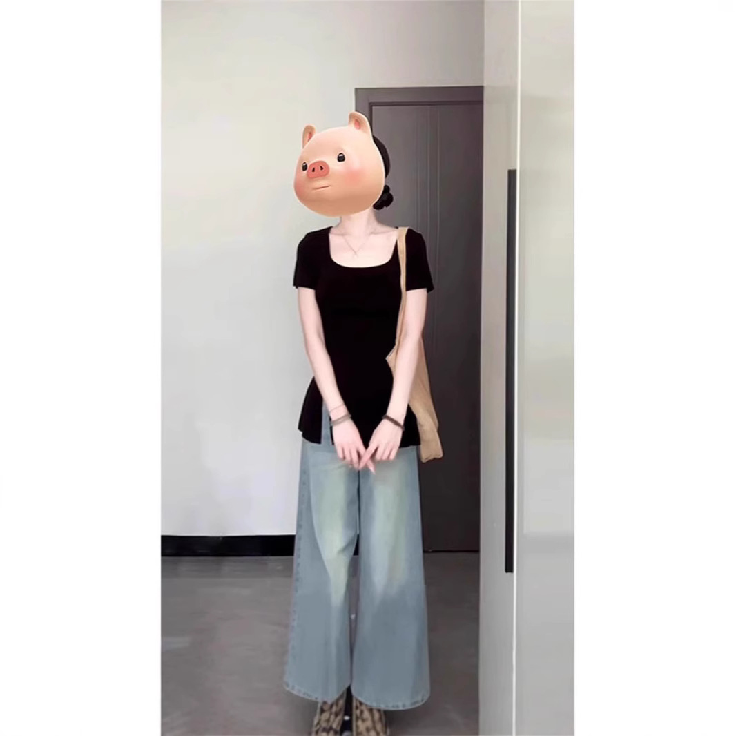 프렌치 스퀘어 칼라 블랙 반팔 티셔츠 여성 여름 2025 뉴 플러스 사이즈 통통녀 타이트 허리 스플릿 슬리밍 탑