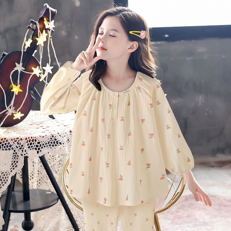 가을 신상 여아 달콤한 분위기의 튤립 긴팔 긴바지 잠옷 홈웨어 투피스 세트 귀여운 스타일의 여아복
