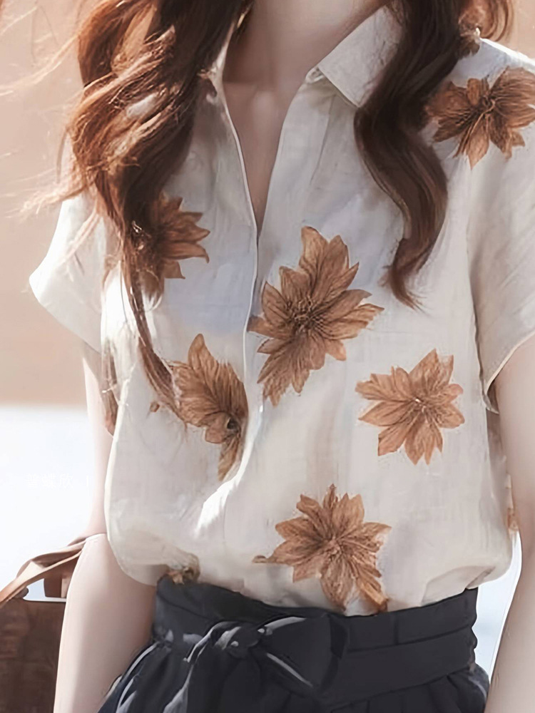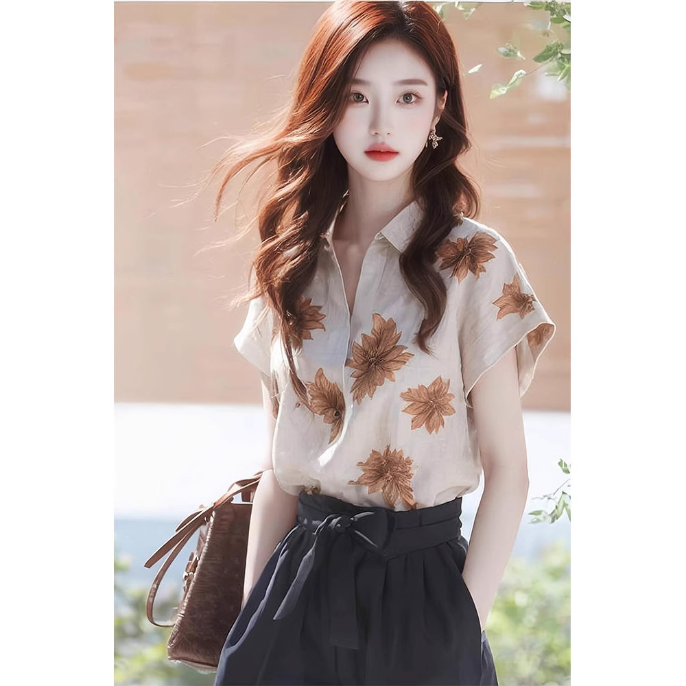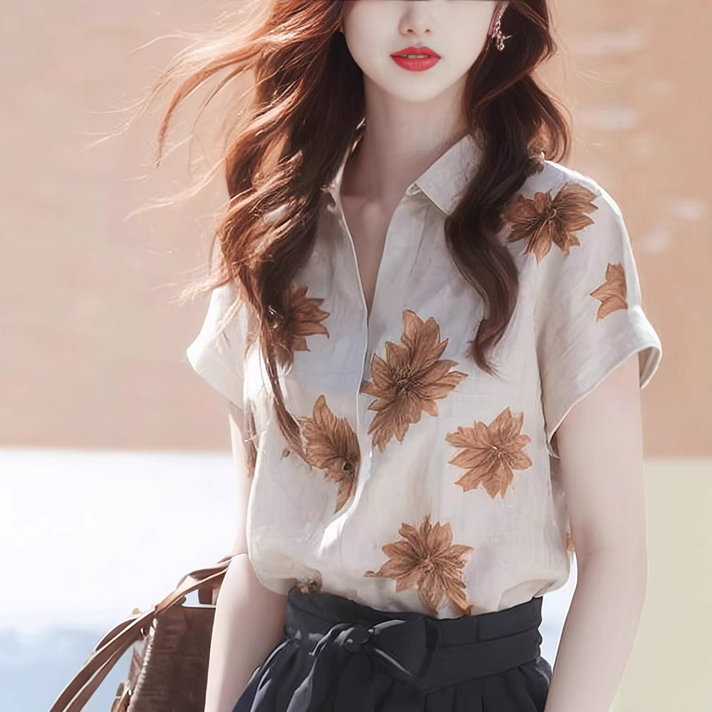 린넨 인쇄 폴로 칼라 짧은 소매 셔츠 여성 디자인 센스 틈새 독특한 여름 세련된 느슨한 얇은 탑