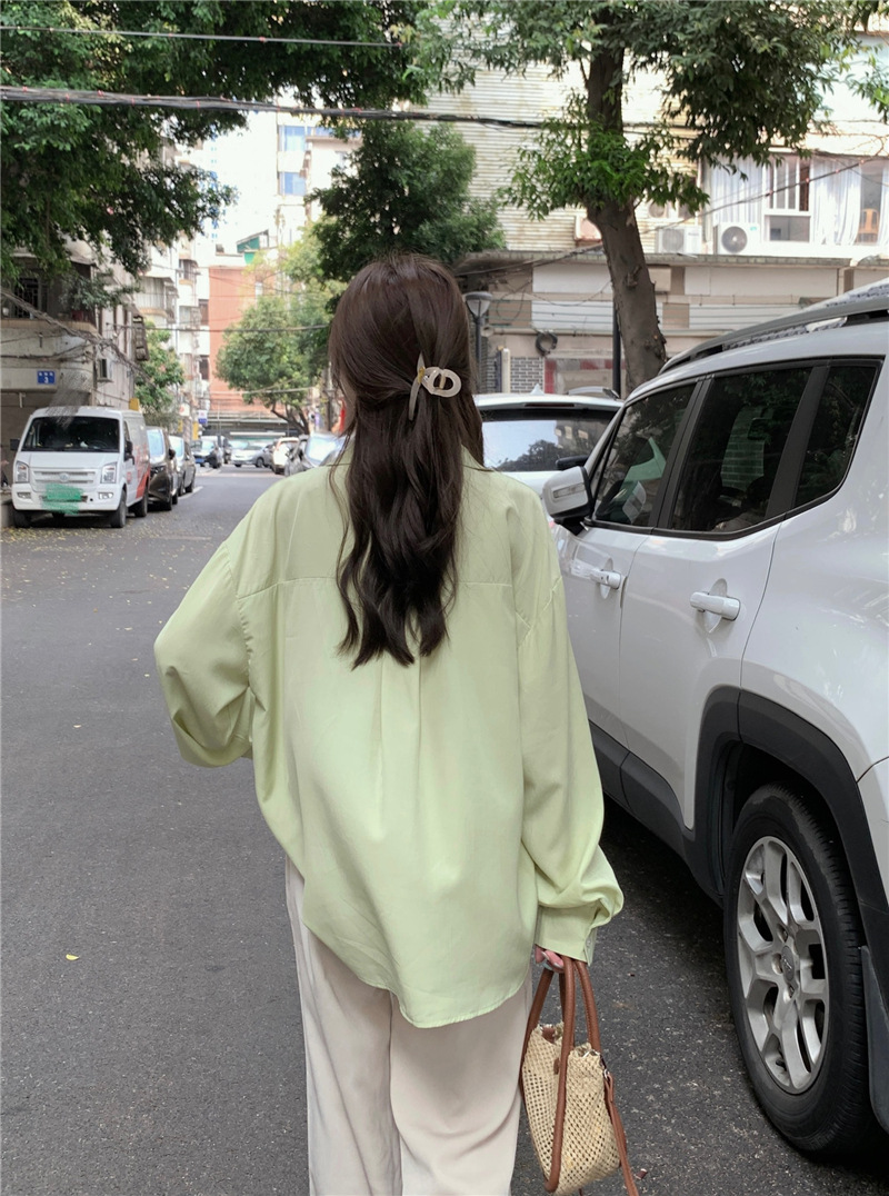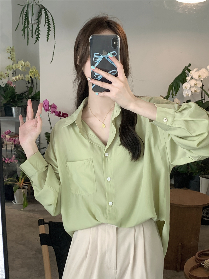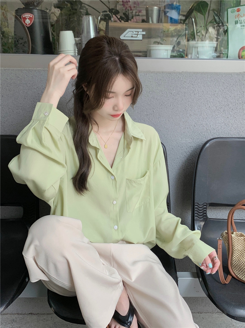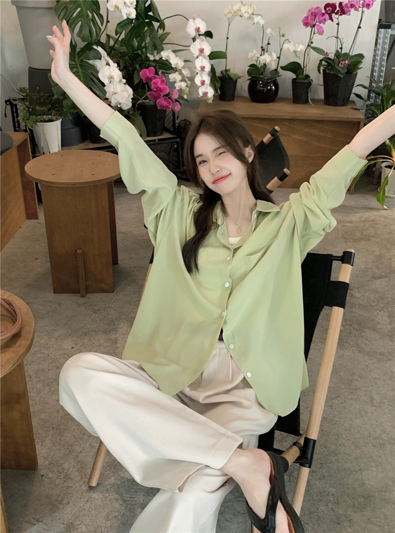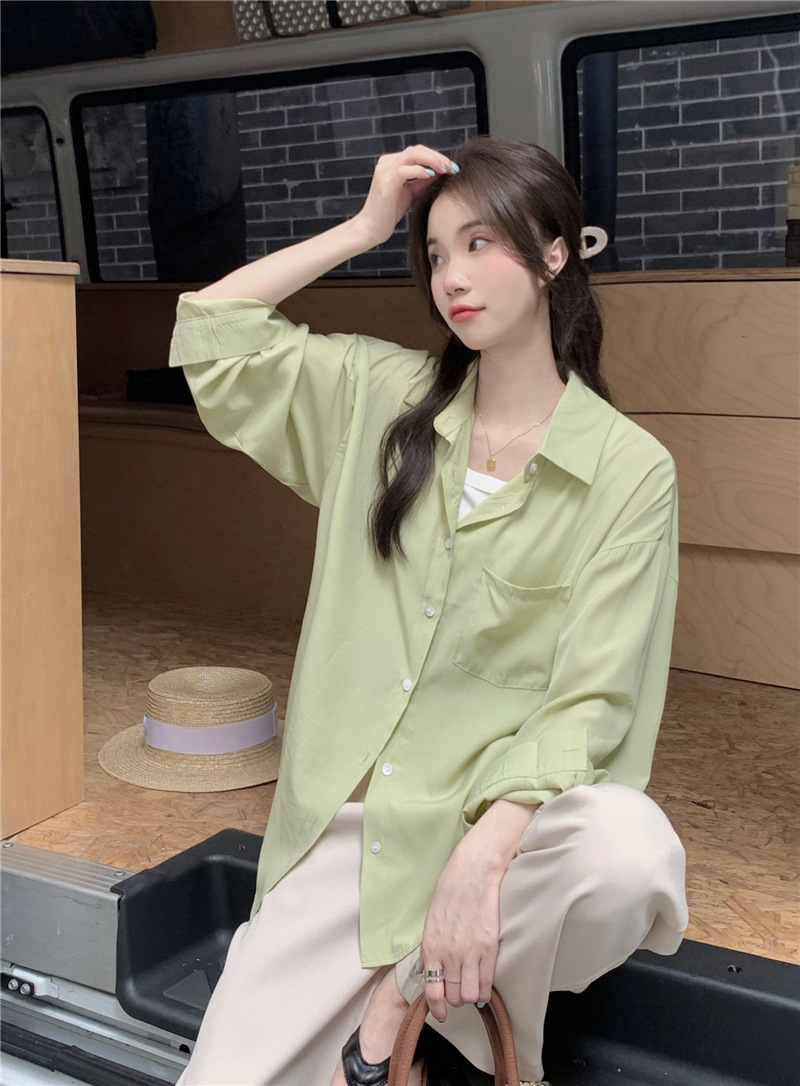 리얼 샷 그린 한국 스타일 느슨한 어깨 소매 디자인 센스 긴 소매 셔츠 여름 얇은 올 매치 선 스크린 셔츠