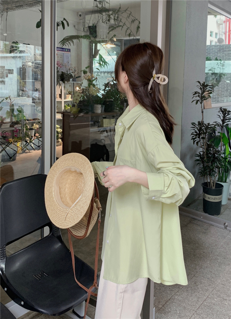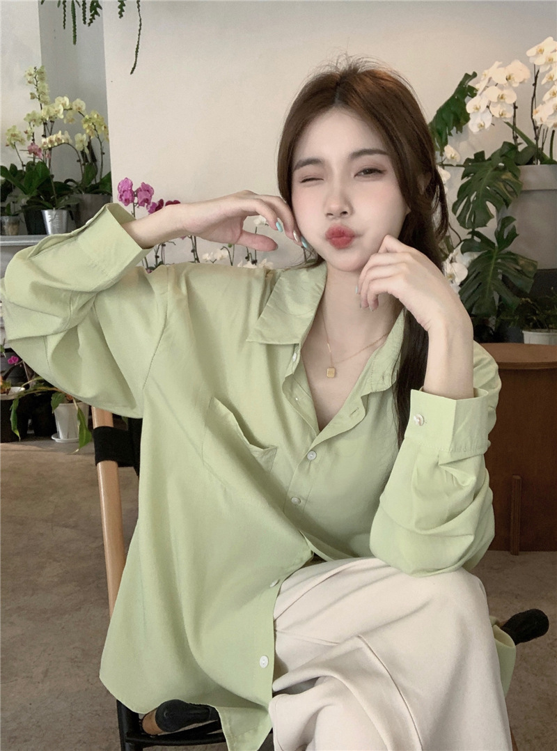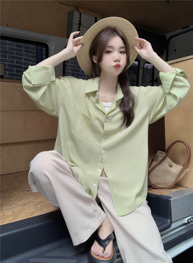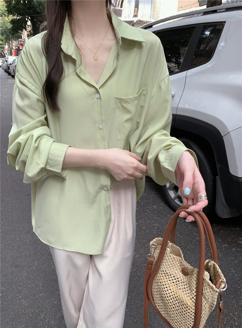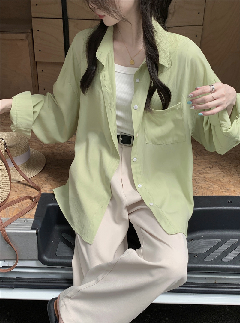 리얼 샷 그린 한국 스타일 느슨한 어깨 소매 디자인 센스 긴 소매 셔츠 여름 얇은 올 매치 선 스크린 셔츠스토어 가기