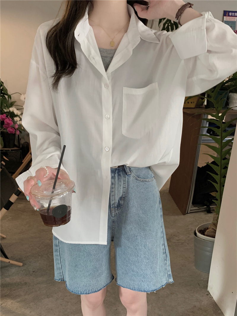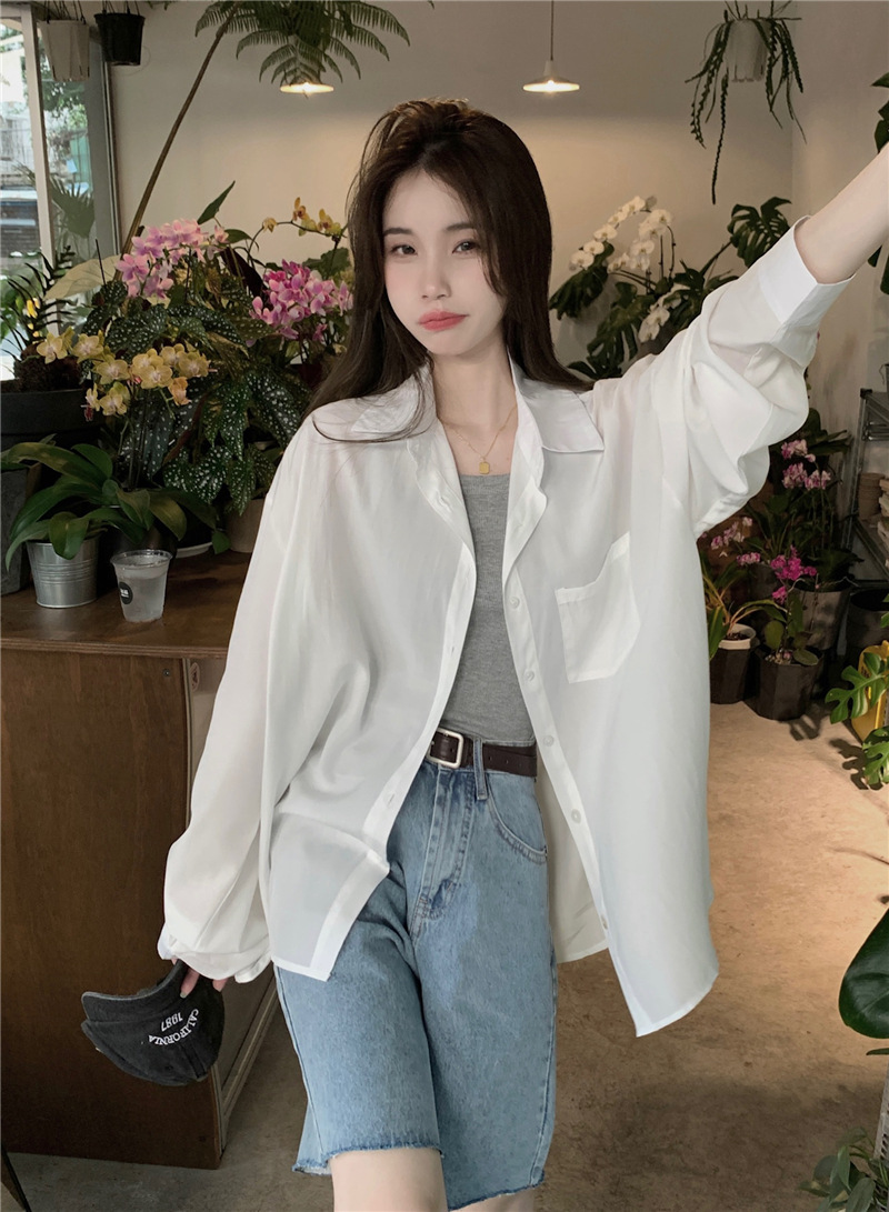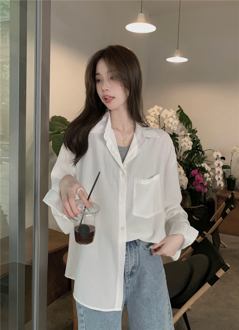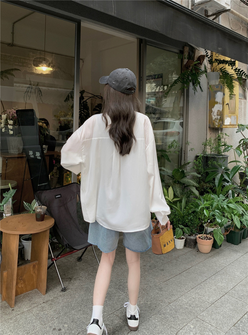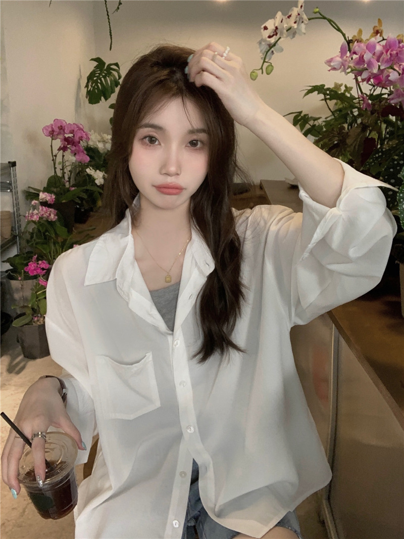 리얼 샷 그린 한국 스타일 느슨한 어깨 소매 디자인 센스 긴 소매 셔츠 여름 얇은 올 매치 선 스크린 셔츠스토어 가기