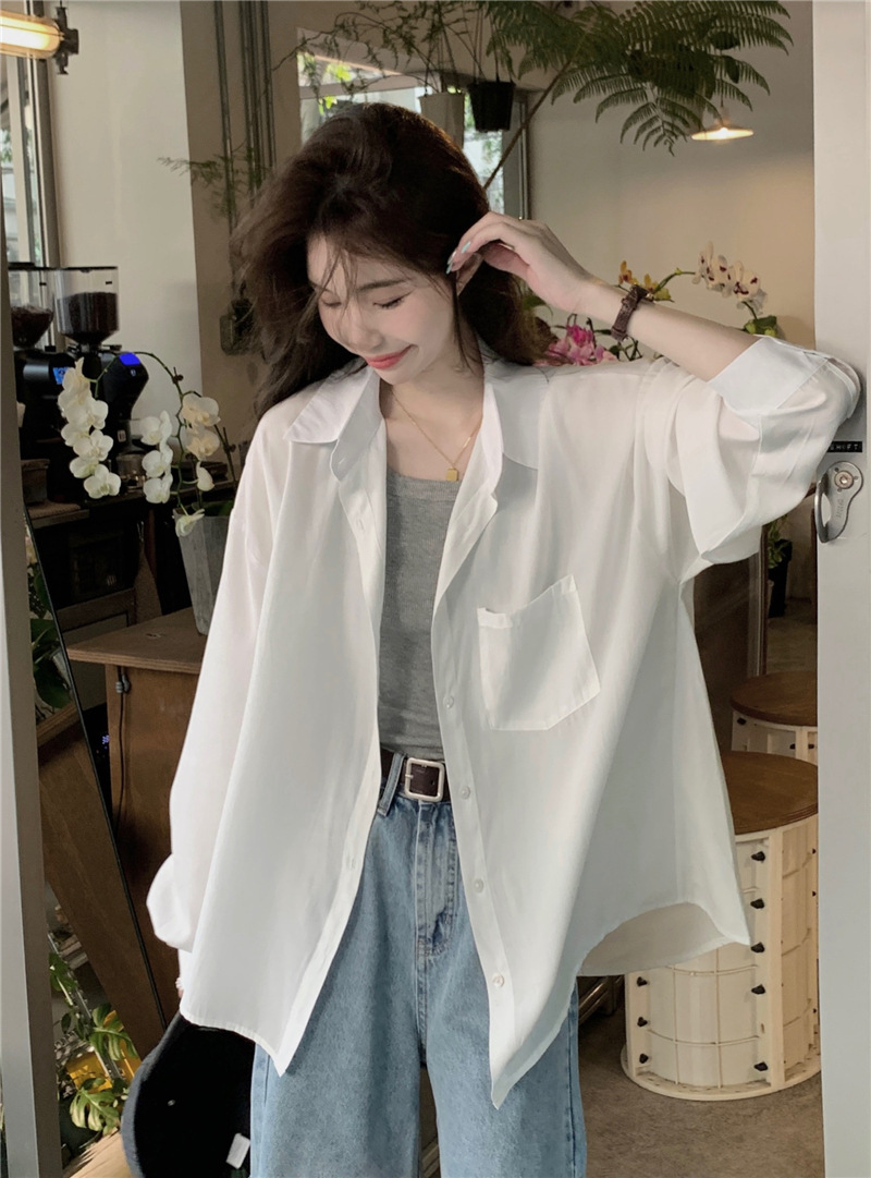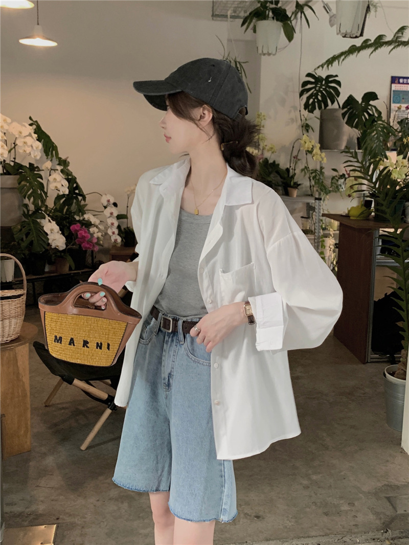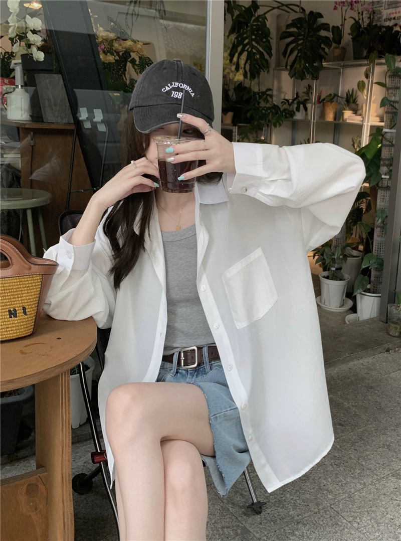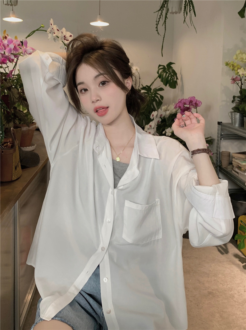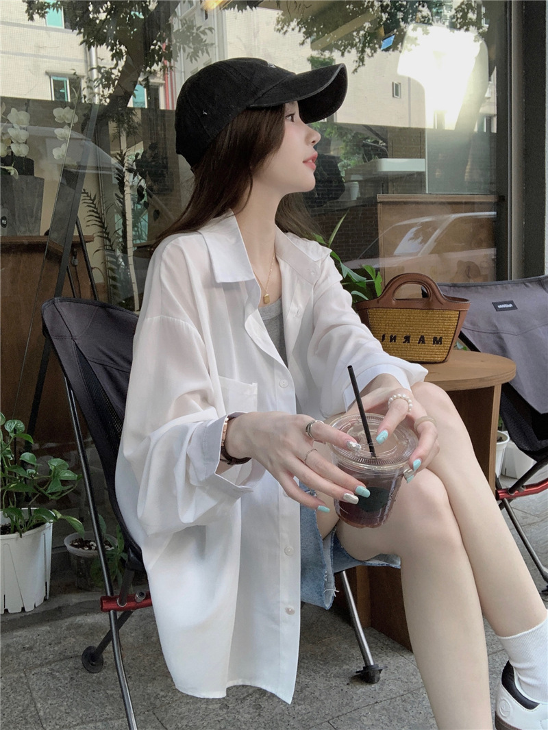 리얼 샷 그린 한국 스타일 느슨한 어깨 소매 디자인 센스 긴 소매 셔츠 여름 얇은 올 매치 선 스크린 셔츠스토어 가기