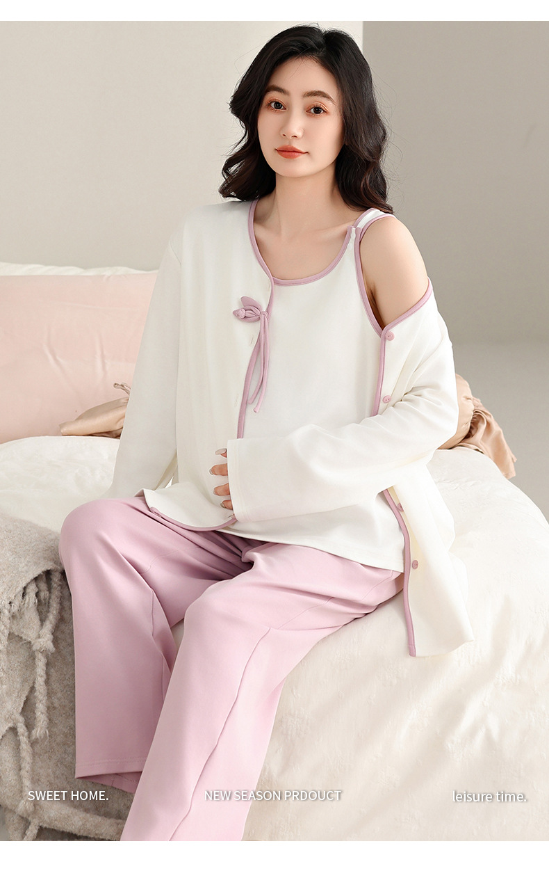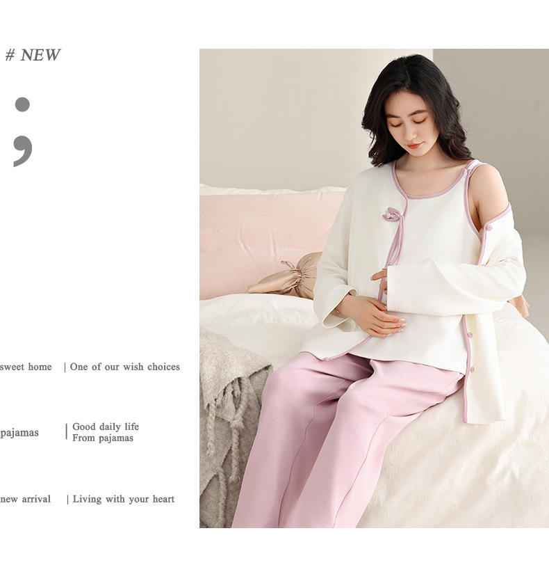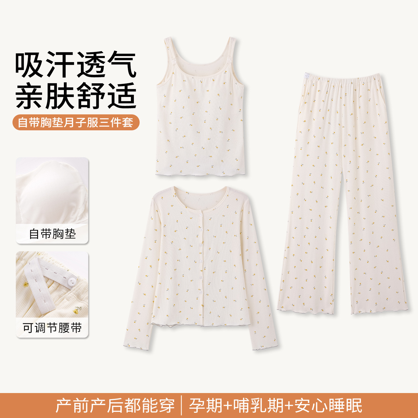 가슴 패드가 있는 순면 삼피스 세트 산후복 봄 가을 임산부 엄마 산후 수유 캐주얼 편안한 잠옷
