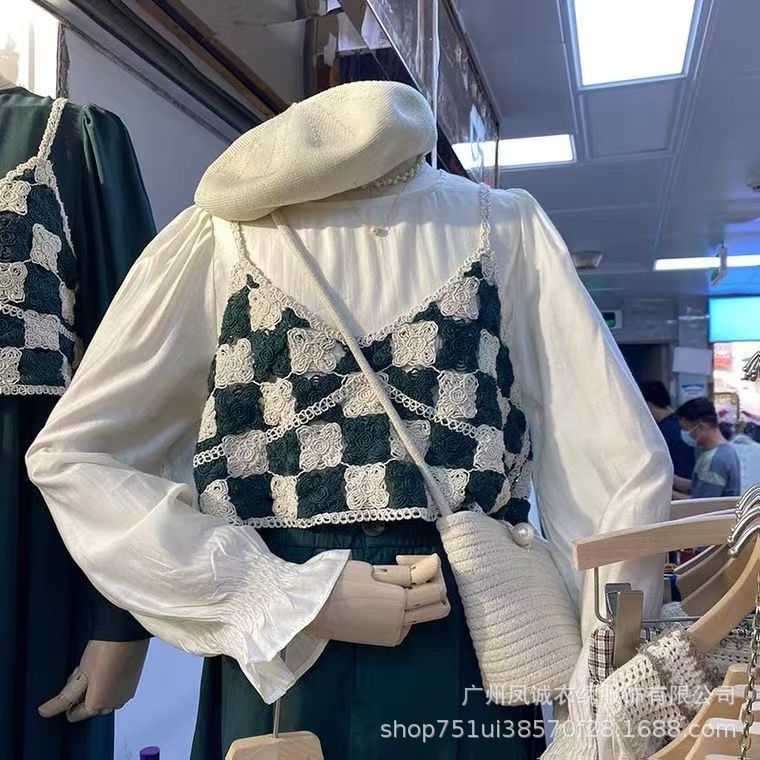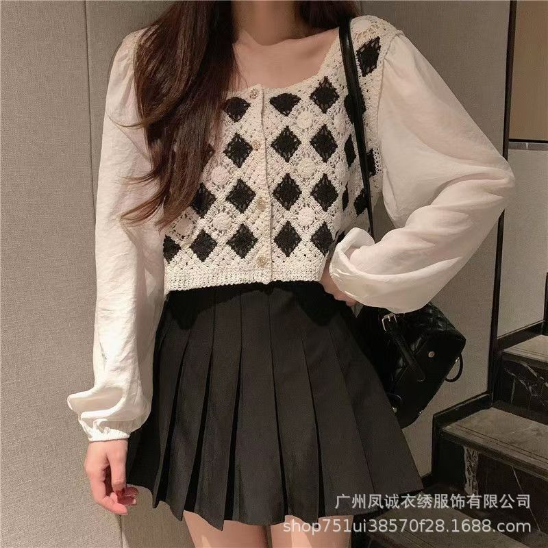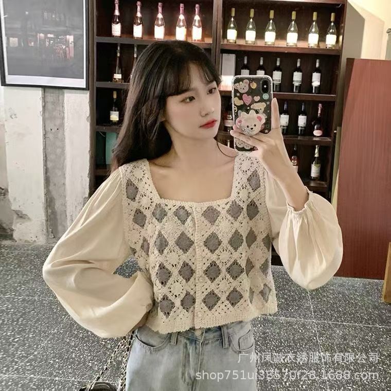 여성을 위한 프렌치 레트로 쉬폰 스플라이싱 스타일 셔츠, 틈새 자수 중공 스퀘어 넥 짧은 시크 탑스토어 가기
