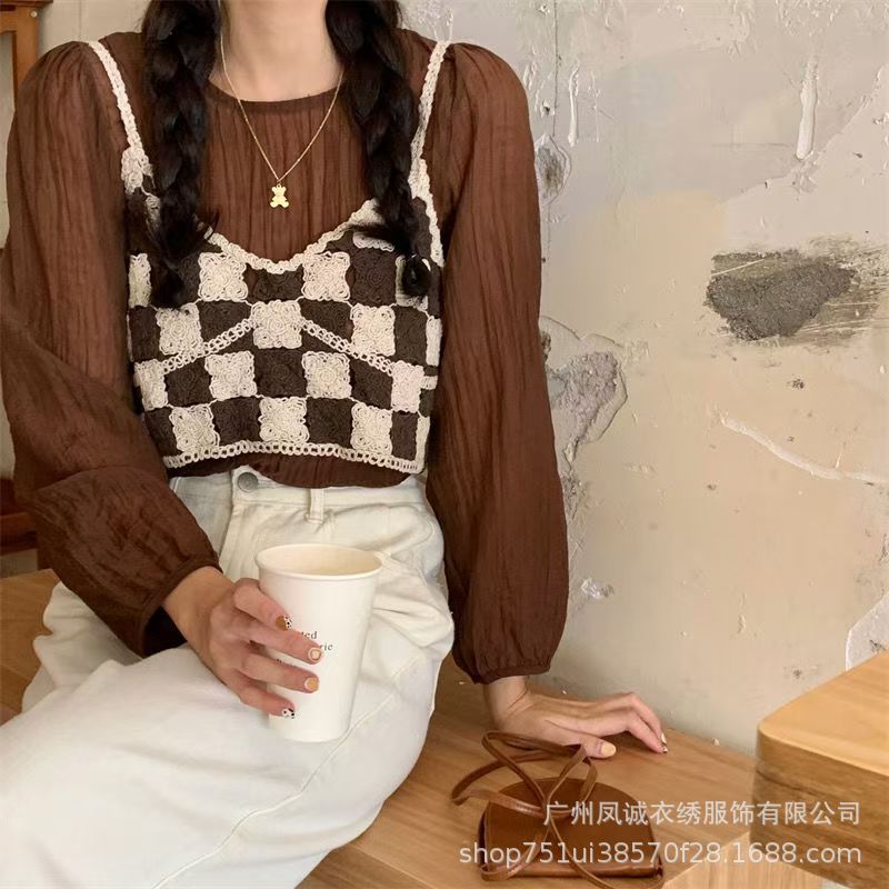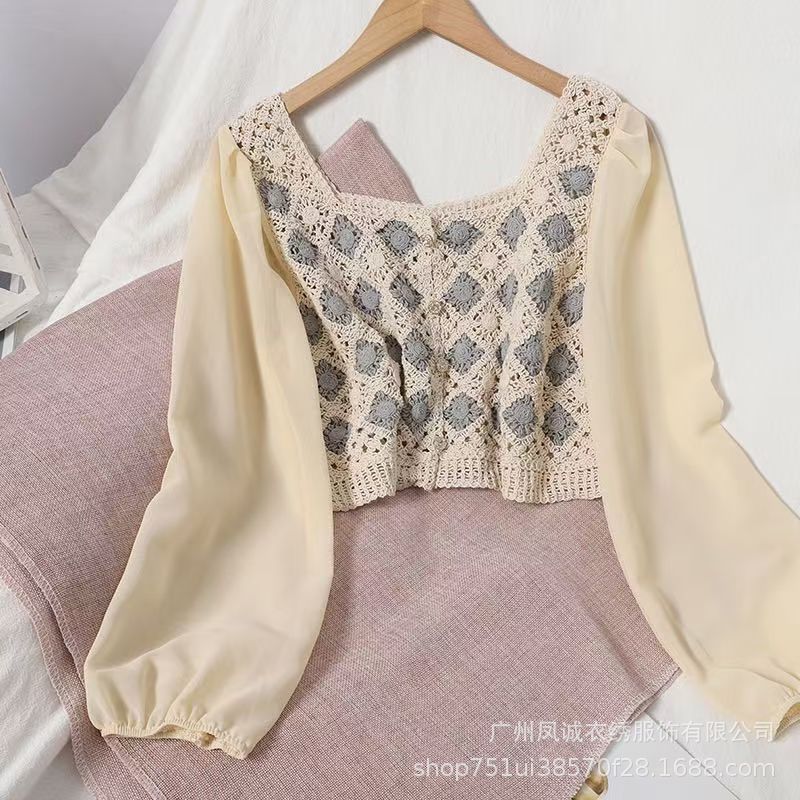 여성을 위한 프렌치 레트로 쉬폰 스플라이싱 스타일 셔츠, 틈새 자수 중공 스퀘어 넥 짧은 시크 탑
