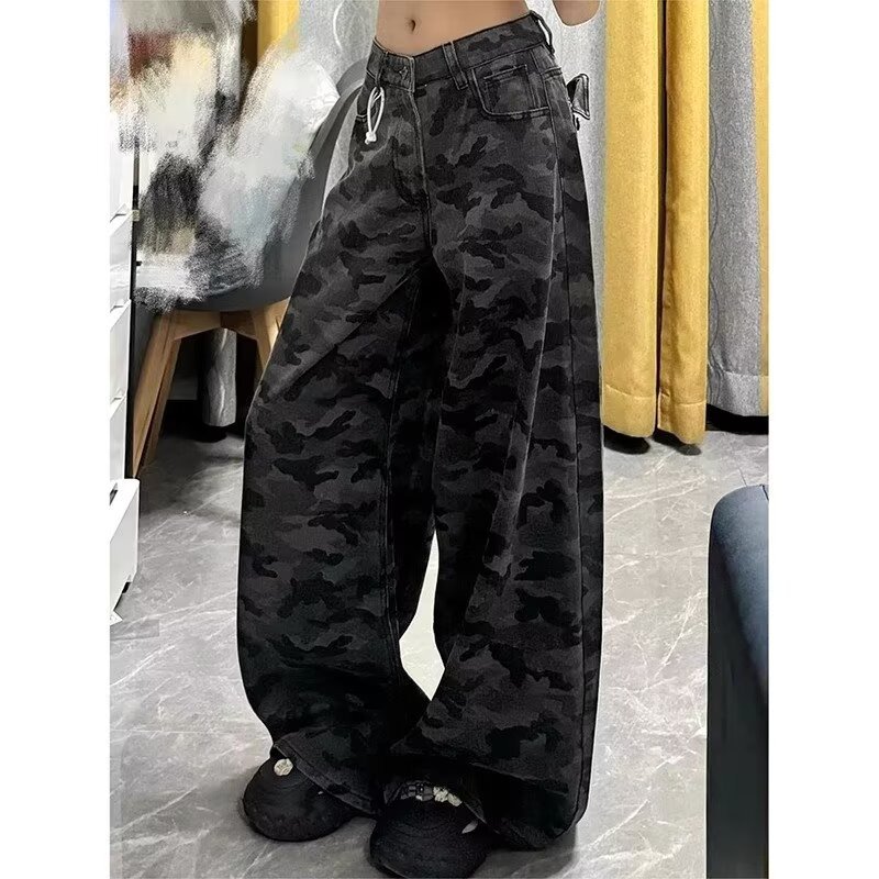 미국 위장 청바지 여성의 높은 허리 느슨한 스파이스 소녀 넓은 다리 스트레이트 다리 바지 캐주얼 유행 2025 여름 새로운 도착